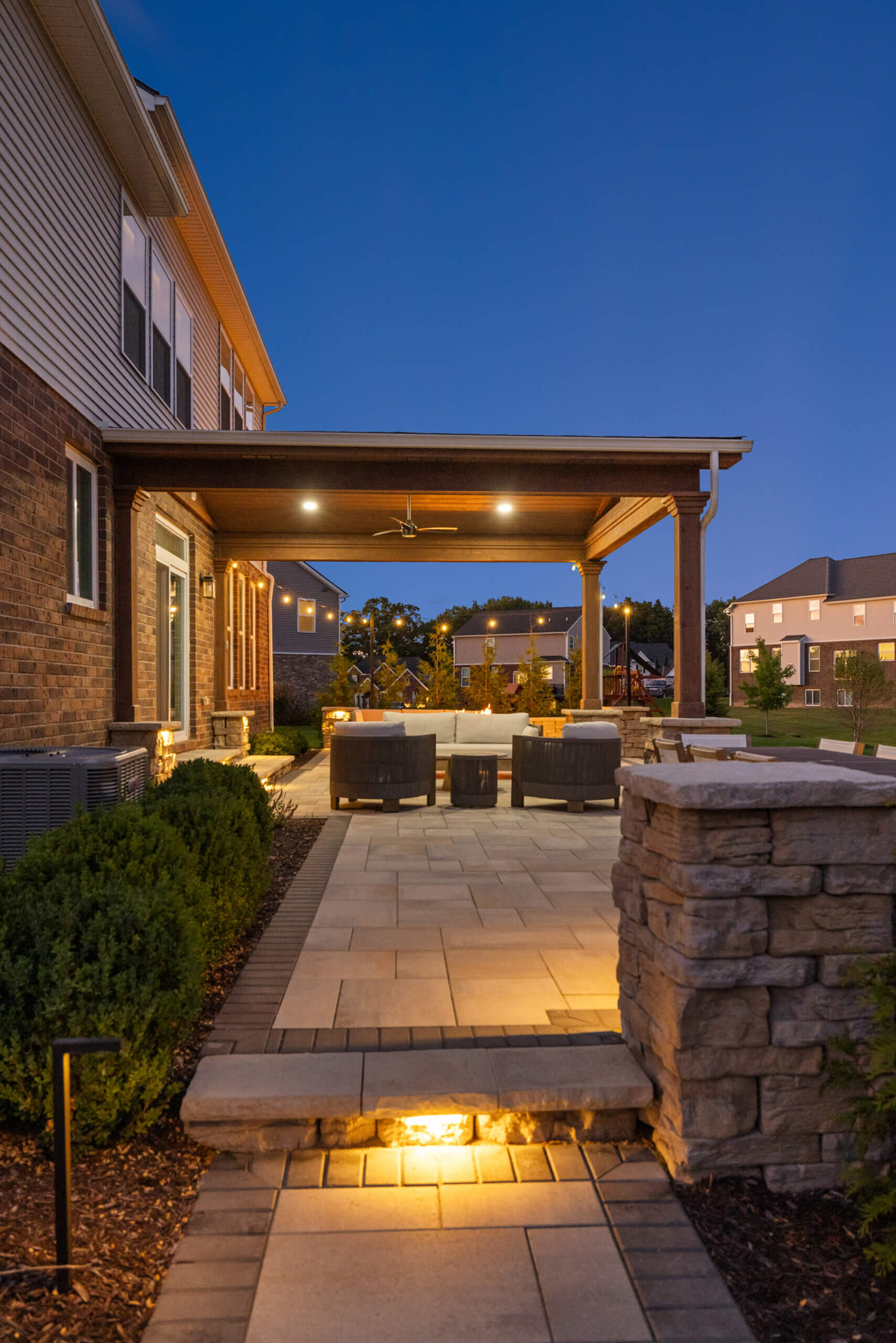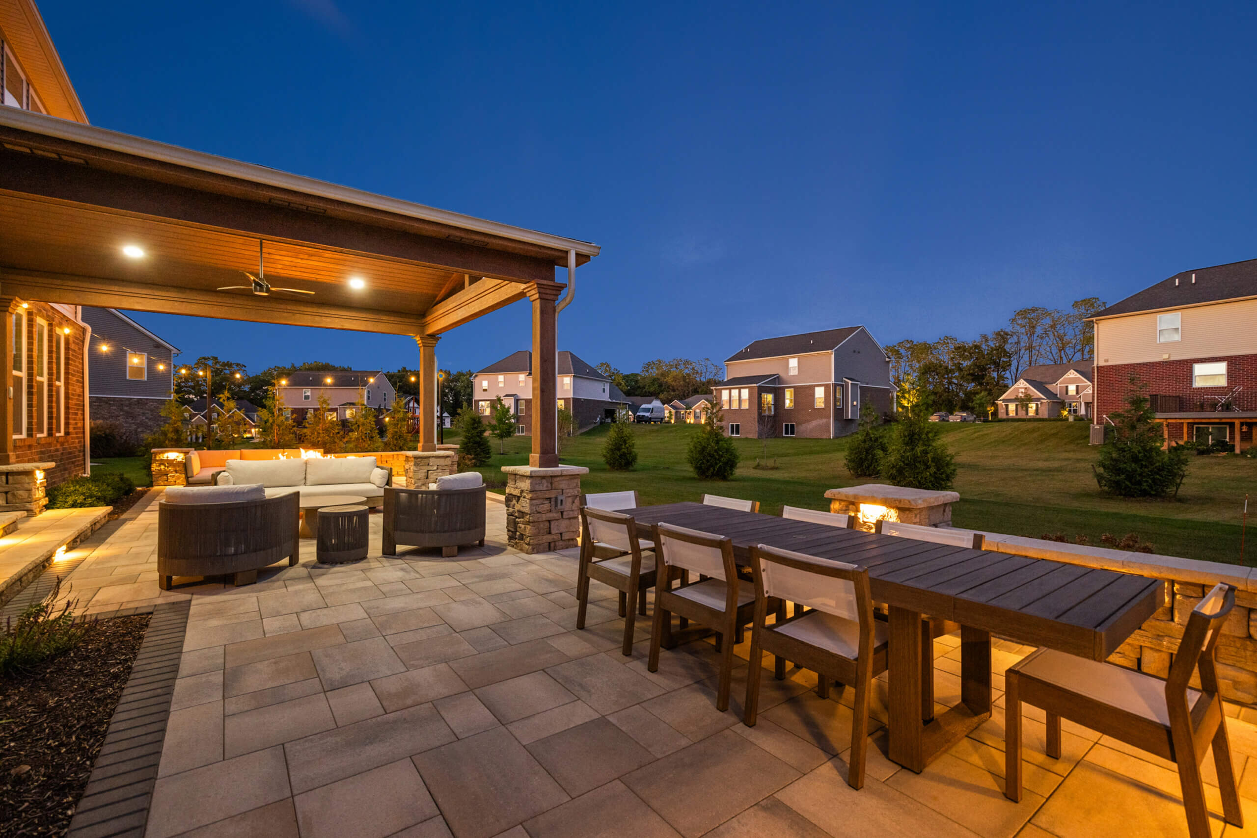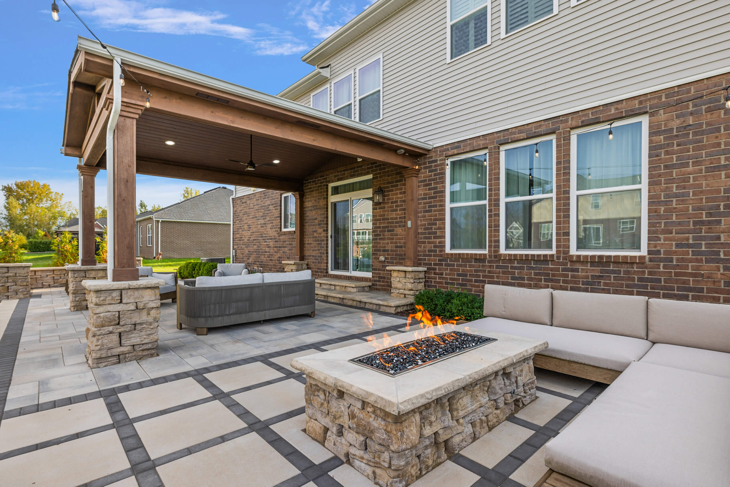 This elevated space was built by our team, your trusted custom brick landscapers in Oakland Twp, MI! We fully transformed this stunning home with a complete front and backyard landscape design. Nestled within Oakland Township, this paver transformation features a charming gazebo structure, perfect for relaxation and entertaining, accent stone pillars and seat walls added both for beauty and functionality, and a gas fire feature that provides a cozy gathering area for any evening. The elegant brick paver slab patio offers a sophisticated connected space, and a thoughtfully designed brick paver walkway seamlessly connects different areas of the home. We finished this brick paver project by placing outdoor lighting strategically among the patio and front landscape, providing a warm glow. Let’s get started as your custom brick landscapers, REACH OUT!