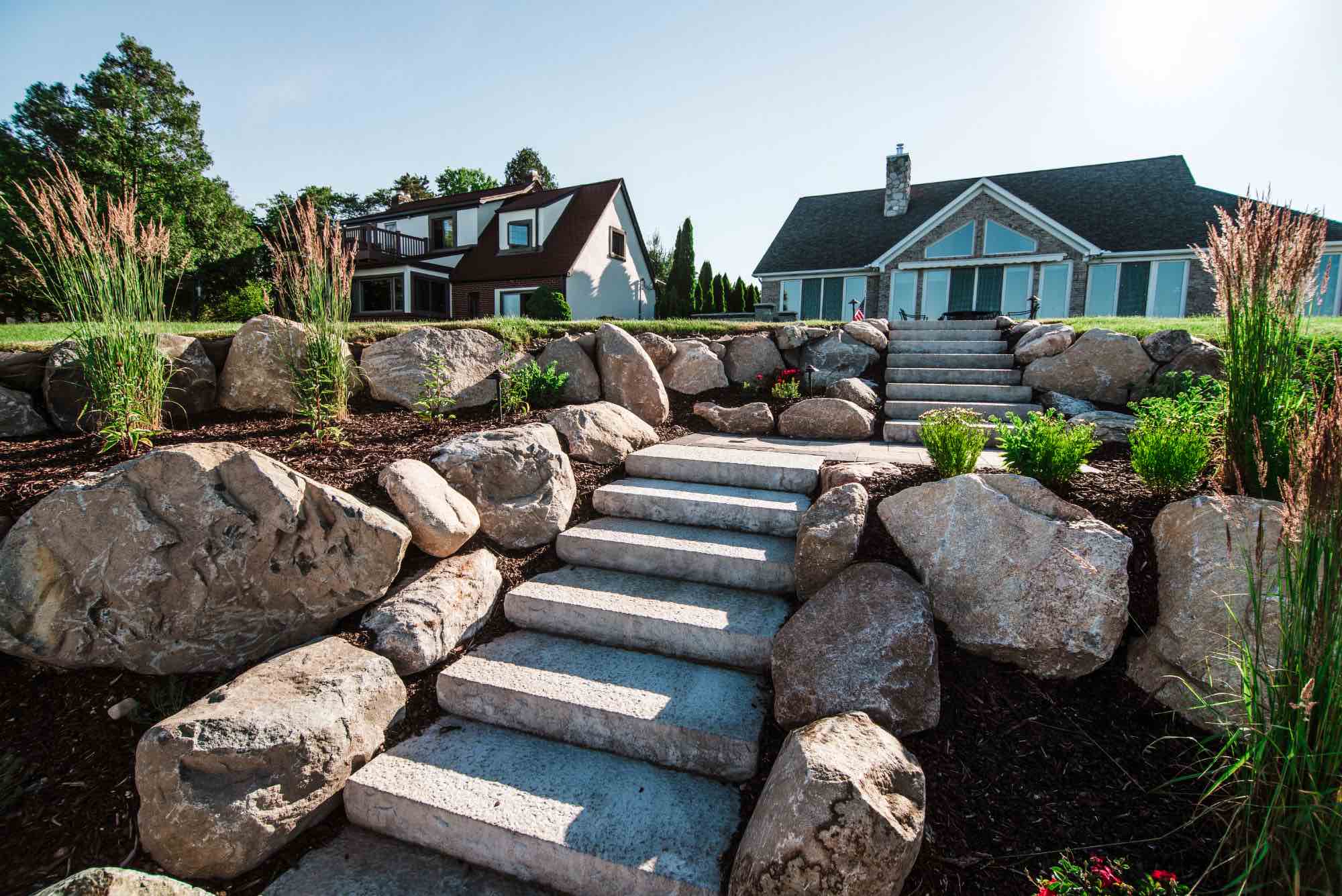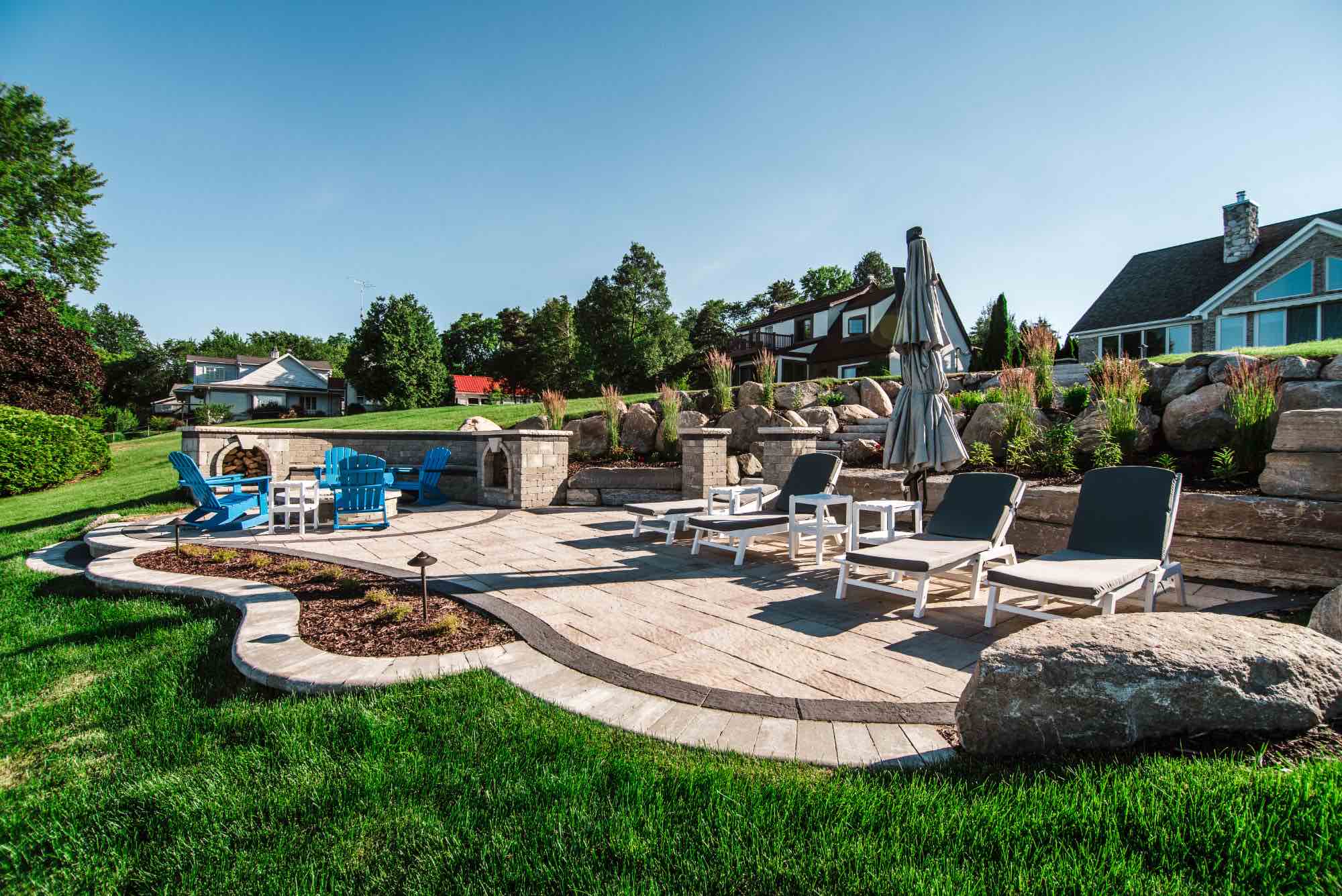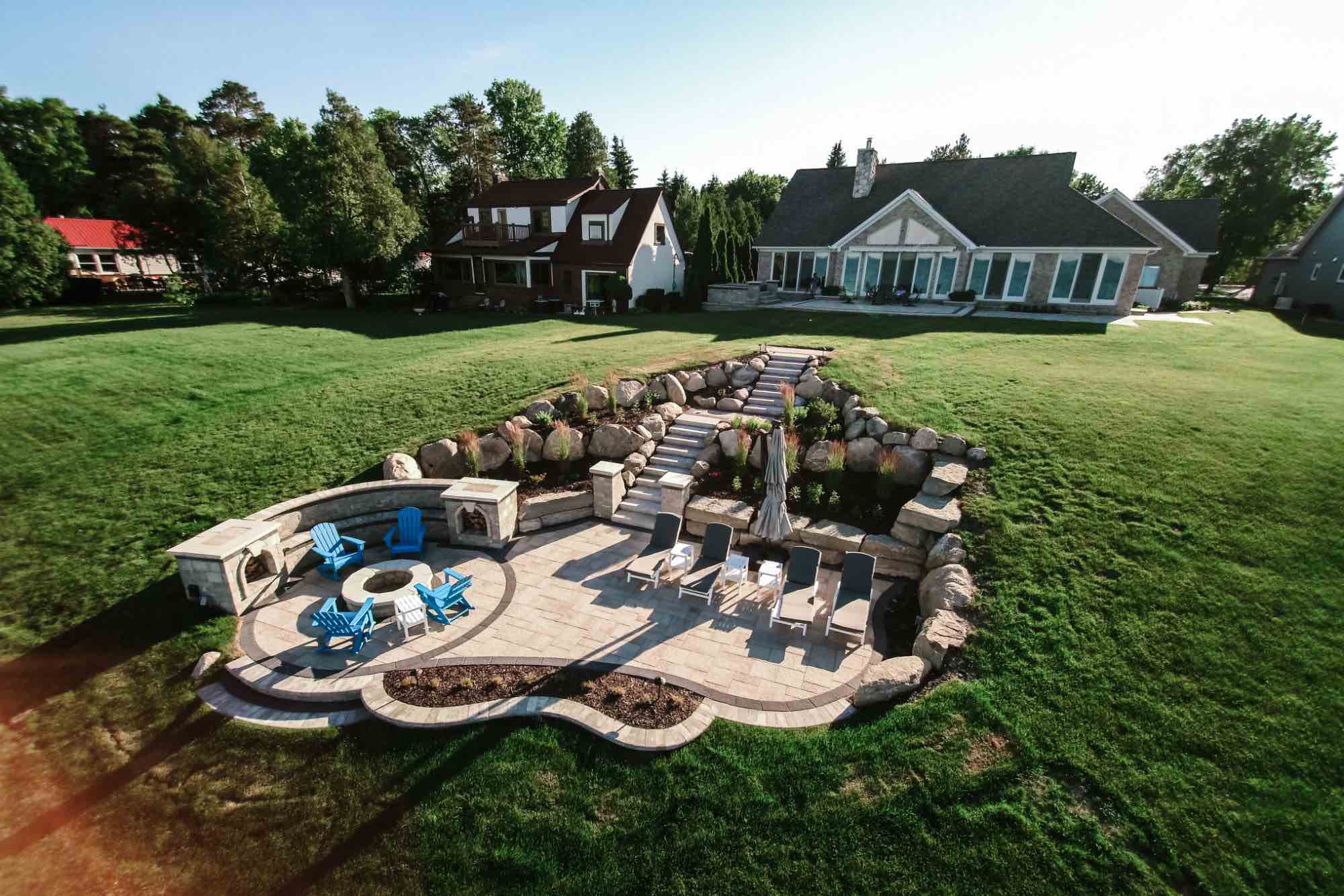 Check out this enchanting backyard paving in Fort Gratiot Township, Michigan. Antonelli Landscape Pool & Spa was called to transform this lakefront home, creating a refreshed living space, and allowing entertainment space for lakeside fun. The idea was to be able to combine the two different levels of the home, by working with the natural hillside and installing brick paver steps and Michigan fieldstone boulders to compliment the natural space. We also designed and installed two custom patios with a built-in spa, using Oaks Pavers Rialto in Milano and Oaks Pavers Rialto in Onyx. The final touch to this backyard design was the custom fire pit, creating the most cozy lakefront backyard entertainment space. Let’s get started on your Michigan hardscape design, CONTACT US for backyard paving today!