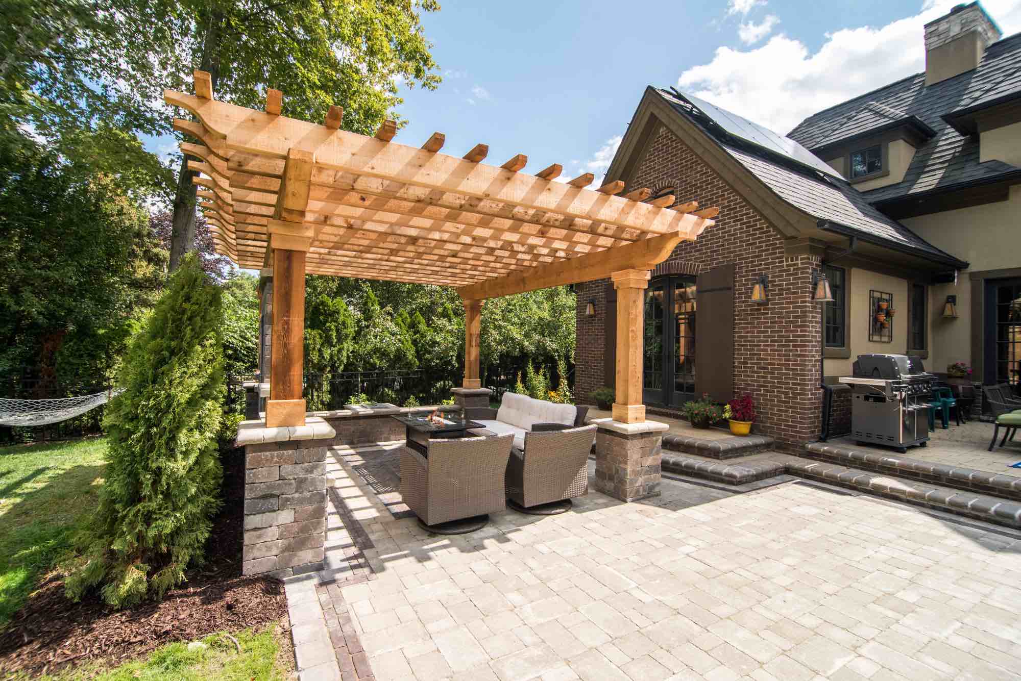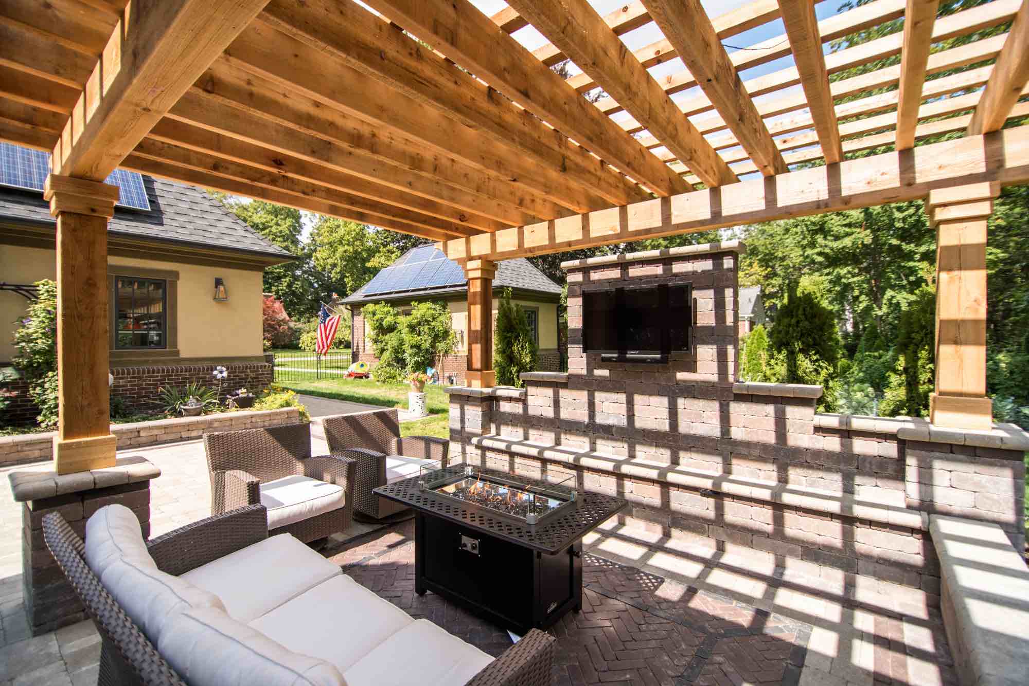 A custom pergola & gazebo in Beverly Hills, Michigan can be the perfect statement piece to your backyard design. Both a pergola, gazebo, or any other shade structure is a fully customizable build, meaning we can build it as compact or as large as you desire. The homeowners wanted a cedar pergola that can be a place to relax and entertain without direct sunlight ruining the fun. The brick pavers used in this landscape design were Unilock Brussels in Sandstone and herringbone paver patterns in Unilock Copthorne in Burgundy Red to accent the warm house colors. The idea in this design was to keep the look of the old-styled home but allowing for outdoor living in a modern way, adding fire features, seat walls, and a beautiful brick tv wall. A bonus was the Lion outdoor ice chest, great for a refreshing evening. CONTACT US for your custom pergola & gazebo!