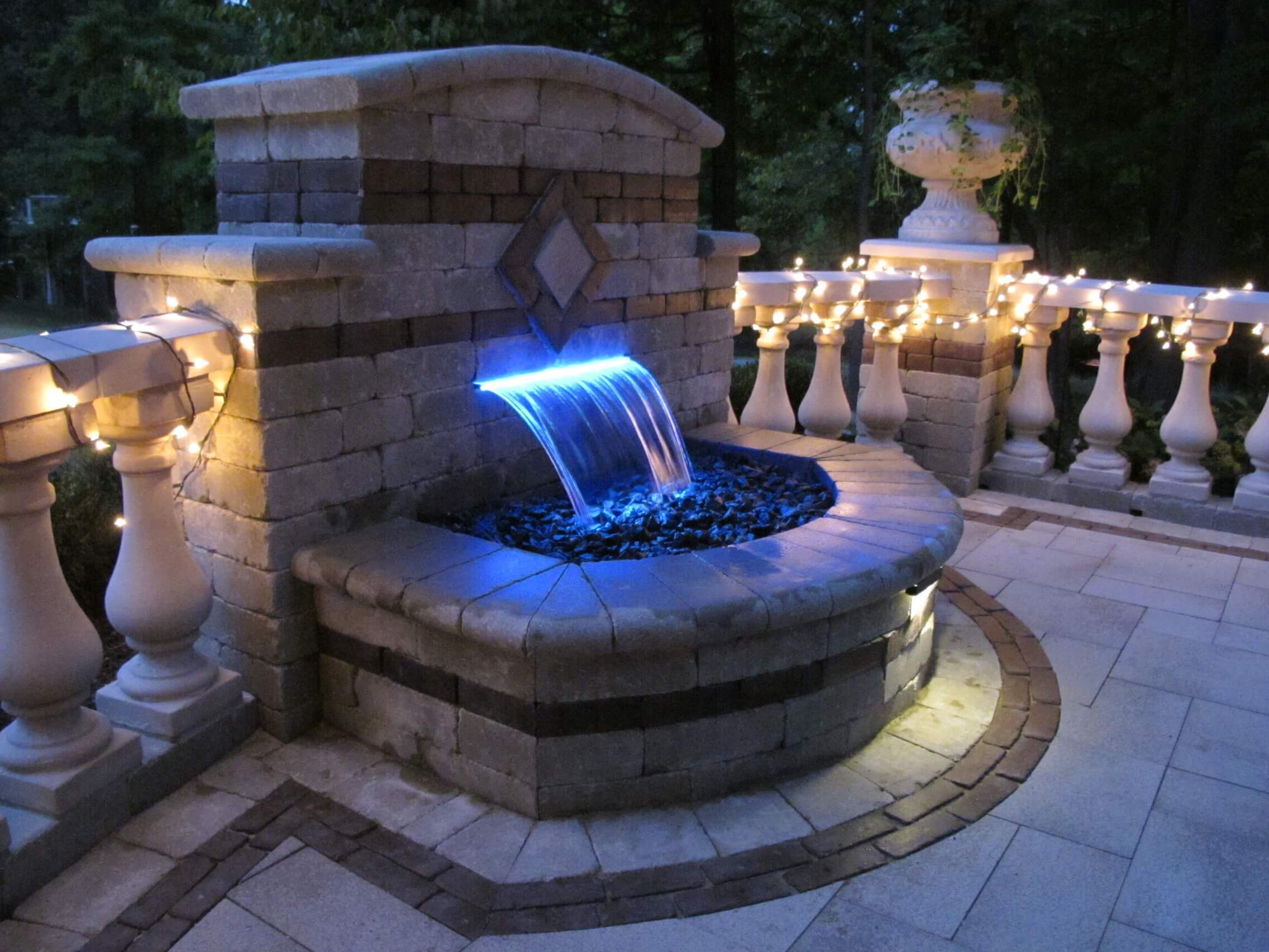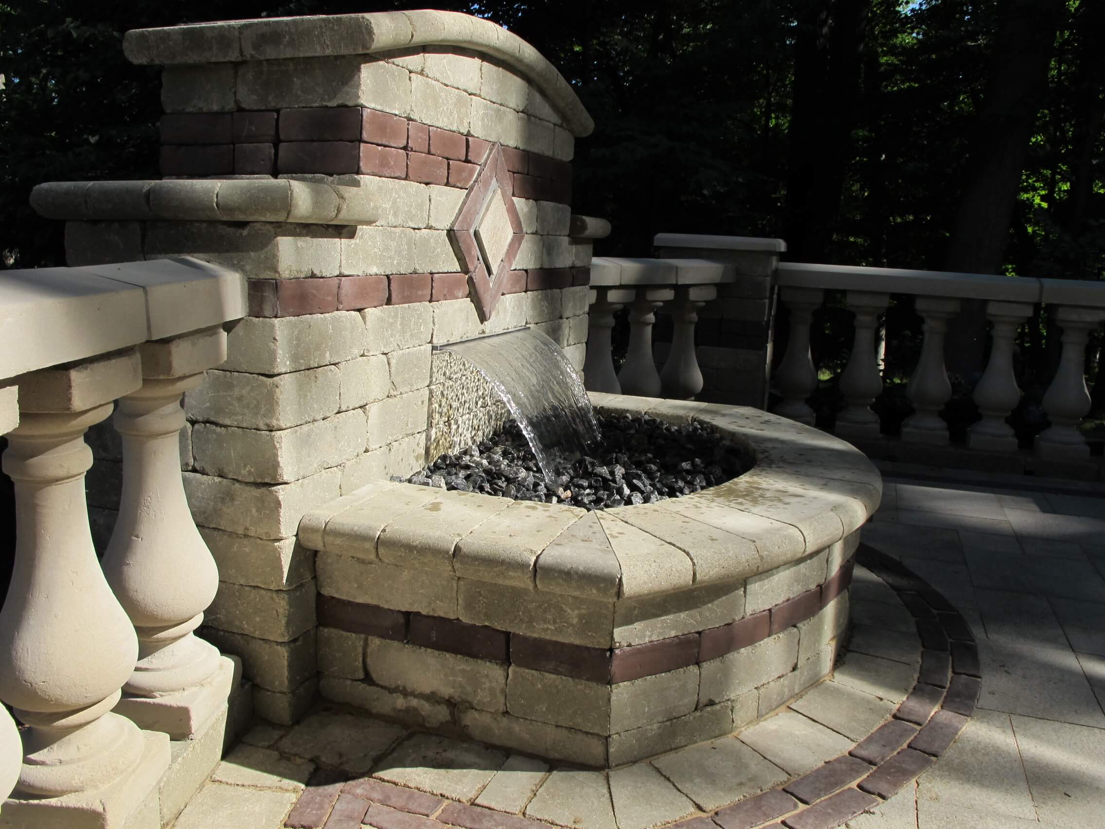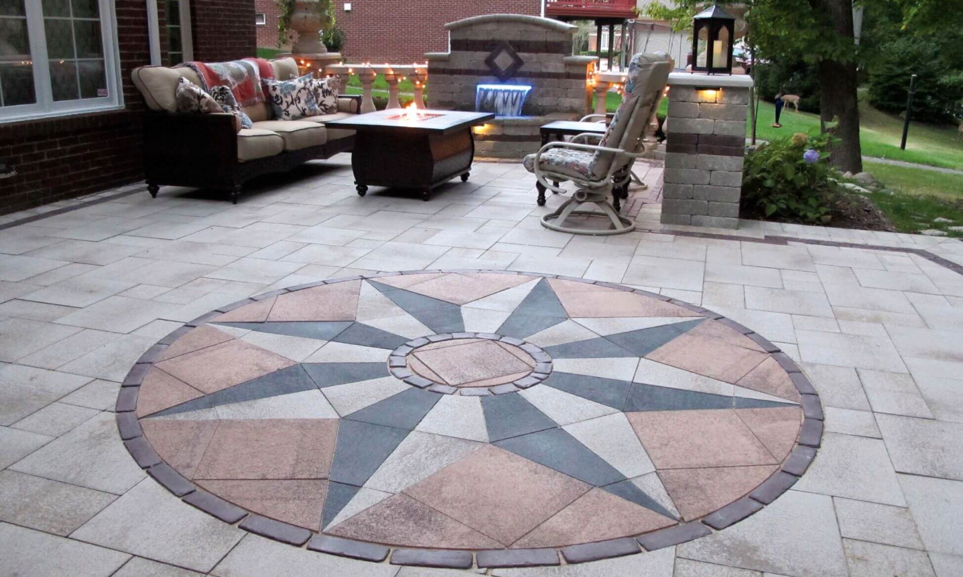 This brick paving and fountain design in Rochester Michigan followed Tuscan-inspired landscape design, and was made for families in all stages of life. The homeowners wanted to update the neglected area adjacent to their walkout basement and create a warm entertaining area. We installed modern pavers, built with a low-maintenance fountain, and a tuscan-inspired paver insert. Antonelli installed paving design that united the lower portion of the yard to the deck above. Neat brick columns and concrete baluster walls define the edges of the space, and add definition. As the sun sets, built-in landscape lighting accents the pavers with a warm glow. The pavers include Unilock Umbriano in Summer Wheat, with Copthorne in Burgundy Red. The combination of features create a visually and functionally exciting living space. CALL US for your patio design!