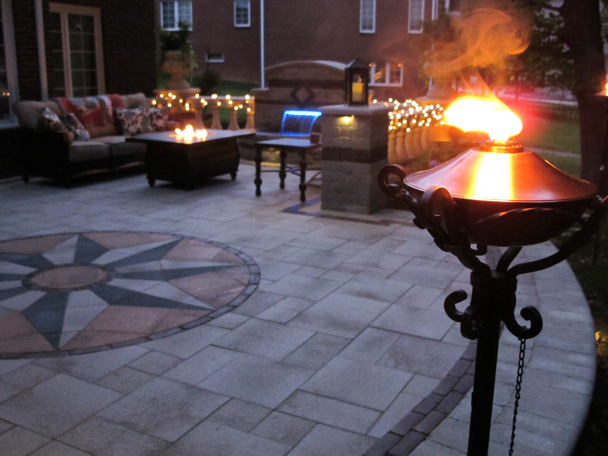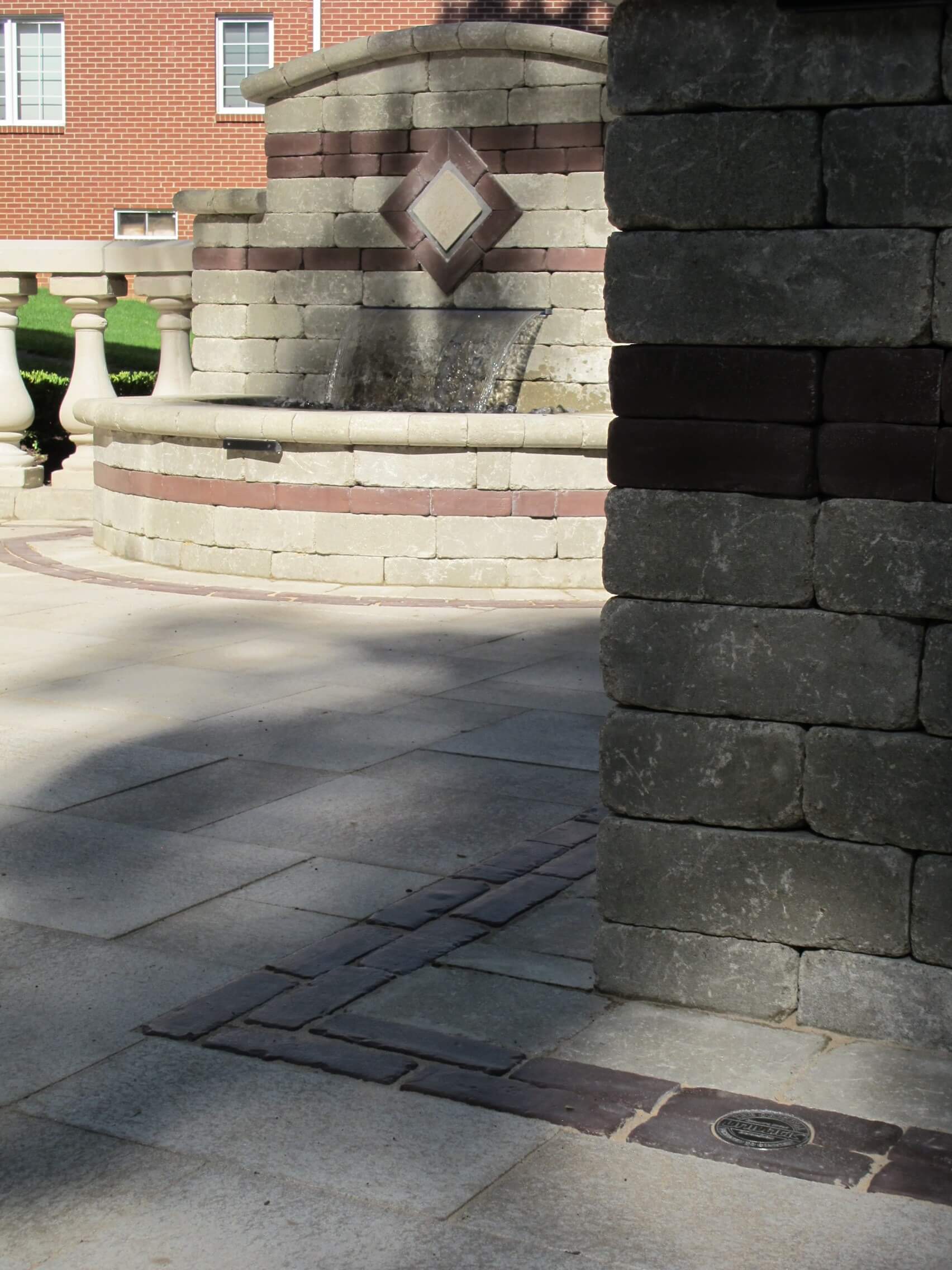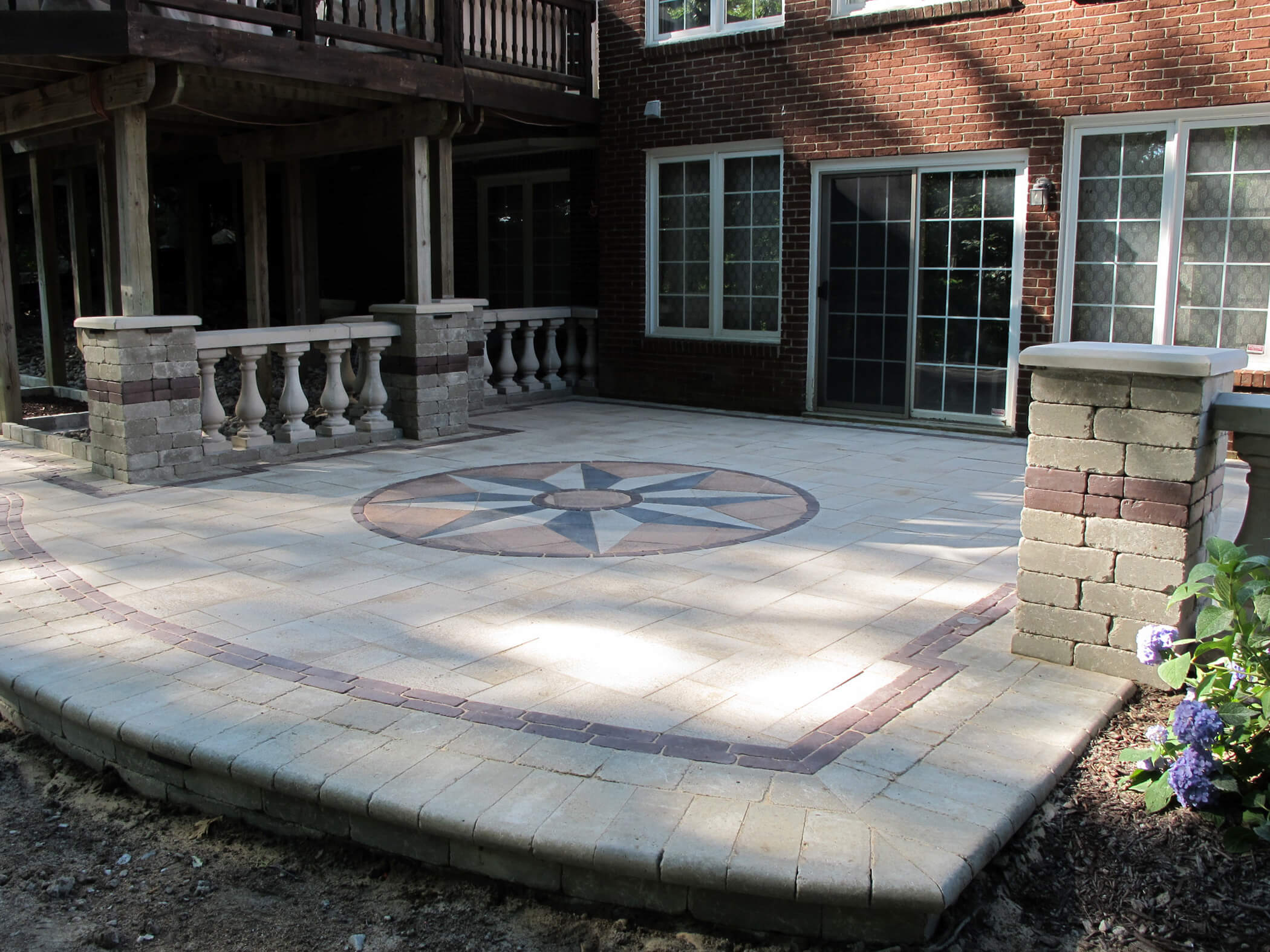 This brick paving and fountain design in Rochester Michigan followed Tuscan-inspired landscape design, and was made for families in all stages of life. The homeowners wanted to update the neglected area adjacent to their walkout basement and create a warm entertaining area. We installed modern pavers, built with a low-maintenance fountain, and a tuscan-inspired paver insert. Antonelli installed paving design that united the lower portion of the yard to the deck above. Neat brick columns and concrete baluster walls define the edges of the space, and add definition. As the sun sets, built-in landscape lighting accents the pavers with a warm glow. The pavers include Unilock Umbriano in Summer Wheat, with Copthorne in Burgundy Red. The combination of features create a visually and functionally exciting living space. CALL US for your patio design!