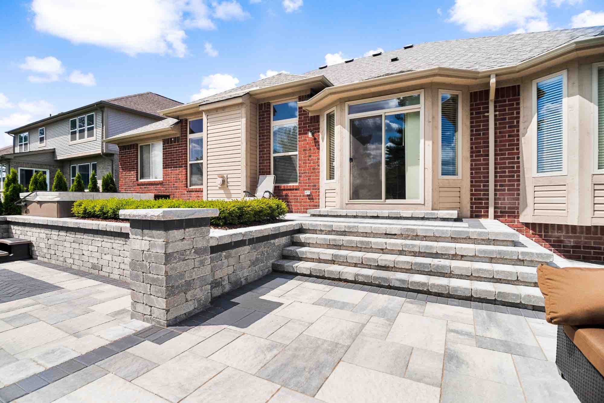 The Antonelli team had the task to transform a small yard into a simple masterpiece with patio paving & fire features in Shelby Township, Michigan. The homeowners wanted to utilize their smaller yard with useful patio space, allowing for relaxing outdoor living. The challenge was to work with the elevation on the property, so we decided to design a tiered upper patio and a lower patio lounge area. The vision was to include a built-in spa at the first level patio, and a lounge area with fire features at the second level. The brick patio design features Oaks Rialto in Marble Grey, while the lower patio fire table includes Oaks Laredo in Greystone with Classic Paver Onyx accents. Simple yet elegant can go a long way in this patio paving design, making this split-level patio the most relaxing landscape design project in Shelby Twp, Mi. CONTACT US today for your patio paving & fire features design!