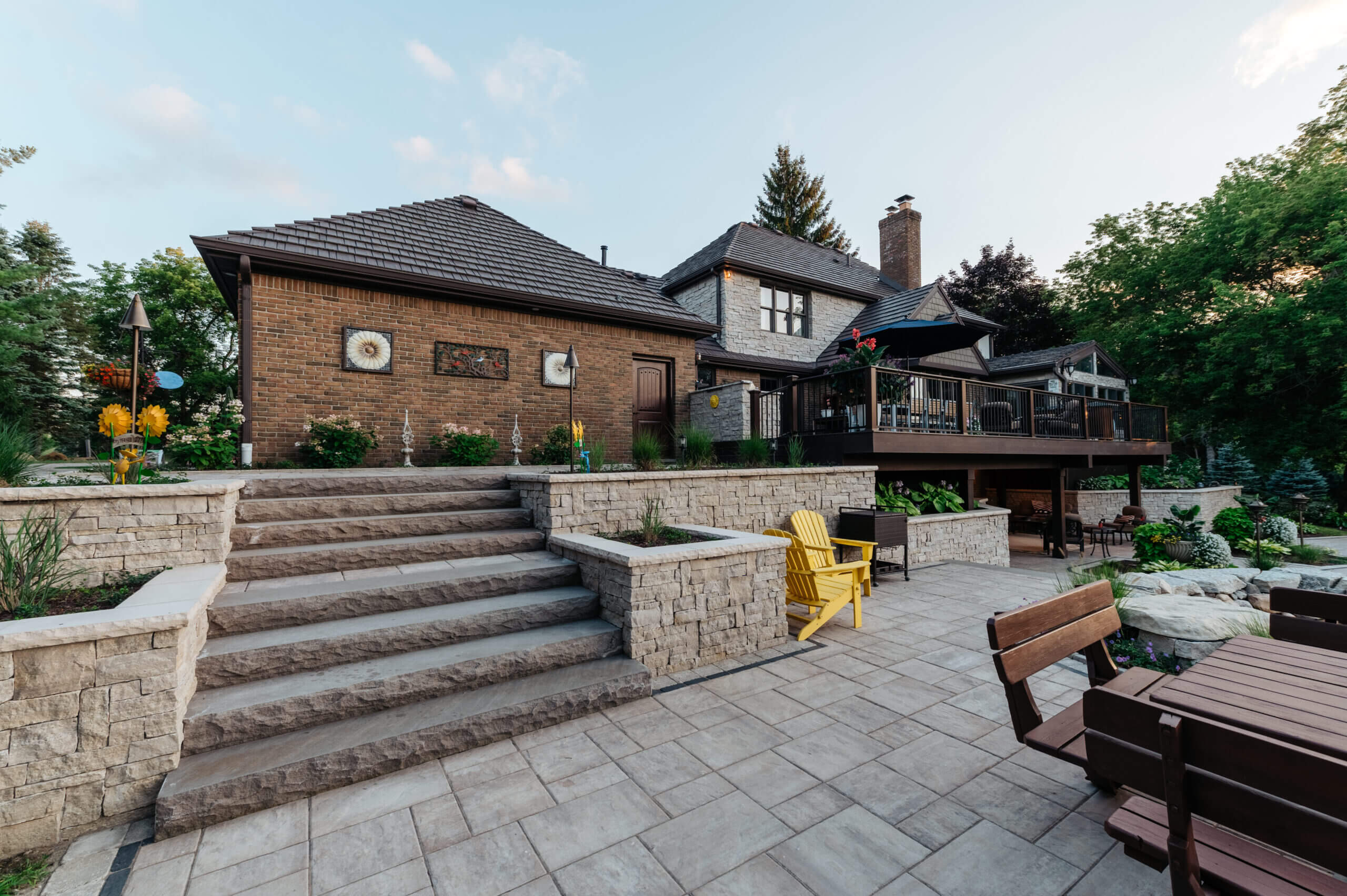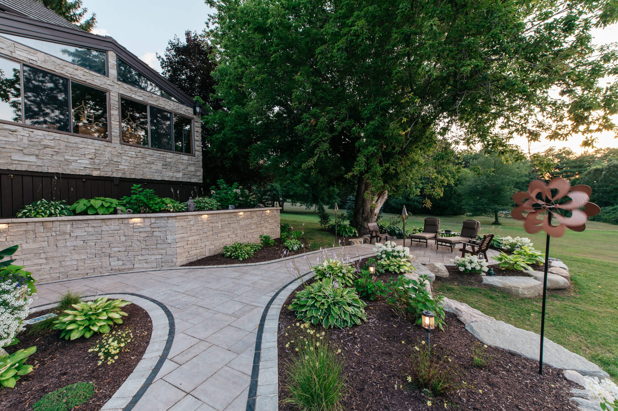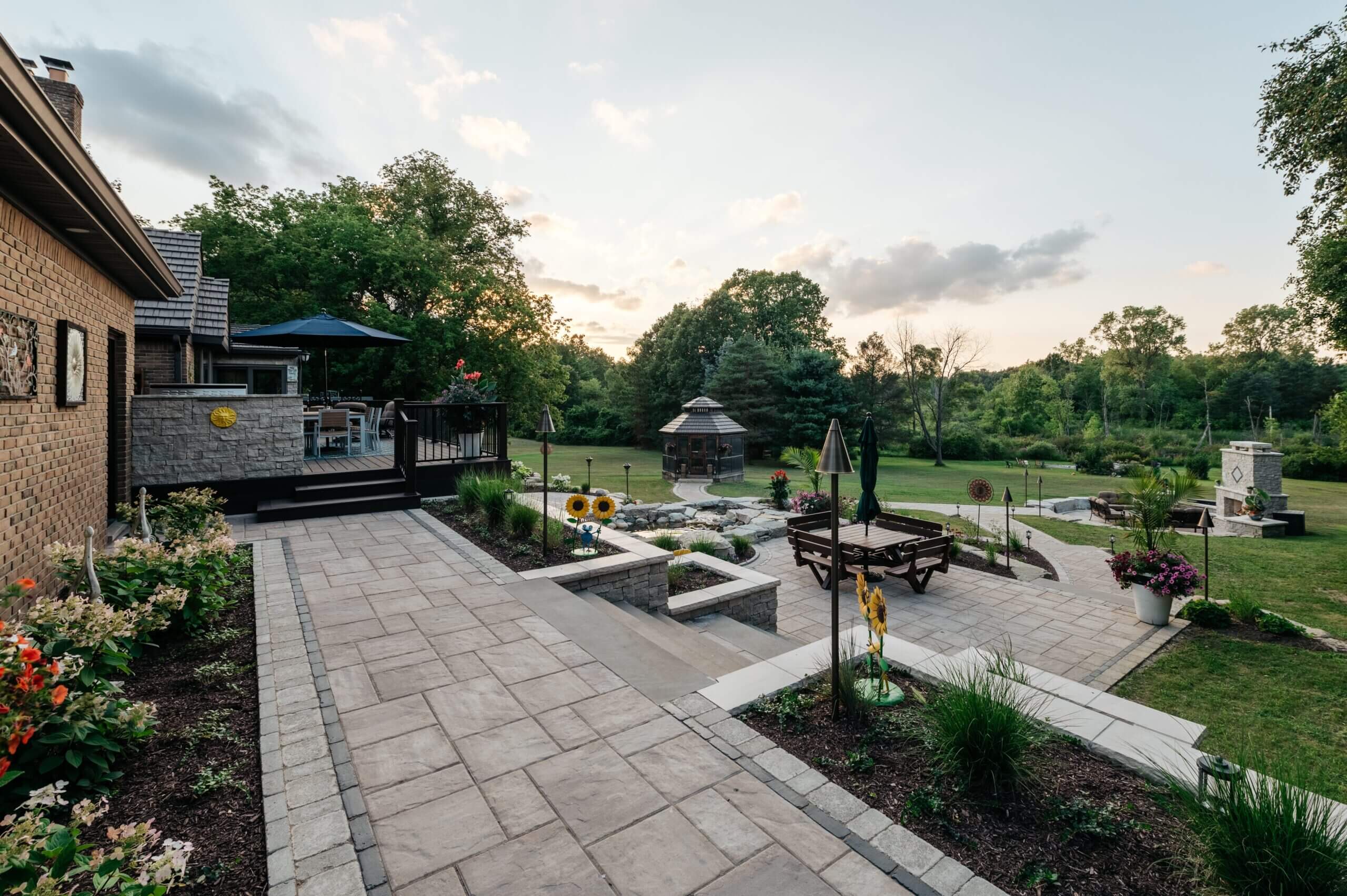 Antonelli Landscape designed remarkable patio paving for this Addison Township home. This landscape design in Michigan created a versatile backyard with lounge space, hosting space, and an outdoor fireplace. Retaining walls were built with Natural Limestone veneer and Unilock Ledgestone coping to provide a waterproof lounge beneath the newly designed deck. We also built an outdoor kitchen on top of the installed deck. Natural limestone slabs and boulders were used to level the terrain, connecting spaces with seamless paver inlays using Unilock Umbriano and Holland Premier. The limestone veneer, paver steps, and concrete pavers were selected skillfully to match the house. By the end of 2021, hardscape work began, and in Summer 2022 the team finished the patio paving and landscape, creating a masterpiece adorned with waterfall ponds and a native garden! CONTACT US!