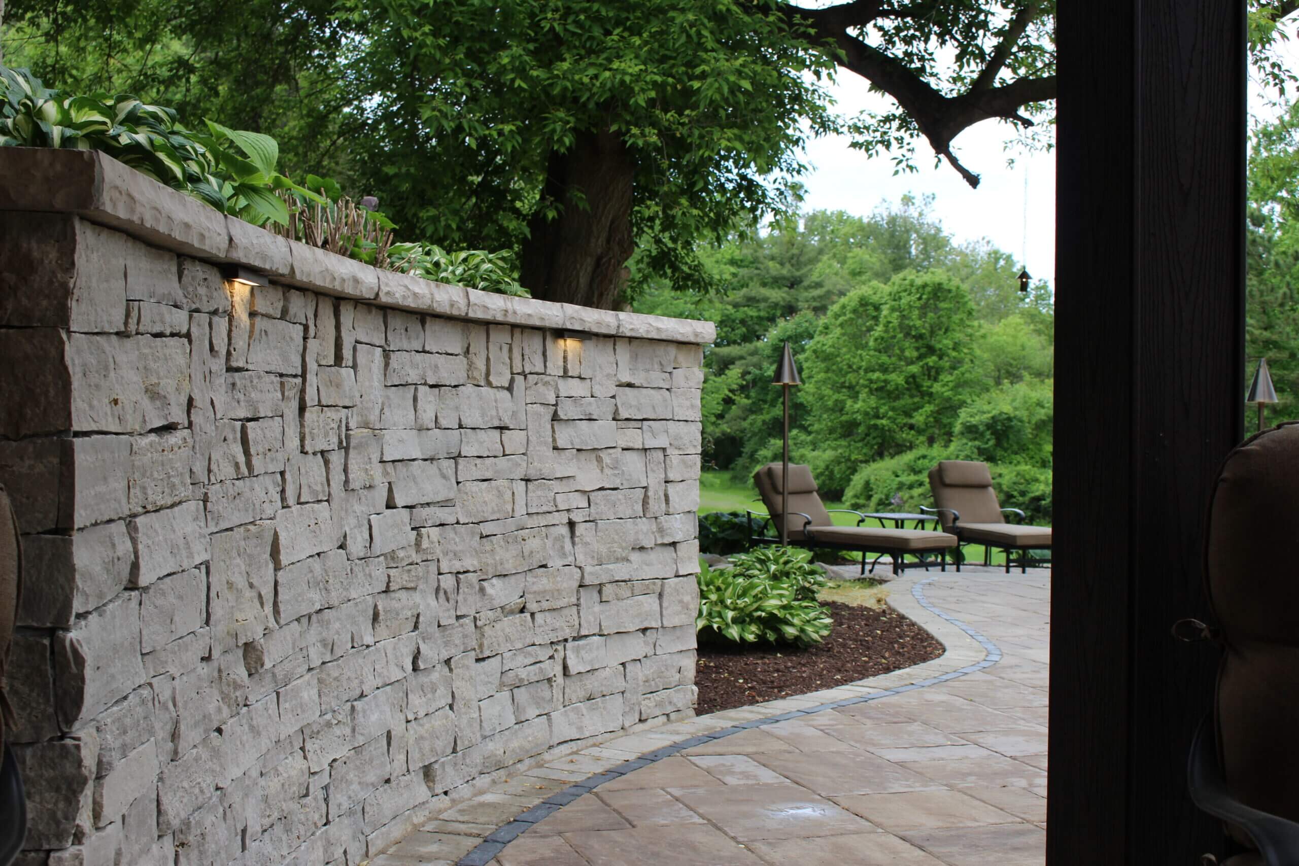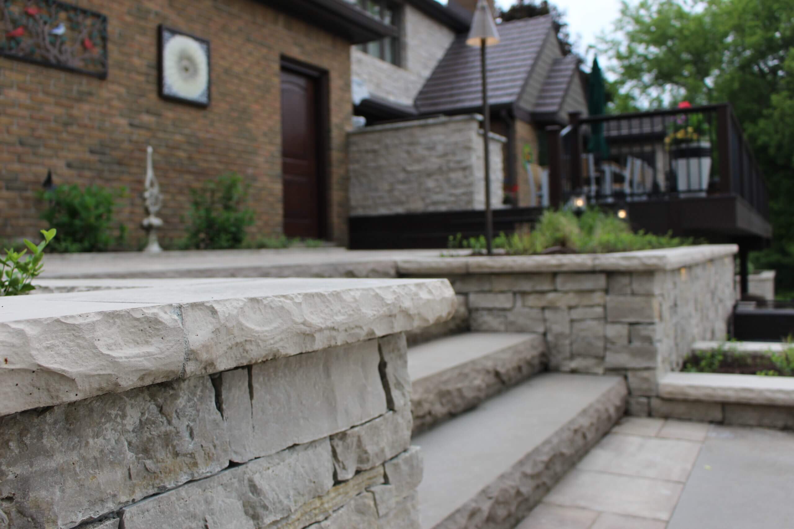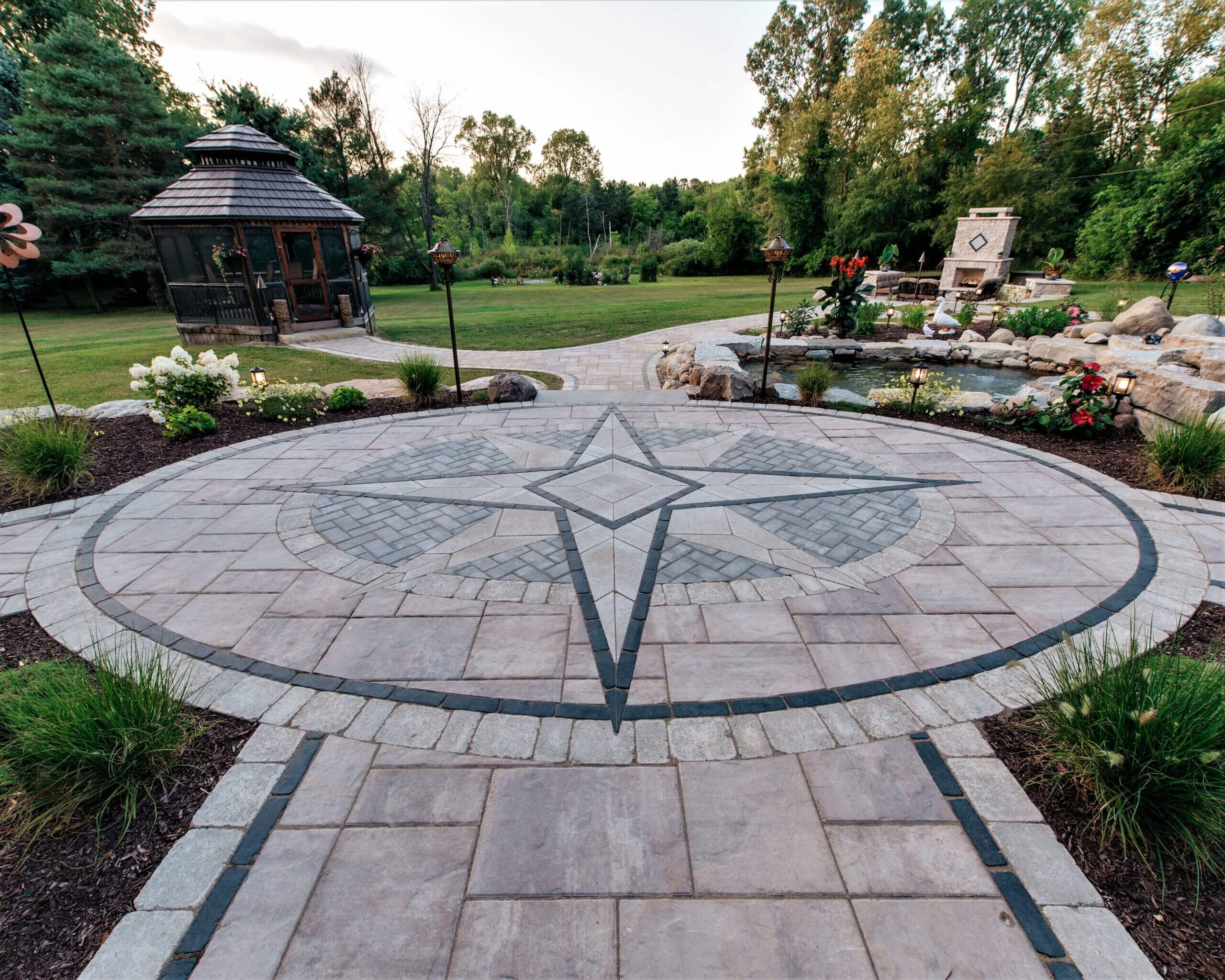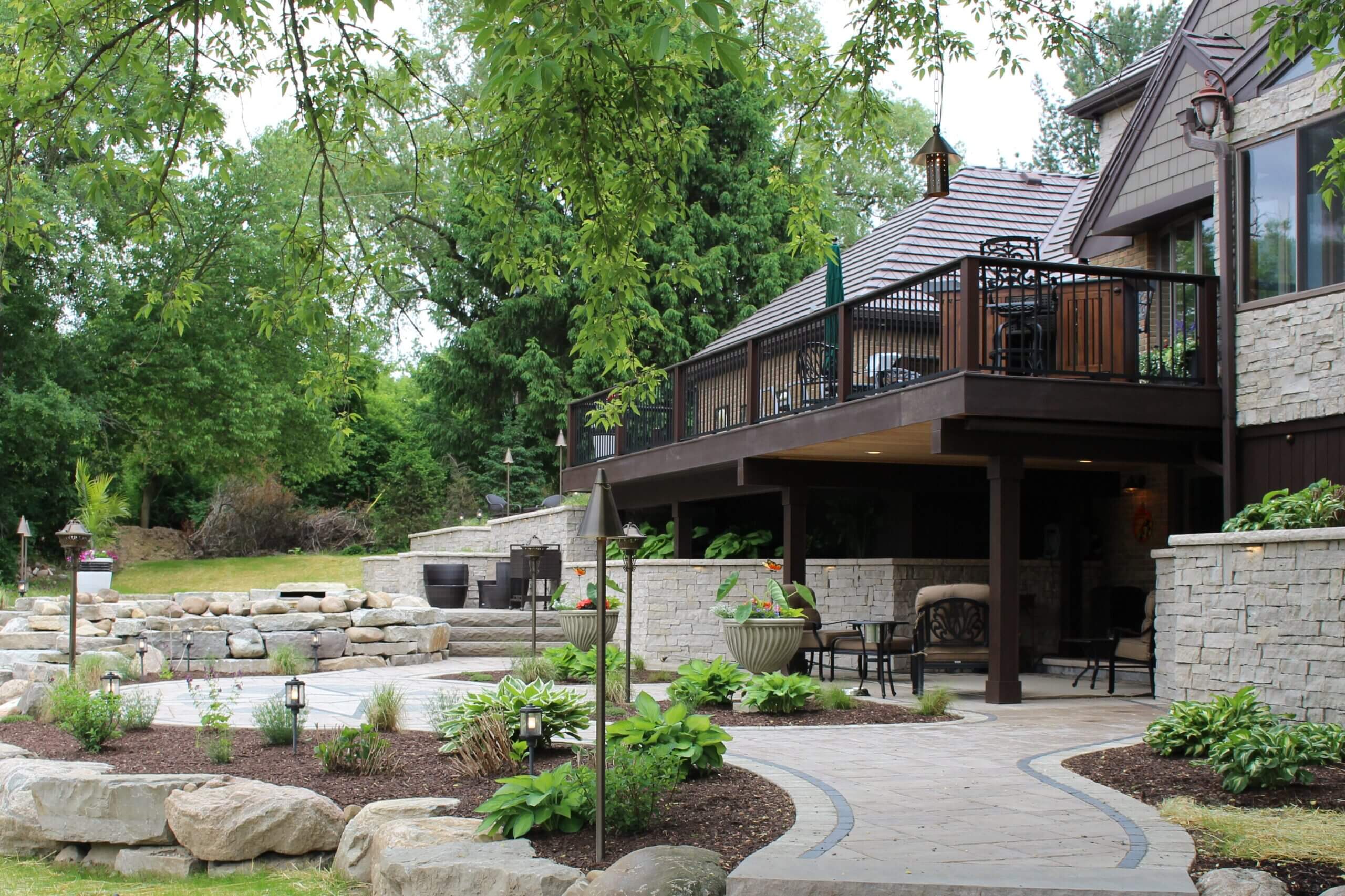 Antonelli Landscape designed remarkable patio paving for this Addison Township home. This landscape design in Michigan created a versatile backyard with lounge space, hosting space, and an outdoor fireplace. Retaining walls were built with Natural Limestone veneer and Unilock Ledgestone coping to provide a waterproof lounge beneath the newly designed deck. We also built an outdoor kitchen on top of the installed deck. Natural limestone slabs and boulders were used to level the terrain, connecting spaces with seamless paver inlays using Unilock Umbriano and Holland Premier. The limestone veneer, paver steps, and concrete pavers were selected skillfully to match the house. By the end of 2021, hardscape work began, and in Summer 2022 the team finished the patio paving and landscape, creating a masterpiece adorned with waterfall ponds and a native garden! CONTACT US!