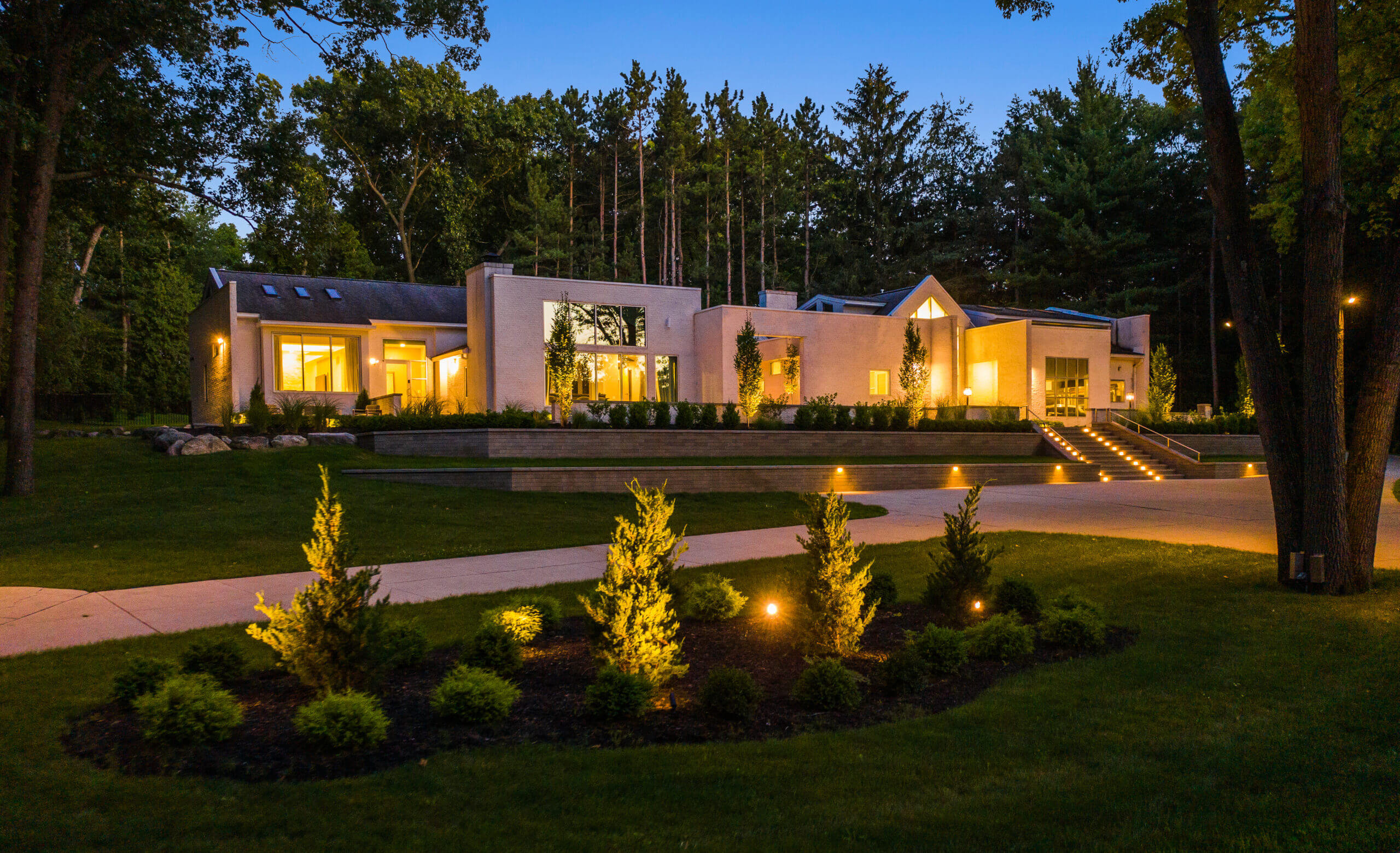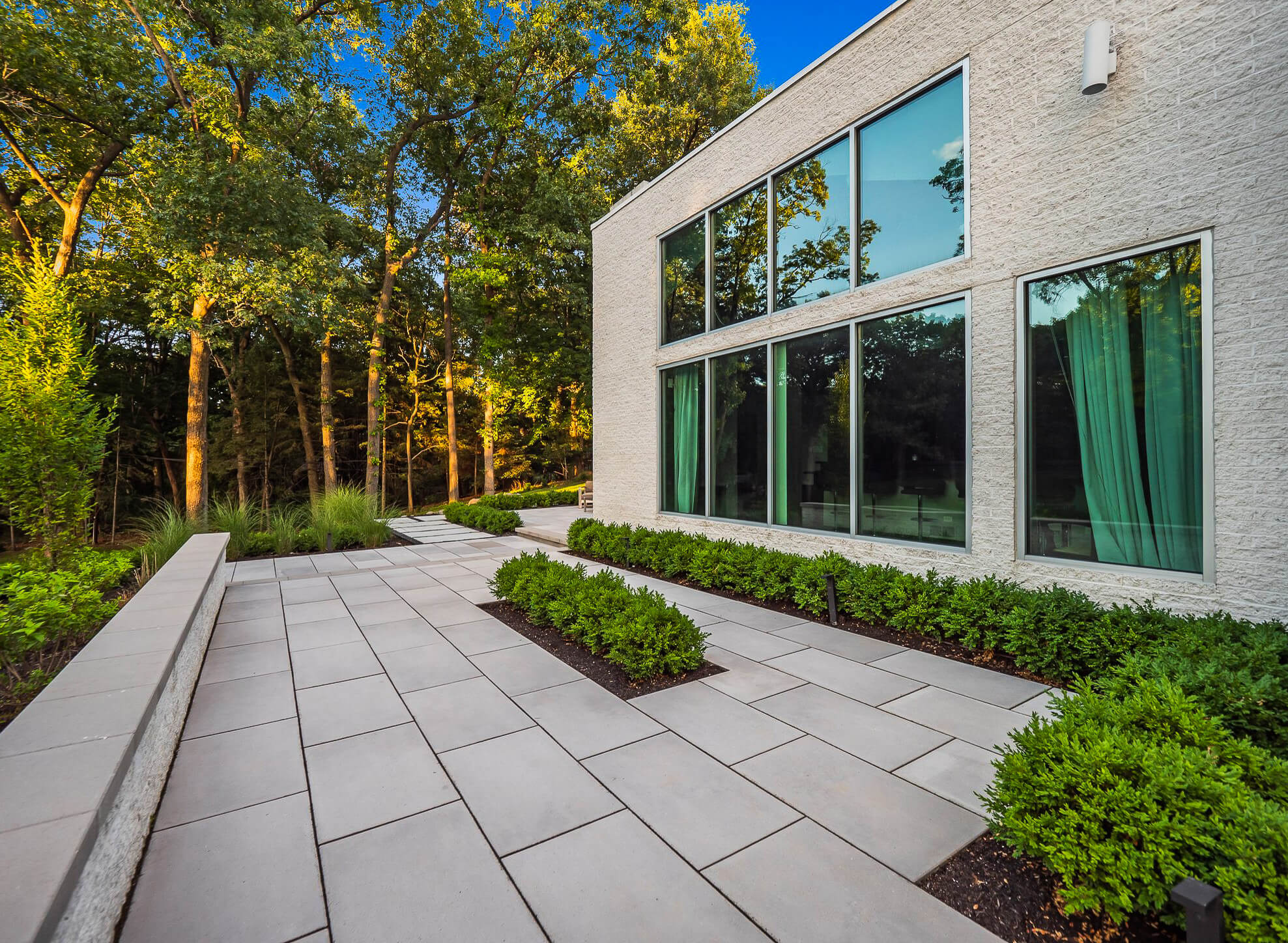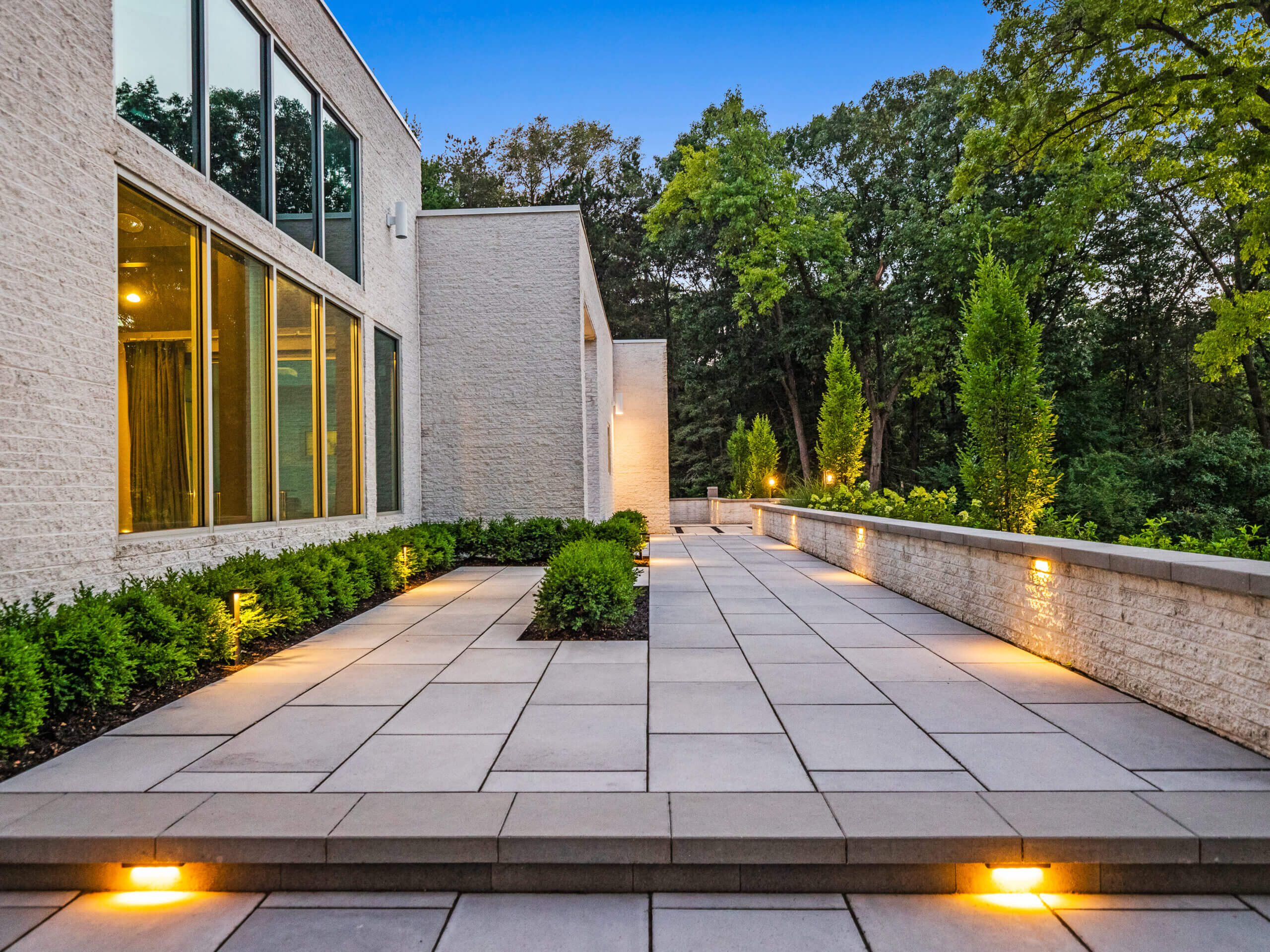 Are you looking for custom patio paving in Franklin, Michigan? The White House Project may not be officially presidential, but certainly requires a refined landscape design to complement the contemporary and minimalist architecture. Nestled in Franklin Michigan, Antonelli Landscape tackled this paving project with Unilock Beacon Hill™ XL Slabs, Unilock Artline™ Pavers, and other pavers that kept the spotlight on this house, while keeping patio spaces intimate and minimal. Building on the steep front slope would prove to be challenging, but the use of terracing effectively leveled the work space and allowed for garden design to flourish. A wide tapered stairway is scaled to create an extension of the home's unique entrance, while landscape lighting provides a warm glow among the hardscape paving. If you have a project idea that is just as satisfying, reach out to US!