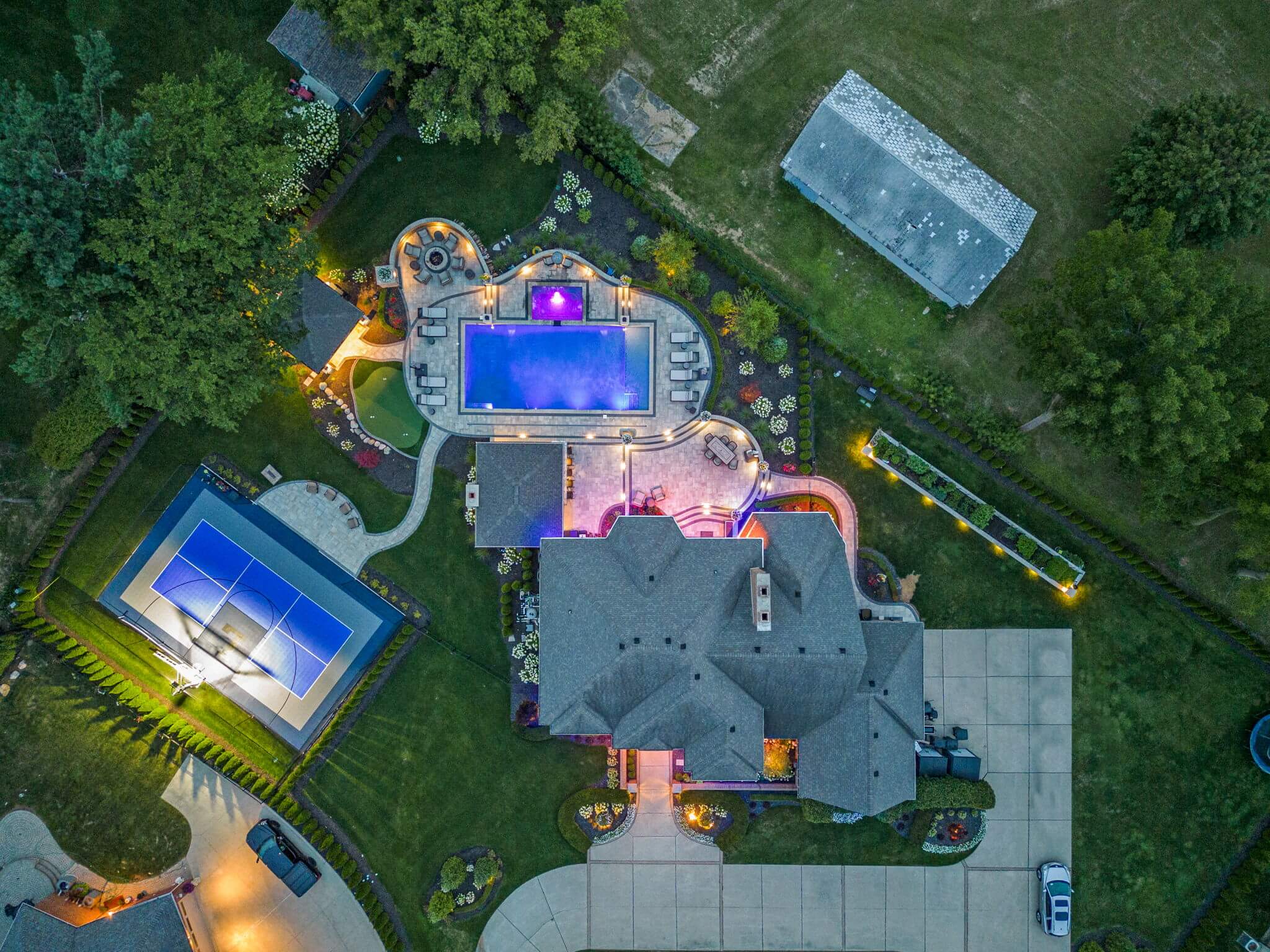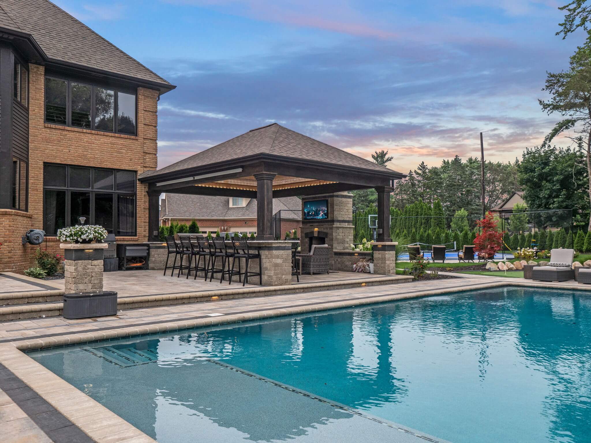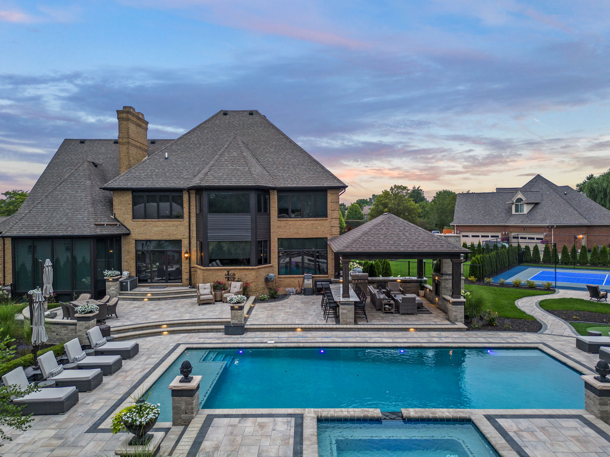 Transform your backyard into a luxurious space with your premier Macomb County pool builder– the Antonelli team! Awarded for excellence and craftsmanship, we specialize in custom pool designs tailored to your taste and space. This Clinton Township pool design boasts a stunning gunite pool and spa, custom cedar gazebo, backyard court, and putt-putt area for endless fun. Homeowners refresh in the custom built bathhouse and enjoy game time with a full outdoor kitchen, fireplace, and TV mount. Plus, this patio design features a custom fire pit and cascading waterfalls for a serene atmosphere. Completed with softscaping throughout the front yard, our pool build services in Macomb County MI, will bring your outdoor space to life. CALL US now!