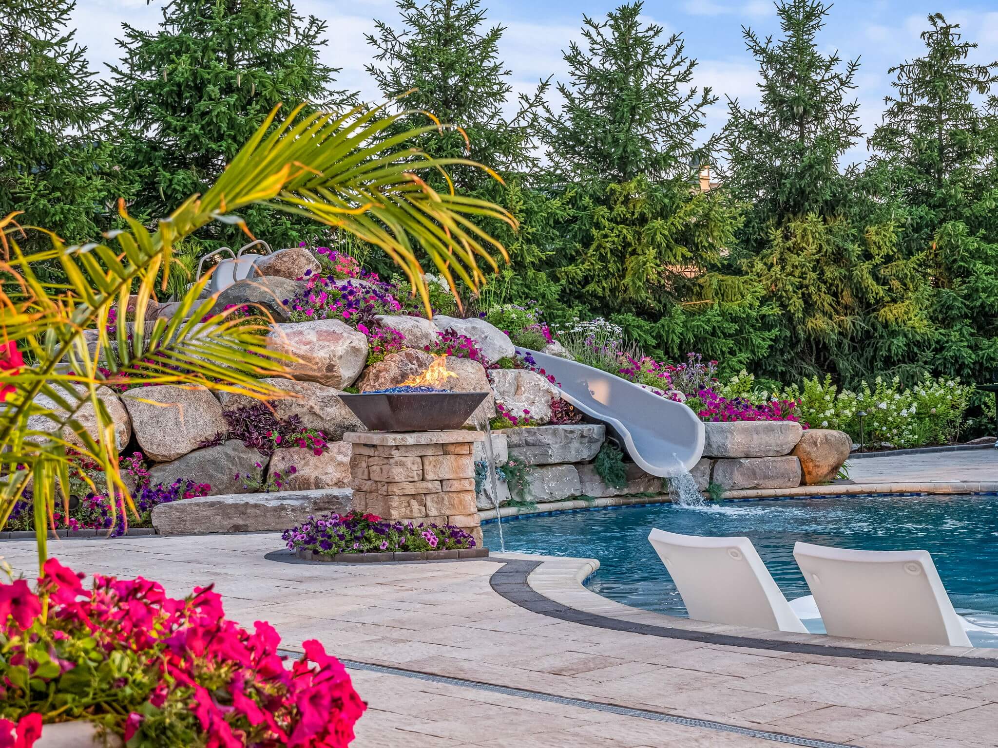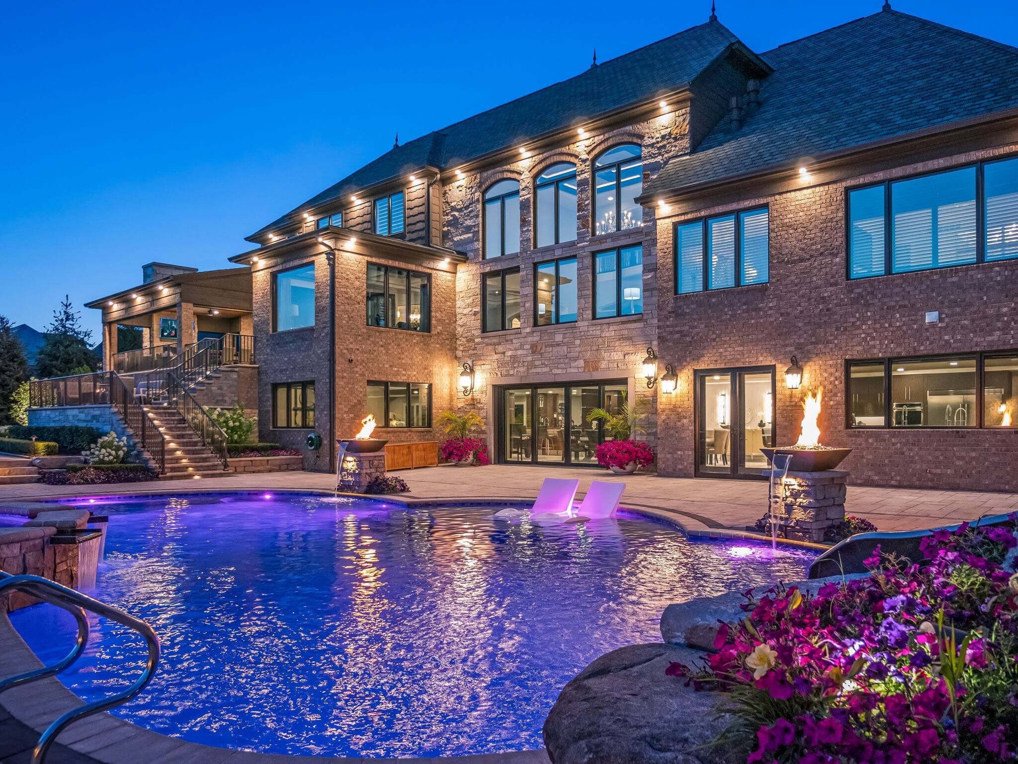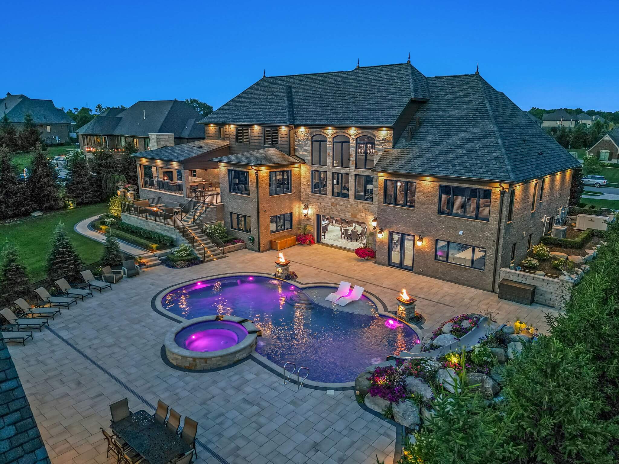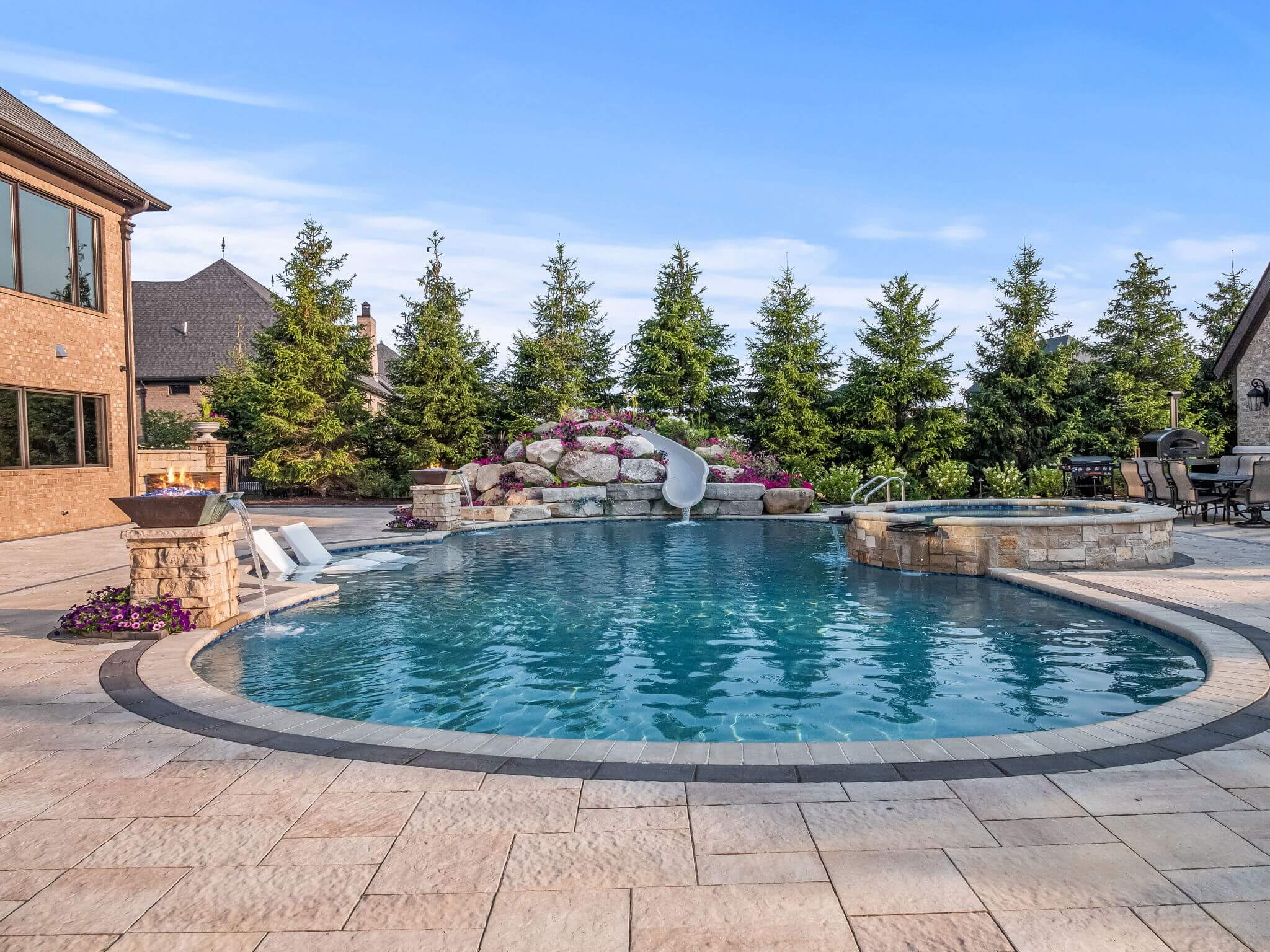 Antonelli is your elite pool builders in Washington, MI! This project features a gunite inground pool and spa complete with cascading waterfalls, and a hidden slide tucked into Michigan fieldstone boulders, made for endless fun. The elegant pool deck pavers frame the pool, harmonizing with the overall home design. Additionally, the pool deck boasts pillars with ambient fire bowls, enhancing the outdoor living space. The brick paver walkways and driveway crafted with Oaks Rialto seamlessly unite the landscape, completing the cohesive aesthetic. Landscape lighting further enhances the exterior, adding a final touch of sophistication to the entire property. Get started with our award-winning craftsmanship and service, REACH OUT!