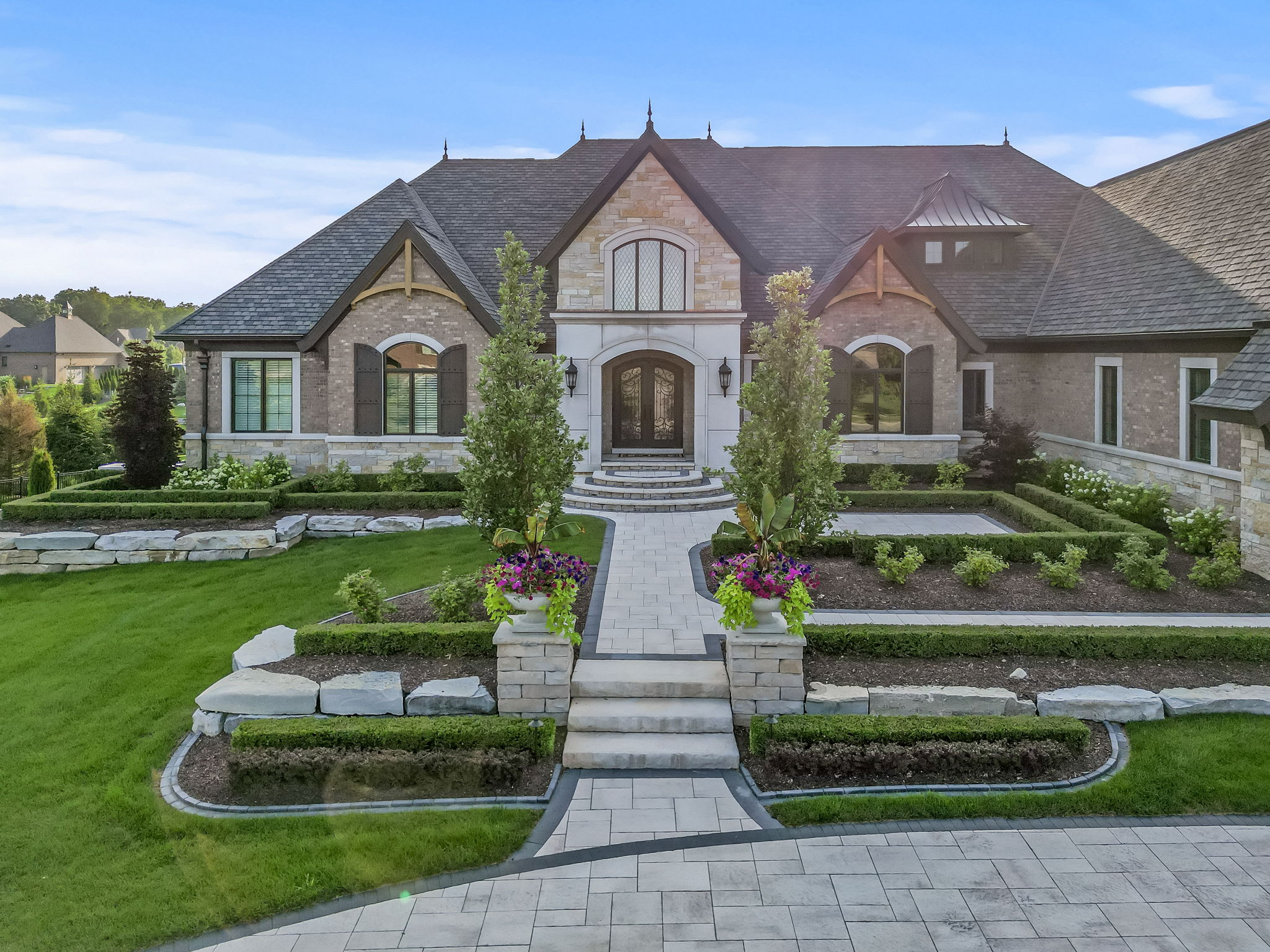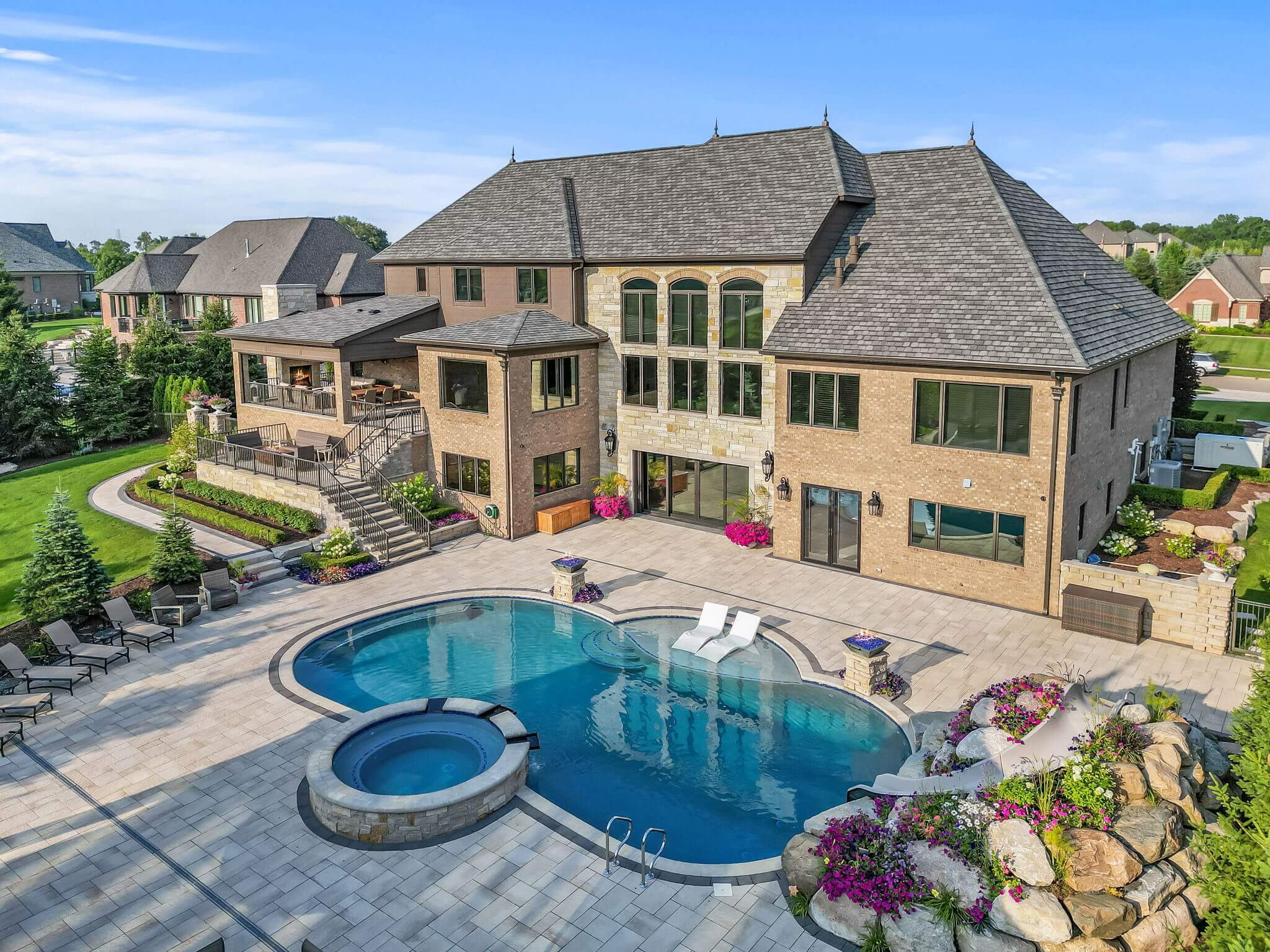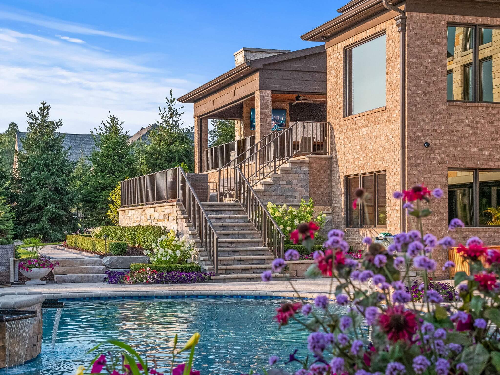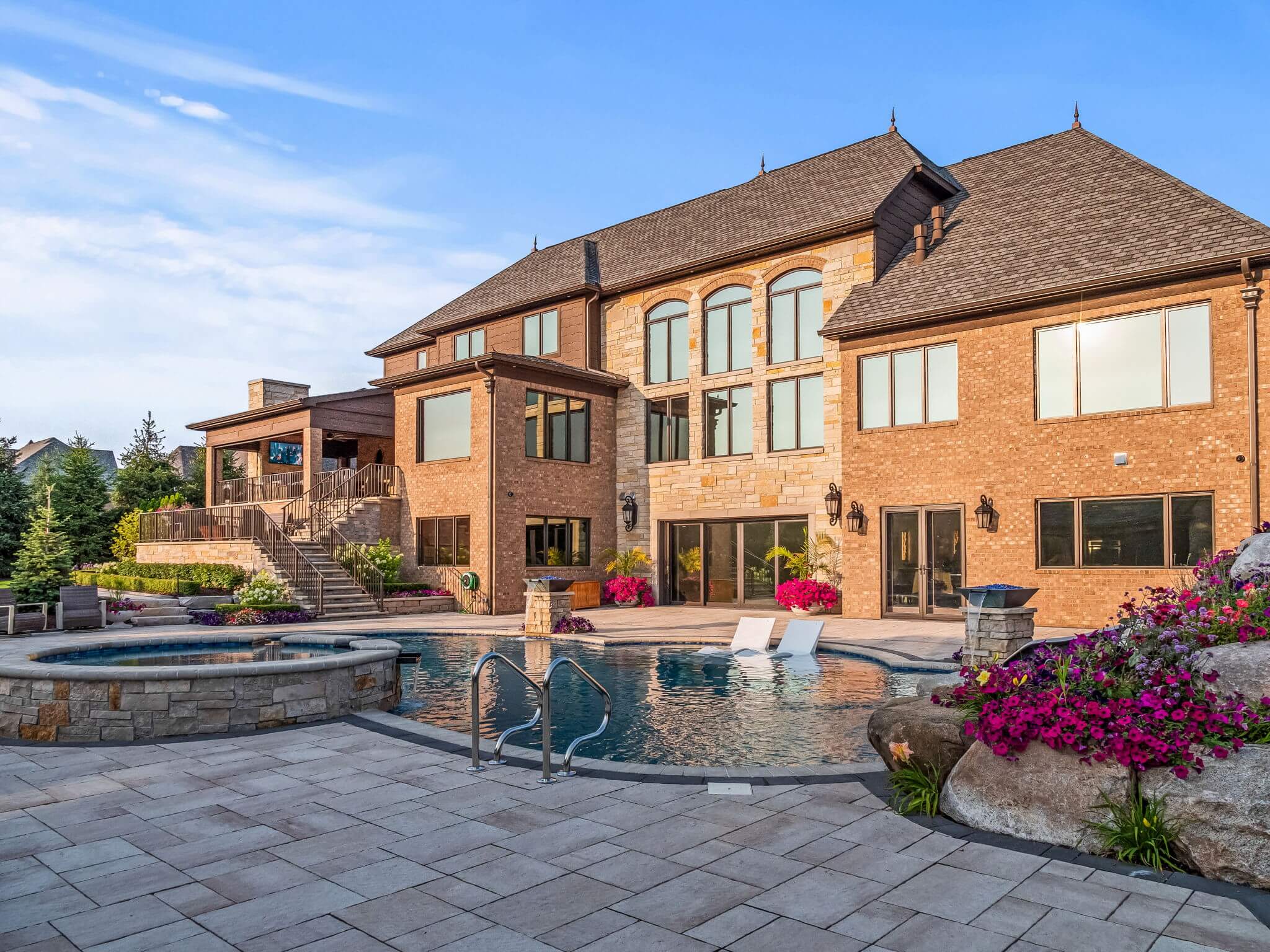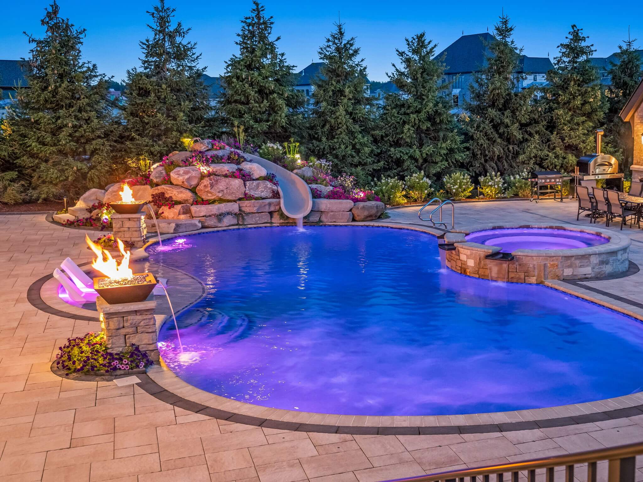 Antonelli is your elite pool builders in Washington, MI! This project features a gunite inground pool and spa complete with cascading waterfalls, and a hidden slide tucked into Michigan fieldstone boulders, made for endless fun. The elegant pool deck pavers frame the pool, harmonizing with the overall home design. Additionally, the pool deck boasts pillars with ambient fire bowls, enhancing the outdoor living space. The brick paver walkways and driveway crafted with Oaks Rialto seamlessly unite the landscape, completing the cohesive aesthetic. Landscape lighting further enhances the exterior, adding a final touch of sophistication to the entire property. Get started with our award-winning craftsmanship and service, REACH OUT!