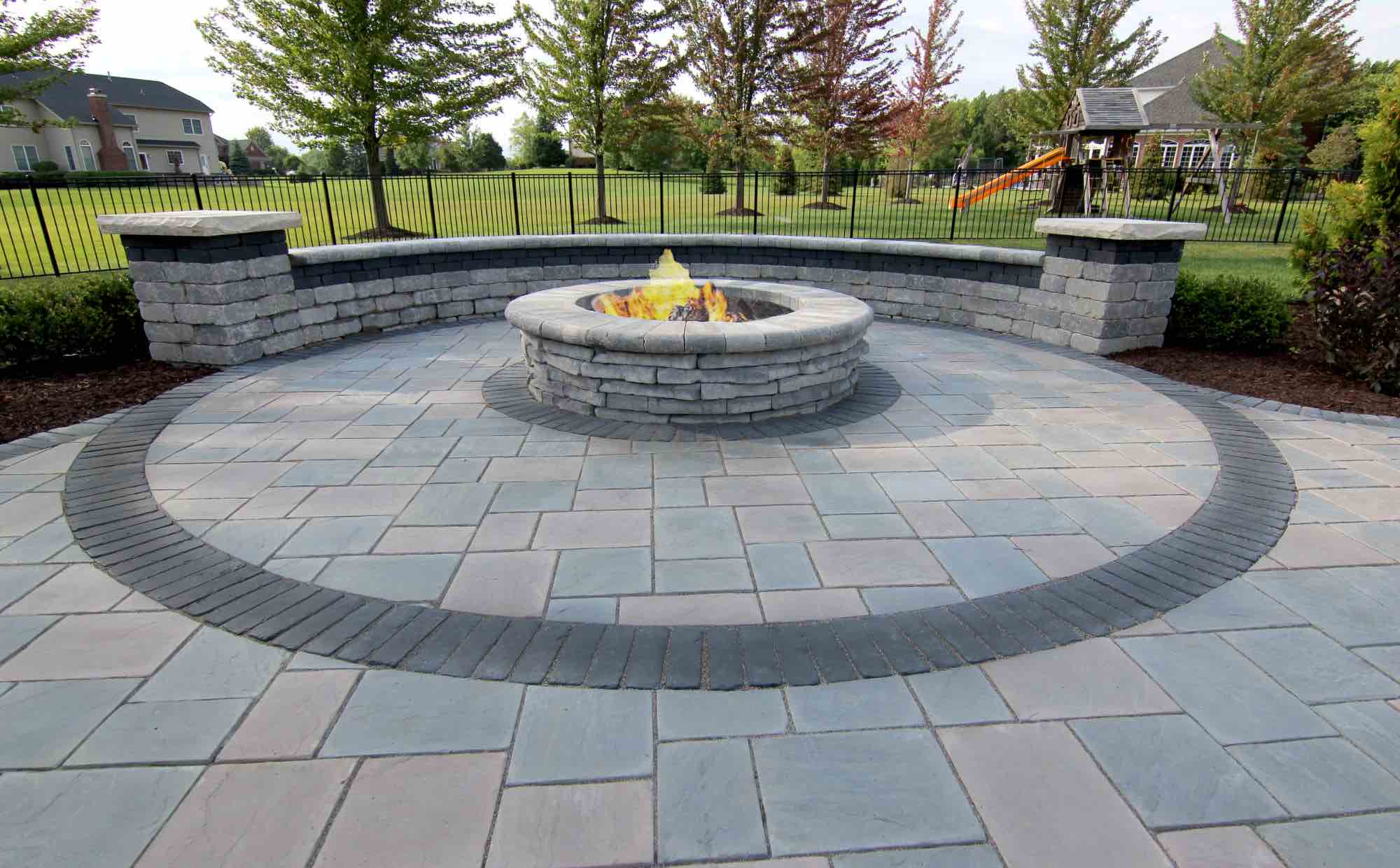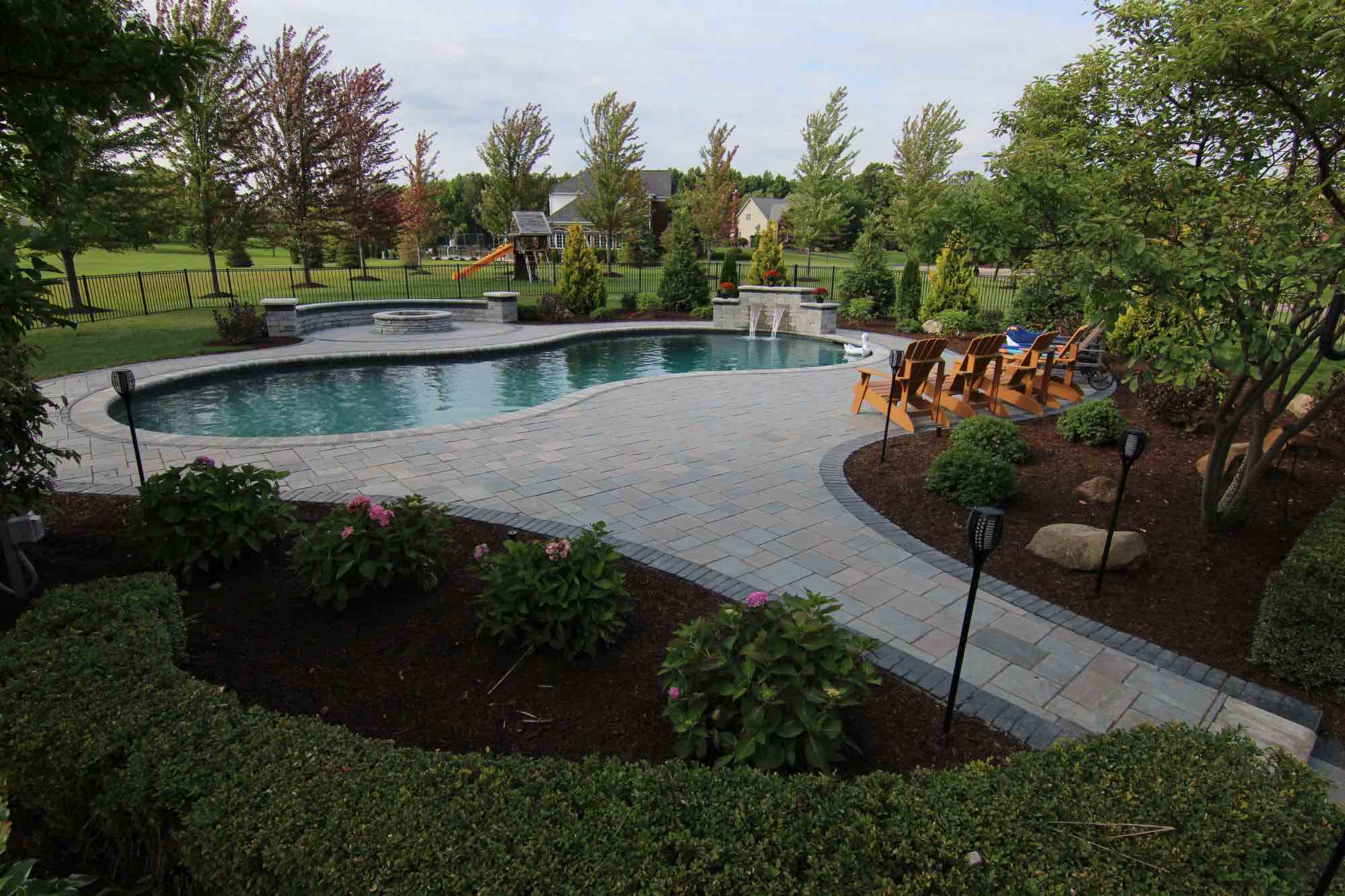 Searching for freeform gunite pool builders in Milford, MI? This large property project features a stunning gunite freeform pool, and a complete paver pool deck with brick paver walkways connecting you to the other parts of the home. The centerpiece of the design is a freeform curved gunite pool with a cascade waterfall, providing a beautiful and relaxing setting. The paver pool deck features Unilock in Richcliff with Unilock Copthorne borders. The homeowners also requested a custom built fire pit and seating wall area using Unilock Pavers in style Ledgestone, adding the perfect lounge space to this hardscape design. The finishing touch to this outdoor living space is the cascade waterfall and all around landscape design with fresh plantings providing renewed privacy. Let’s get started, CALL US!