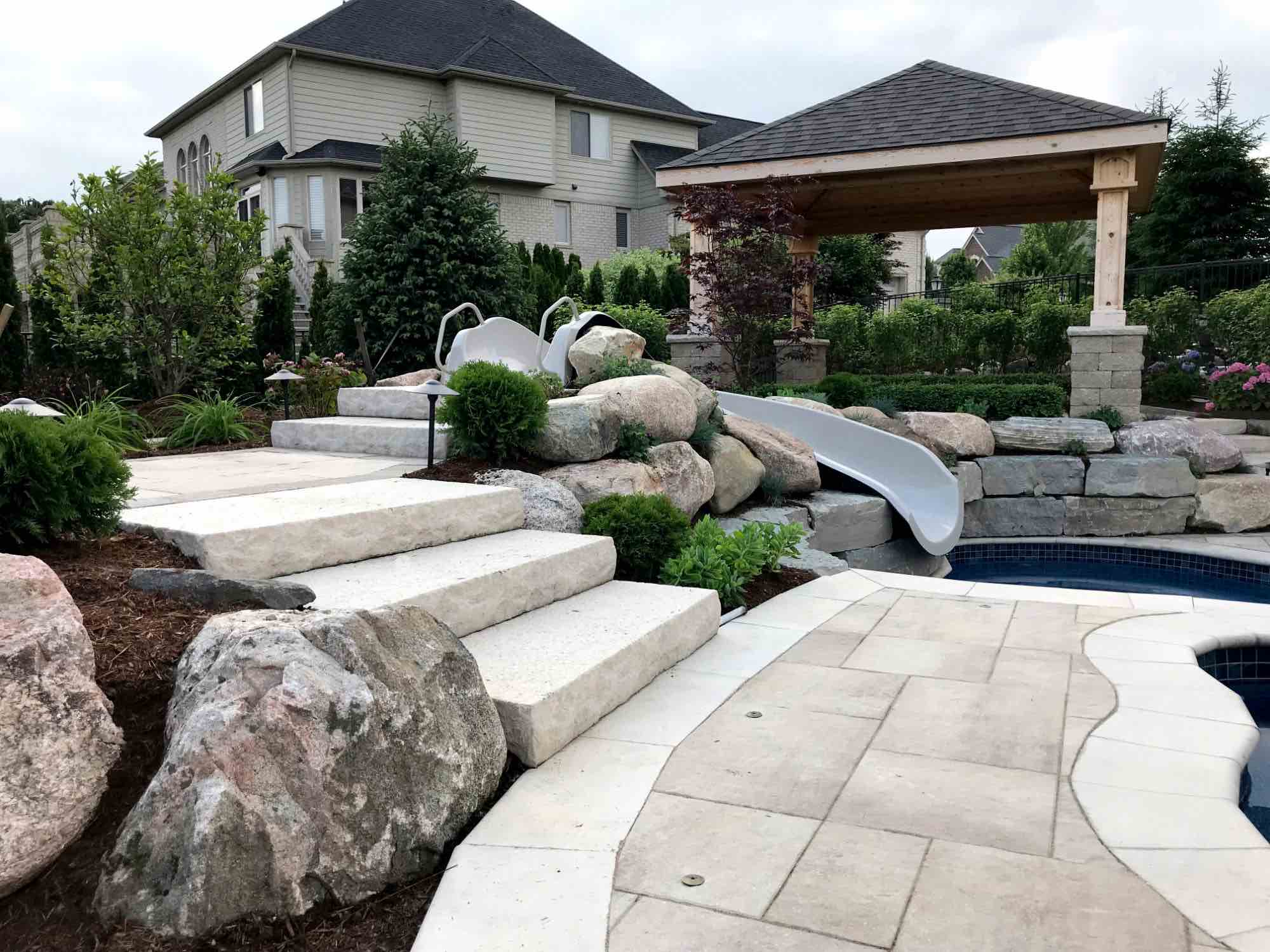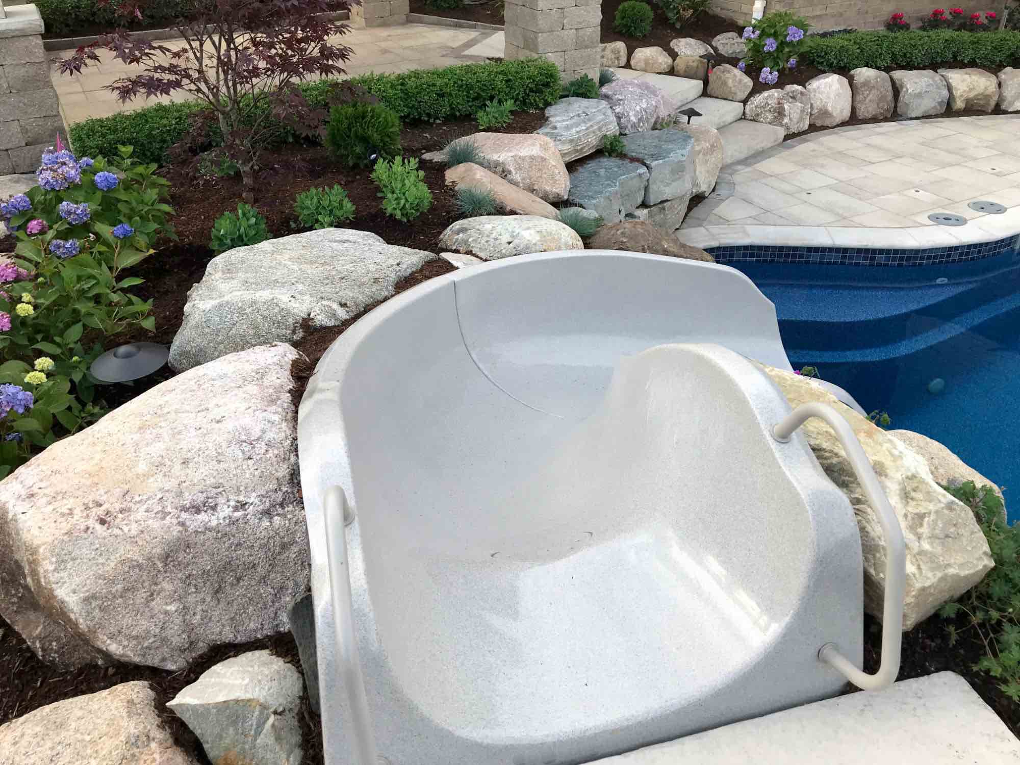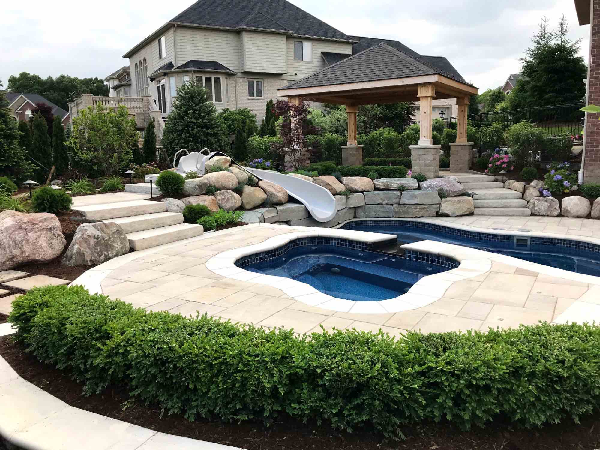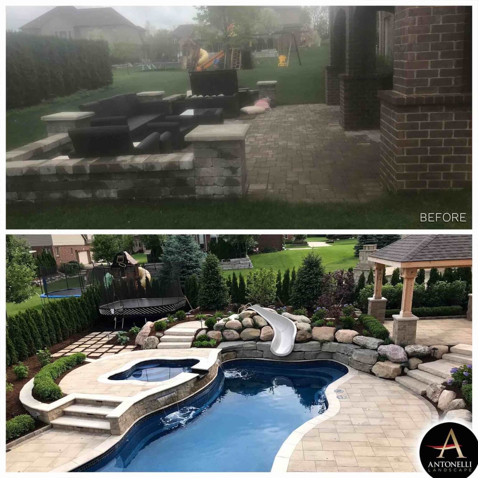 This adventure filled fiberglass pool installation in Rochester hills, Michigan was a joy to design and it is easy to see why. The Antonelli design team was tasked to make a backyard paradise where imagination runs wild, and so we got to work. Our design team built a fiberglass inground pool, built with a custom backyard water slide, and a gorgeous spillover spa. A charming poolside gazebo was also built for lounging. The challenge was to integrate the slide into the natural landscape, so we strategically placed Michigan boulders around the swimming pool to achieve this. The final touch to this nine week project, was a paver fire pit that welcomes you to relax into the night. Ready for your custom pool design in Metro Detroit? CONTACT us now!