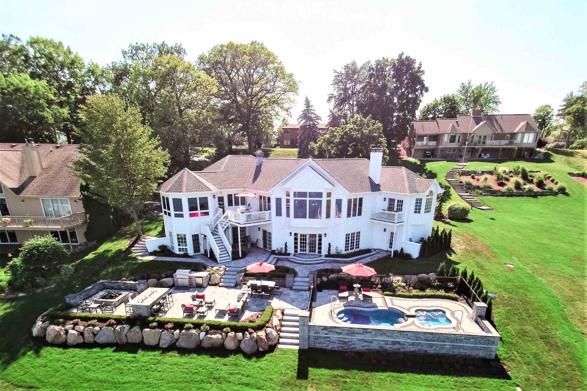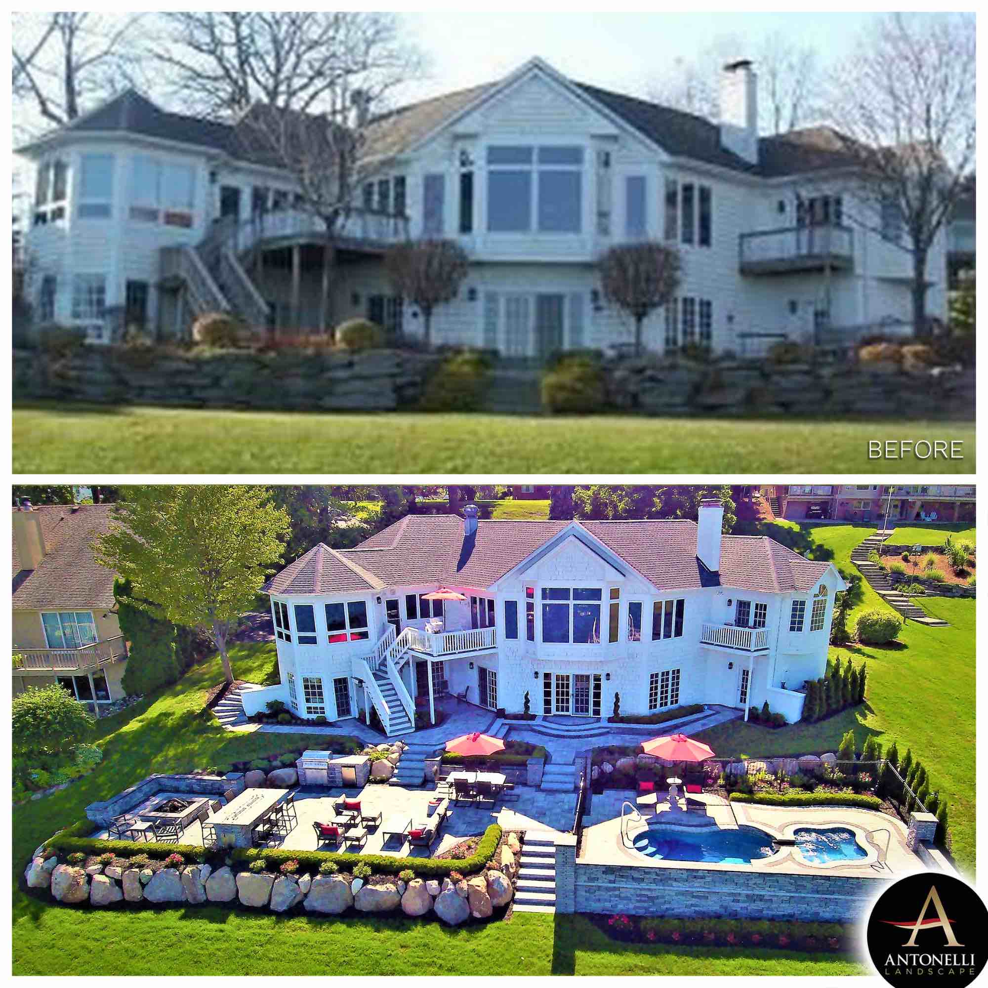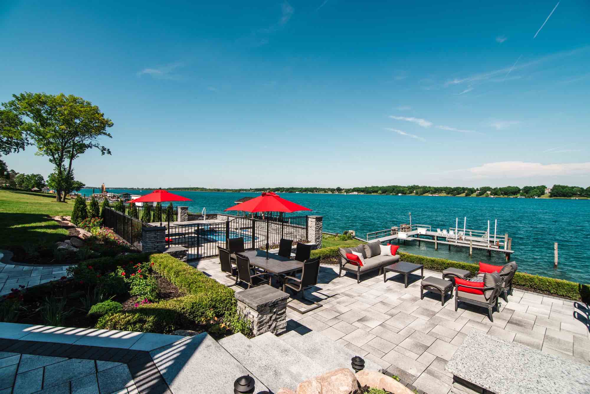 This fiberglass pool & spillover spa in St. Clair Michigan exceeded all expectations, turning this backyard into a paradise right here in SE Michigan! The Antonelli team was committed to designing a luxurious fiberglass pool, complete with a bubbling spillover spa, and fire features. To fulfill this vision, we started by crafting a fire table for unforgettable dining, a secluded fire pit area with retaining walls, and the captivating pool area, strategically placed to ensure unobstructed views of the river. Elevation was a challenge, and we conquered it with a network of integrated paver staircases. The main ledgestone staircase unites the patio and pool areas to the river's edge. This backyard isn't just a space; it's a destination on the river. CONTACT us for your swim spa in Southeast Michigan!!