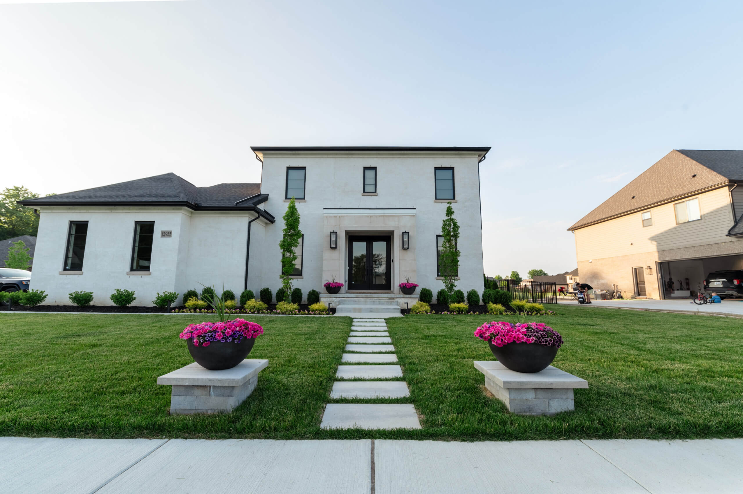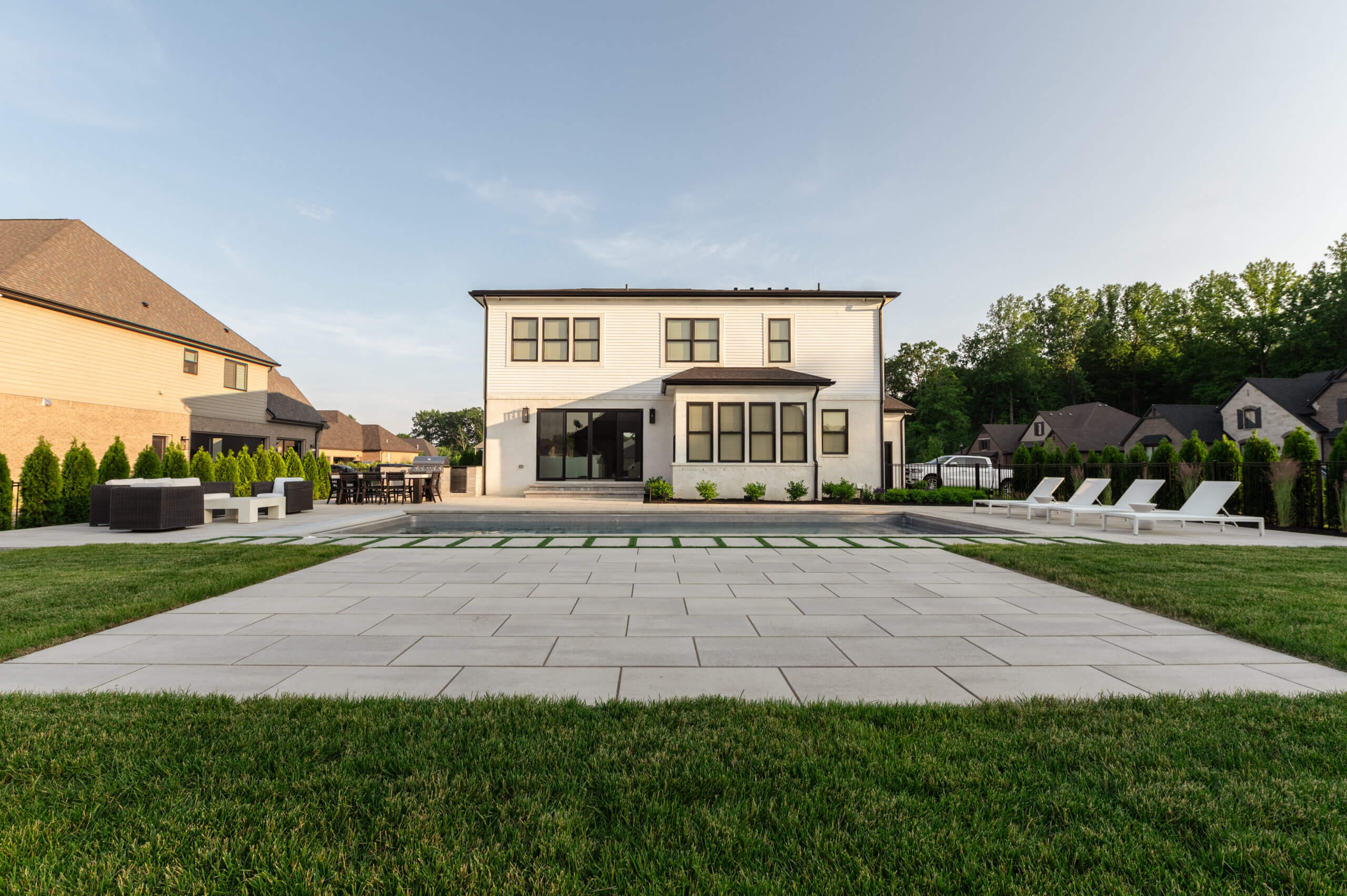 The elegance of modern design can be seen in this gunite pool design in Shelby Twp, MI. The family requested to create a space that was easy to maintain, and a joy to spend time in. This outdoor living space includes a gunite inground pool with auto pool cover, a built in grilling station with granite counter tops, and artificial turf inlays poolside, making attention to detail a necessity. The pool deck and patio hardscape was designed with Techo-Bloc Blu 60 Modern Collection brick pavers, offering a modern look and durable surface. We also completed the front yard landscaping, incorporating a front entrance stepping stone walkway, front accent pillars, and a complete softscape design. Having a luxury retreat can be as simple as having a durable patio design, and an unforgettable inground pool. REACH OUT to us!