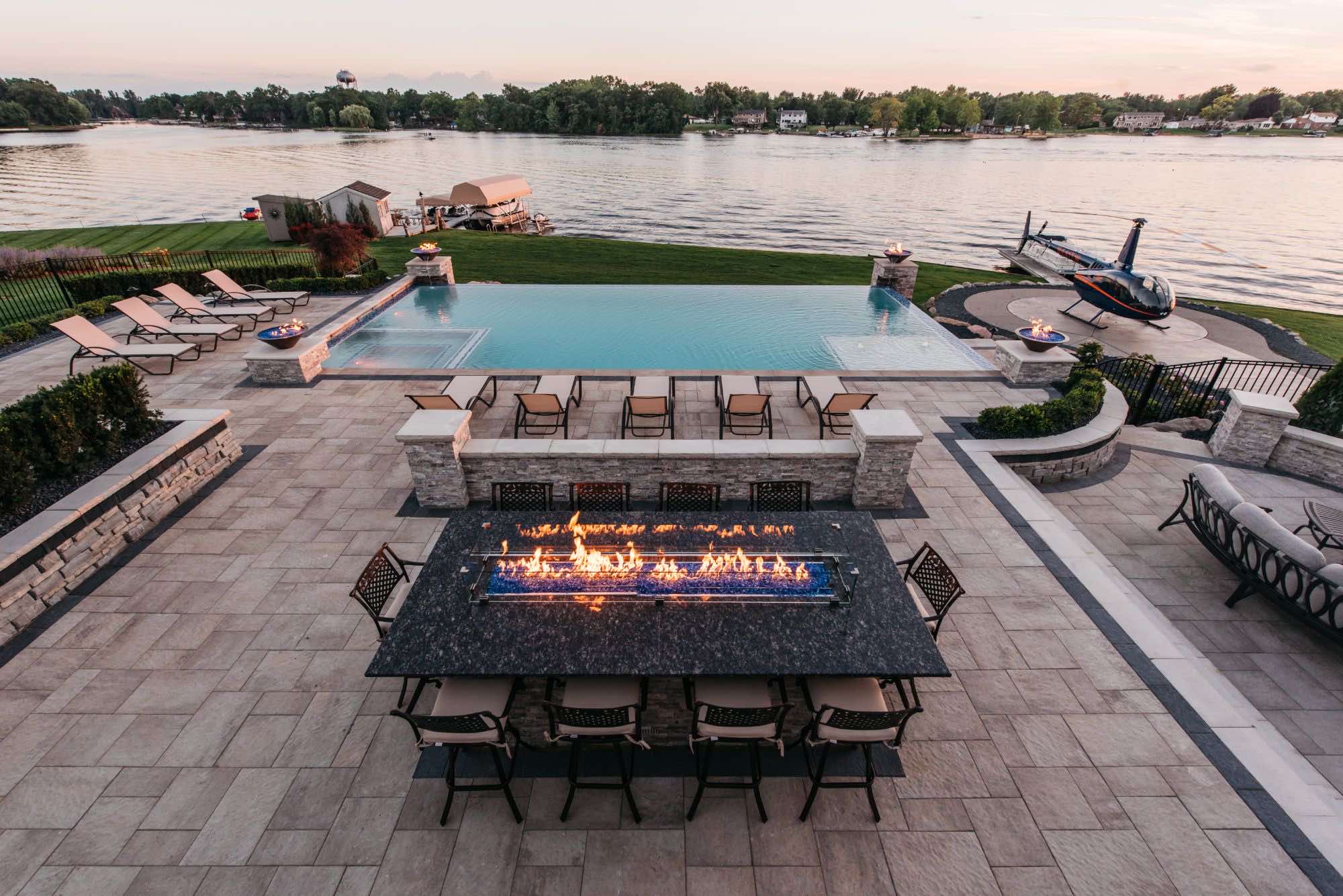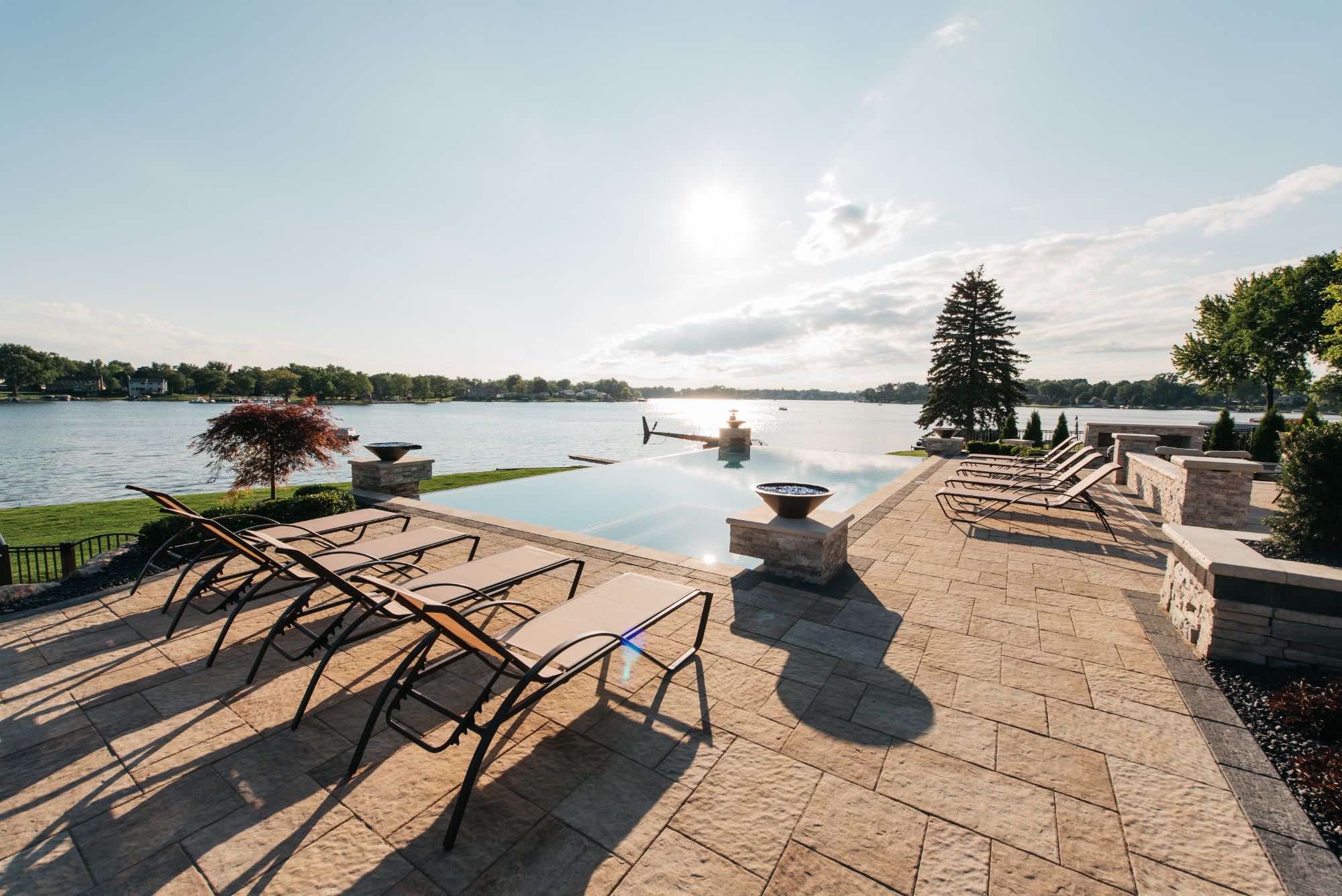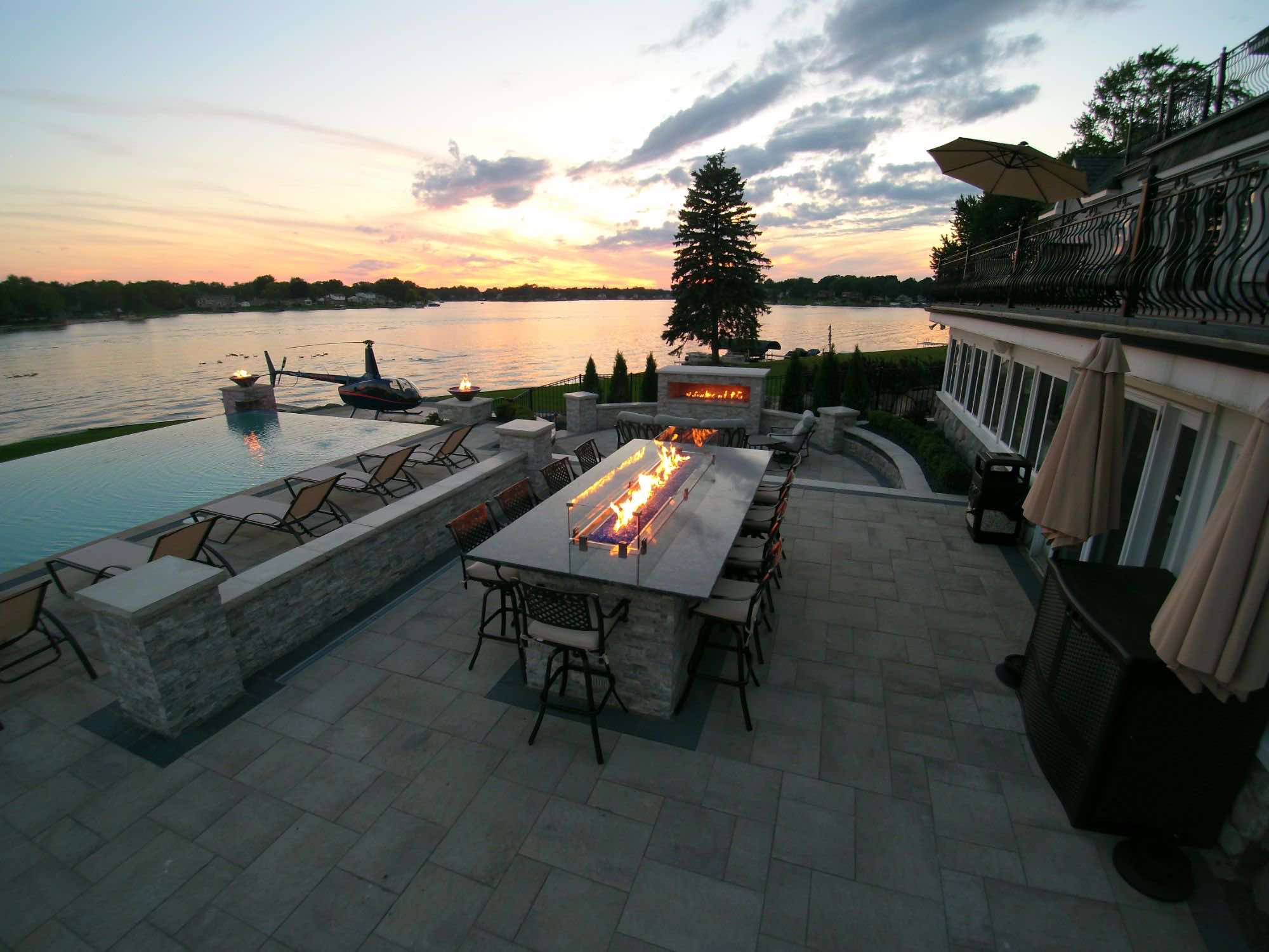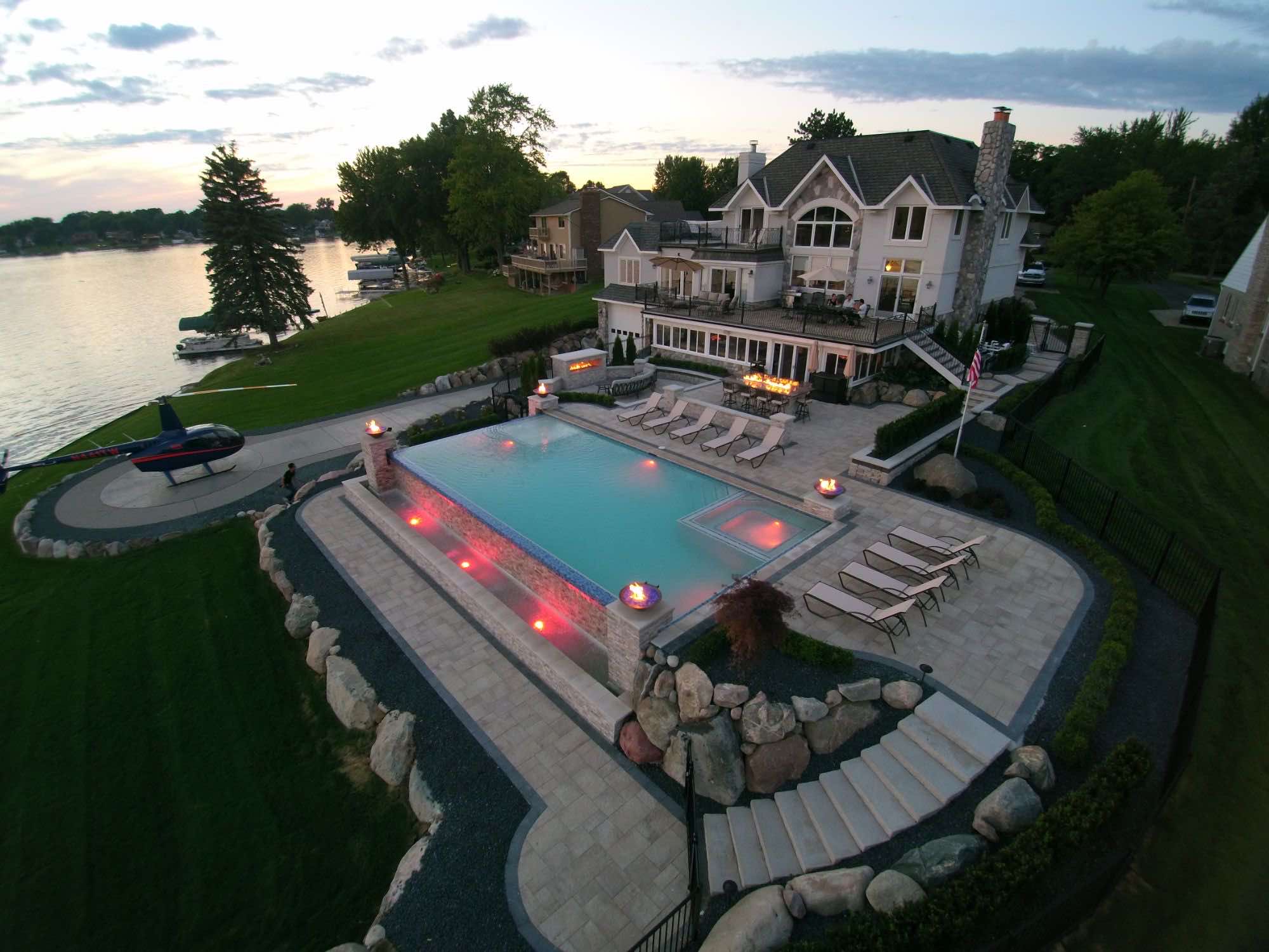 The homeowners were looking for infinity edge pool builders in Waterford, Michigan and the team was set on the task. They requested a pool and spa design that would provide them with their own private resort. The top priorities for this outdoor living space was the the custom gunite pool and spa, seating areas for relaxing, and a backyard paver helipad! We also designed a large fire table for cozy dining, a sunken fireplace area with adequate seating, and an open pool area that uses the dramatic slope of the yard to its advantage. The pool deck and patio were designed with Oaks pavers in style Rialto. Fire bowls and natural cascades were installed for sensory elements, and paver steps using High Format Dimensional Steps allow you to access all ends of this backyard living space. Your infinity edge pool awaits, CALL US now!