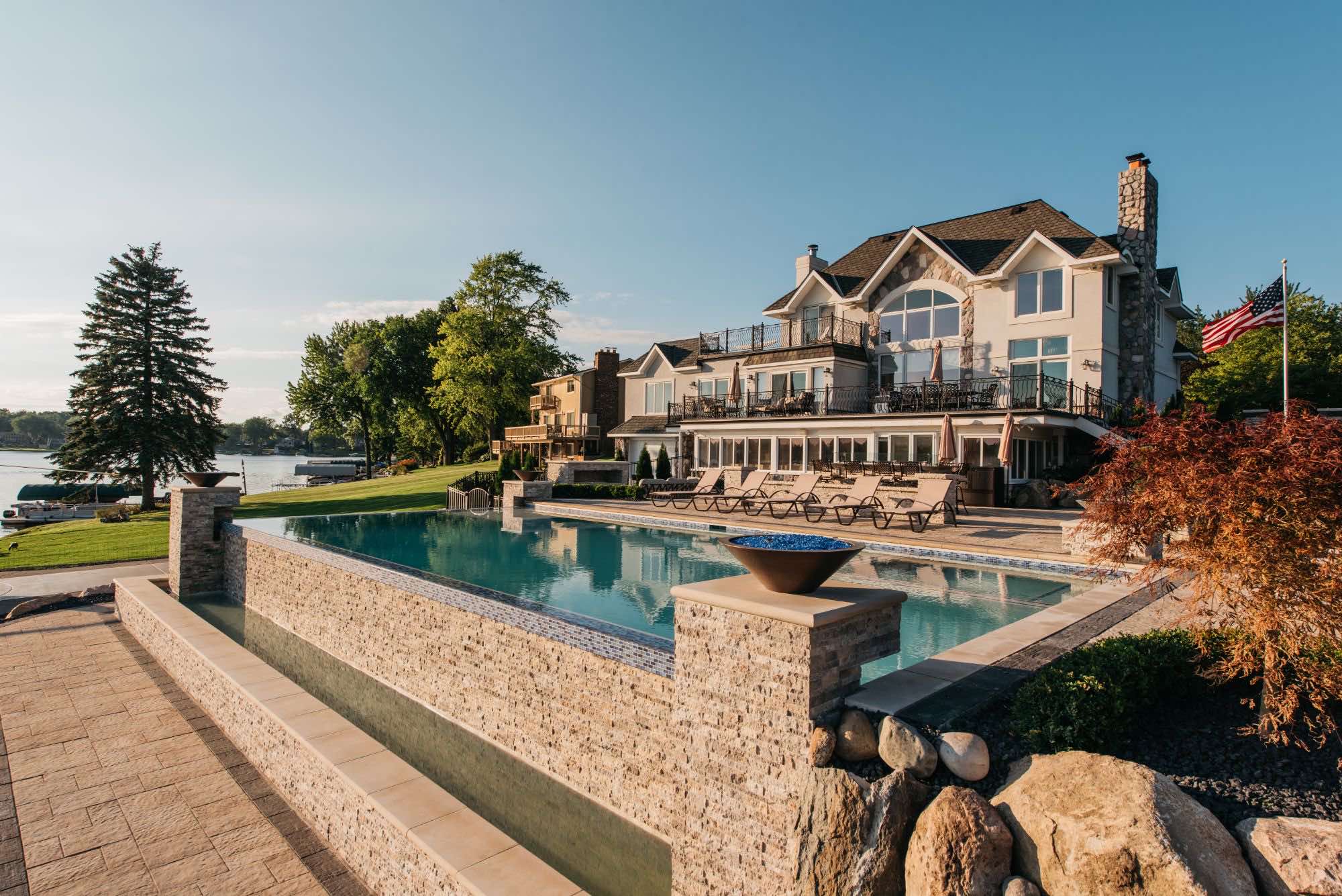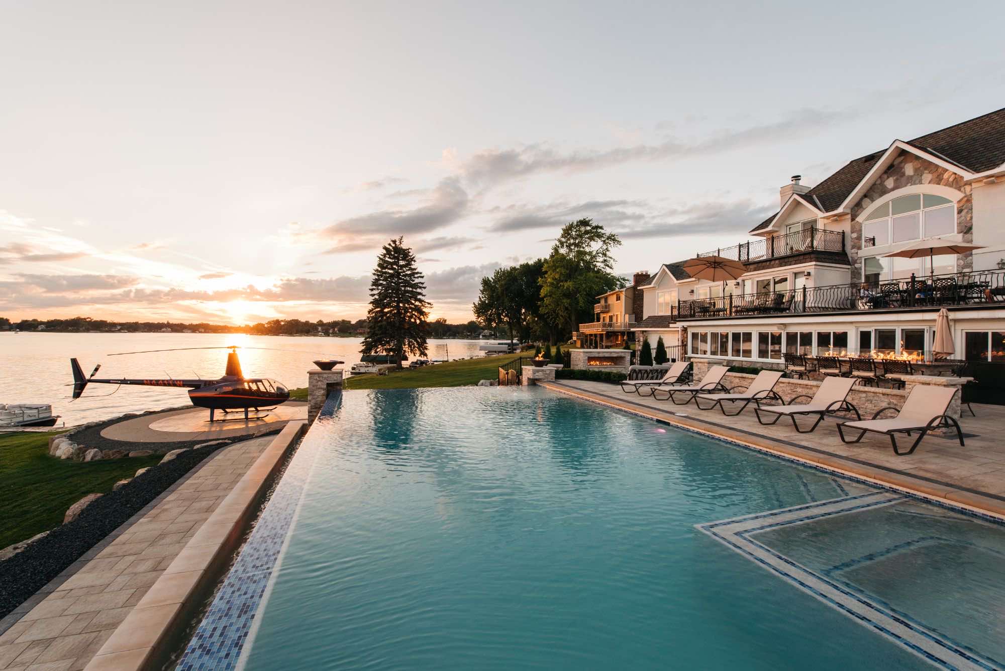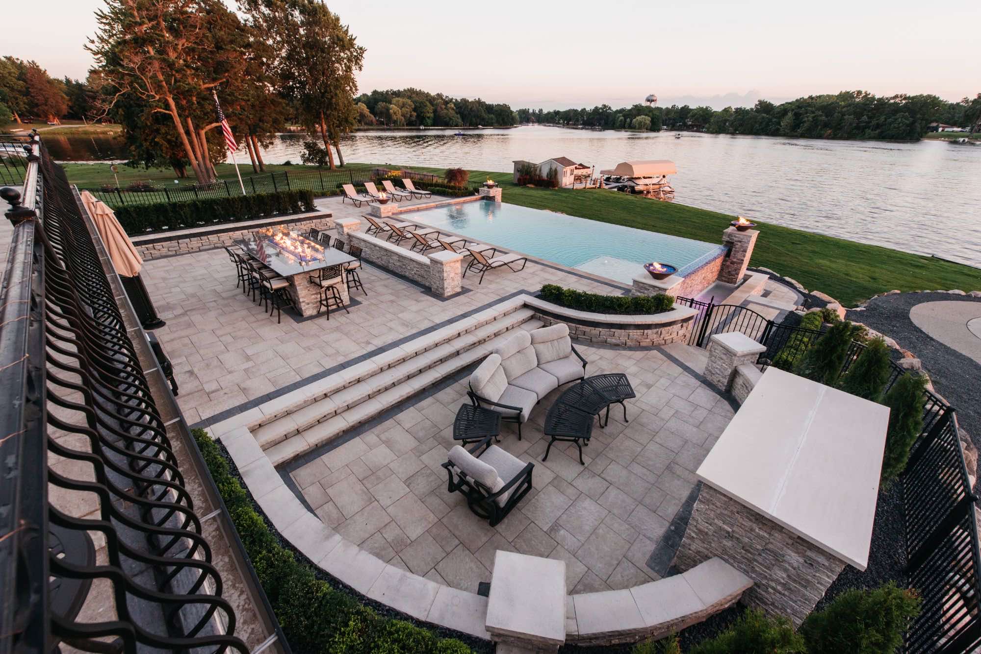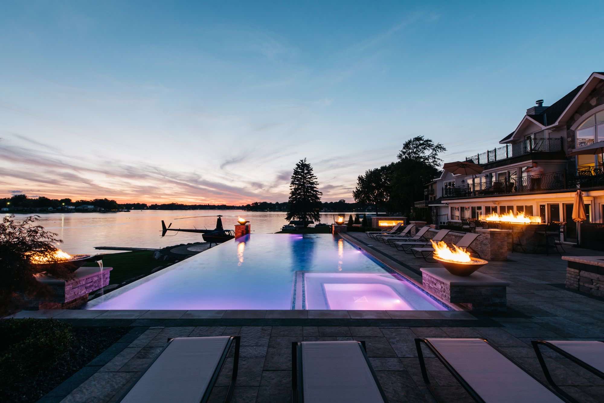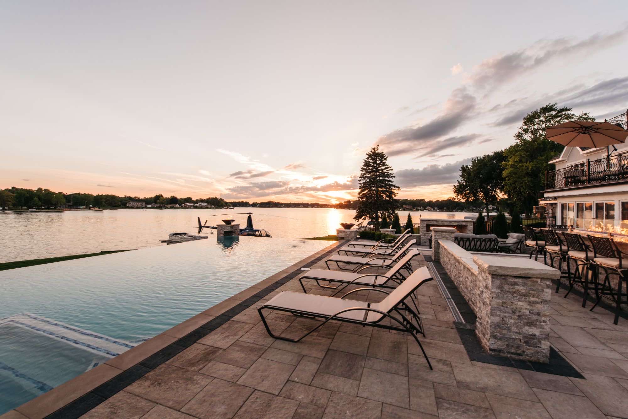 The homeowners were looking for infinity edge pool builders in Waterford, Michigan and the team was set on the task. They requested a pool and spa design that would provide them with their own private resort. The top priorities for this outdoor living space was the the custom gunite pool and spa, seating areas for relaxing, and a backyard paver helipad! We also designed a large fire table for cozy dining, a sunken fireplace area with adequate seating, and an open pool area that uses the dramatic slope of the yard to its advantage. The pool deck and patio were designed with Oaks pavers in style Rialto. Fire bowls and natural cascades were installed for sensory elements, and paver steps using High Format Dimensional Steps allow you to access all ends of this backyard living space. Your infinity edge pool awaits, CALL US now!