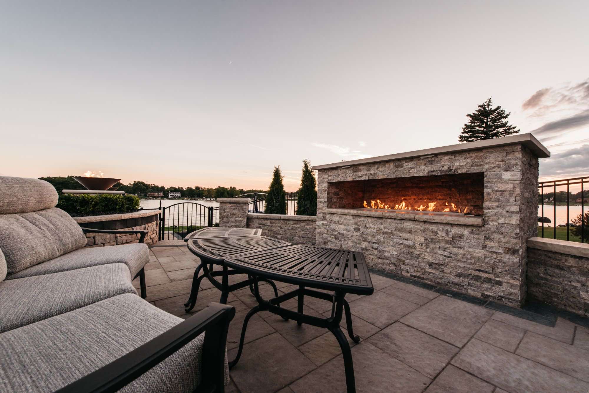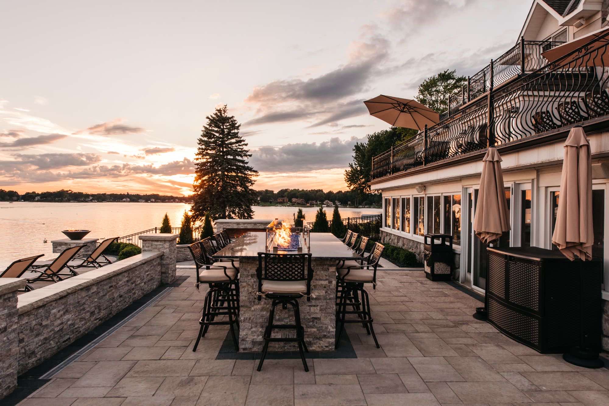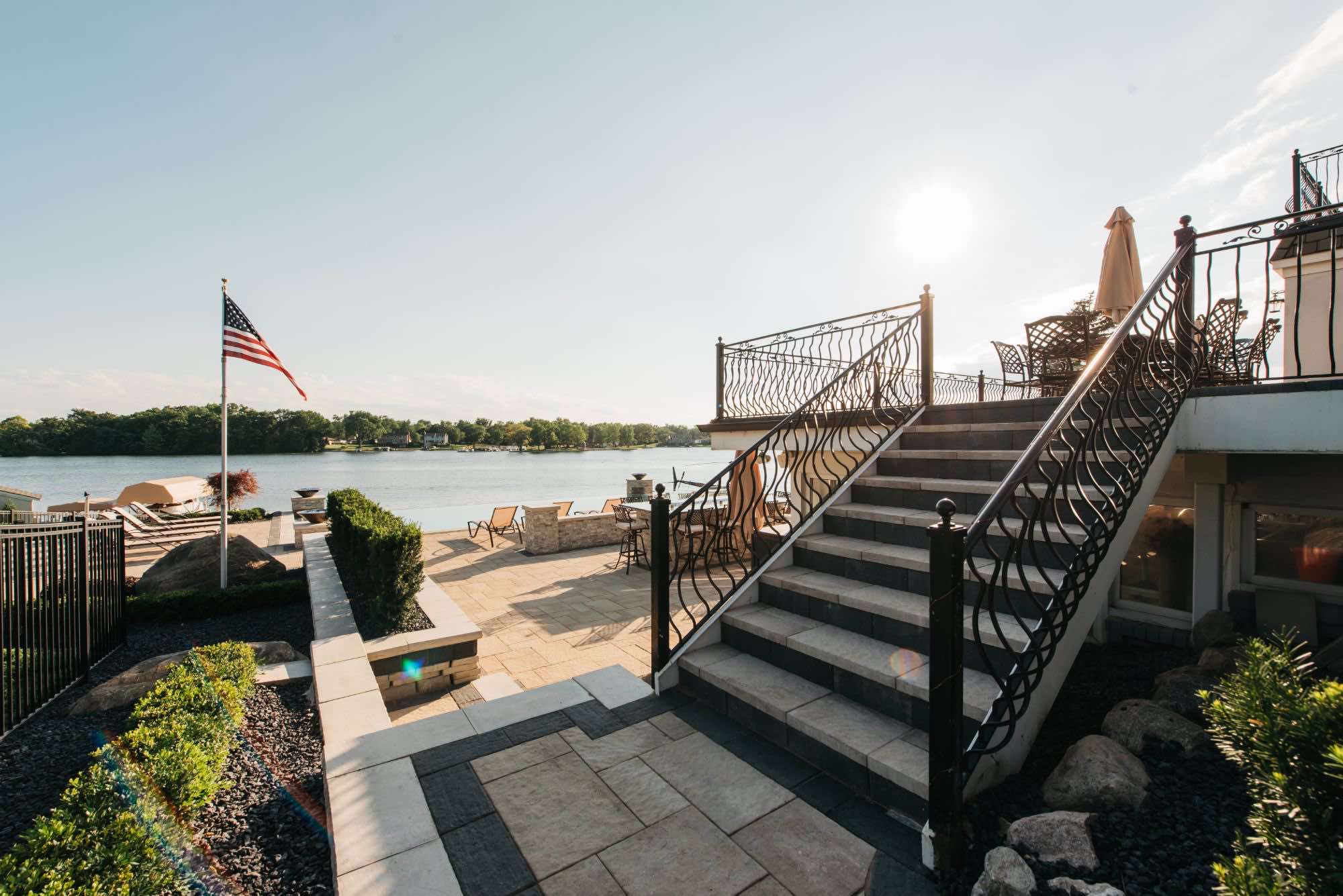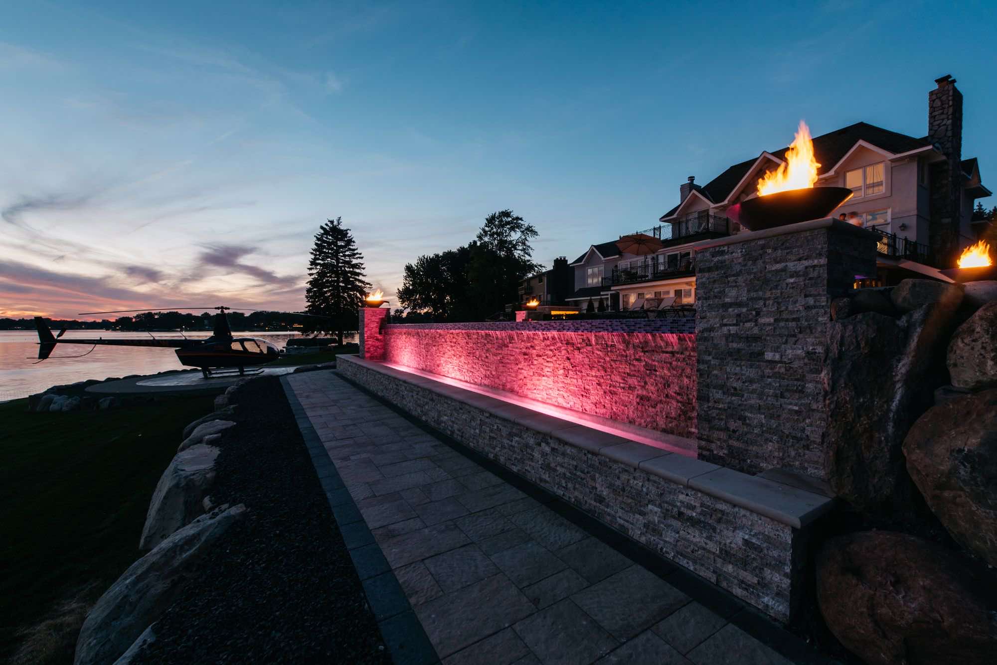 The homeowners were looking for infinity edge pool builders in Waterford, Michigan and the team was set on the task. They requested a pool and spa design that would provide them with their own private resort. The top priorities for this outdoor living space was the the custom gunite pool and spa, seating areas for relaxing, and a backyard paver helipad! We also designed a large fire table for cozy dining, a sunken fireplace area with adequate seating, and an open pool area that uses the dramatic slope of the yard to its advantage. The pool deck and patio were designed with Oaks pavers in style Rialto. Fire bowls and natural cascades were installed for sensory elements, and paver steps using High Format Dimensional Steps allow you to access all ends of this backyard living space. Your infinity edge pool awaits, CALL US now!