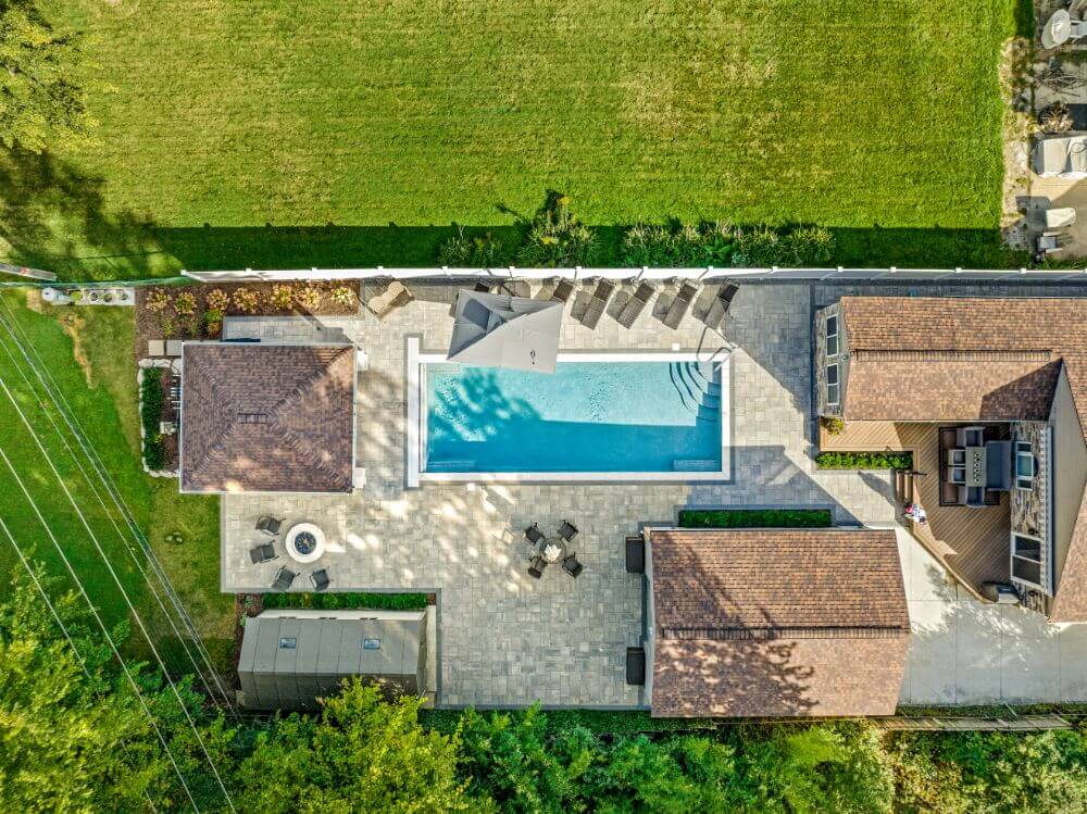 This luxurious retreat features a poolside cabana & gunite pool in Royal Oak, Michigan. Our team crafted a stunning backyard living space featuring a full length gunite pool with auto pool cover, a custom built trex deck to reach the lower paver patio, and a cabana for days of relaxing and dining beside the pool. The cabana is finished with cedar wood, and was built to include a bathhouse. A custom natural fire pit nearby allows for comfortable fireside lounging after a long day. The patio design was built with Unilock pavers Beacon Hill Smooth in Fossil and Unilock Holland Premier in Charcoal covering the pool deck, backyard patio, and walkways. With the right amount of privacy and poolside living, this patio will accommodate your backyard space. REACH OUT for your poolside cabana and gunite pool project!