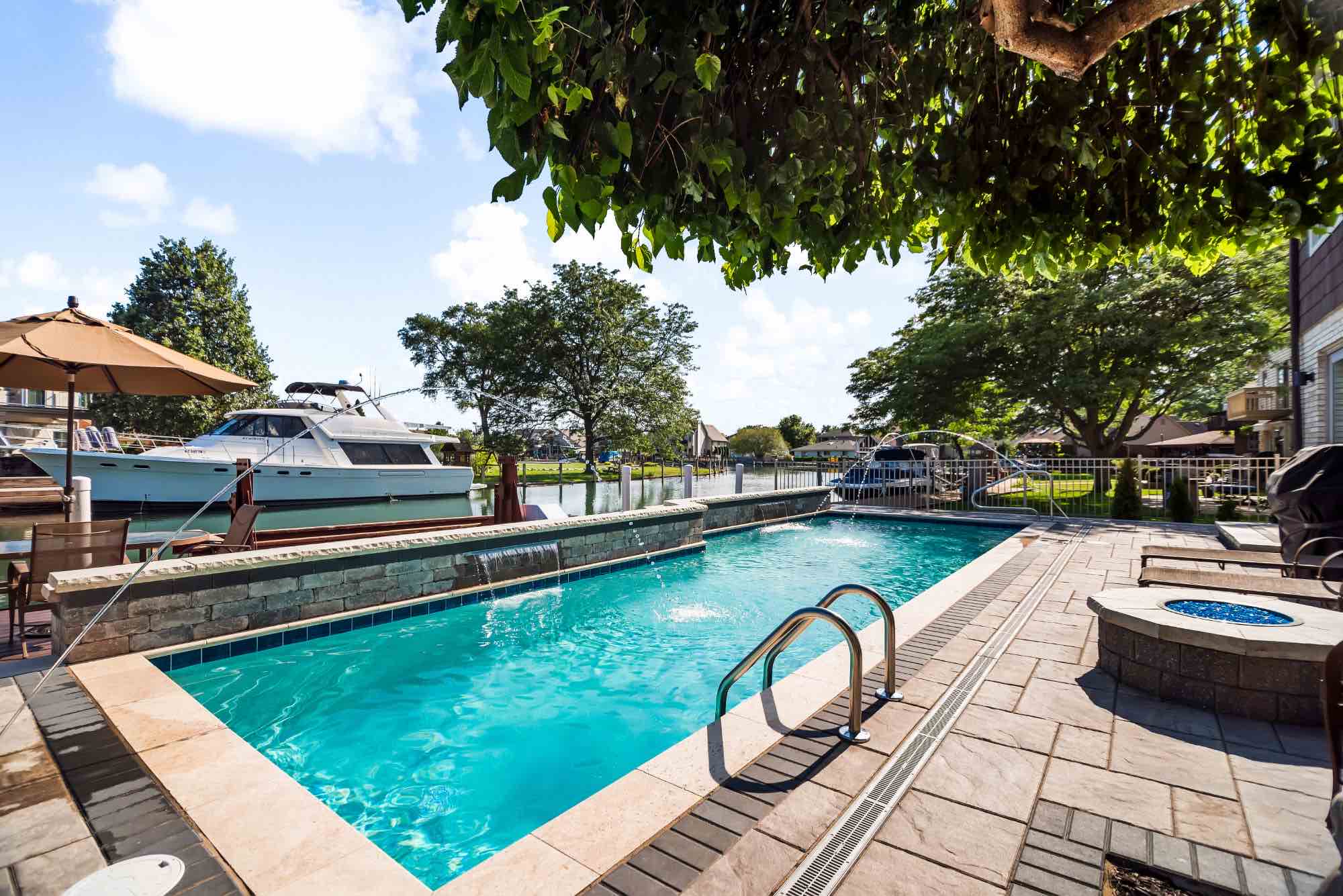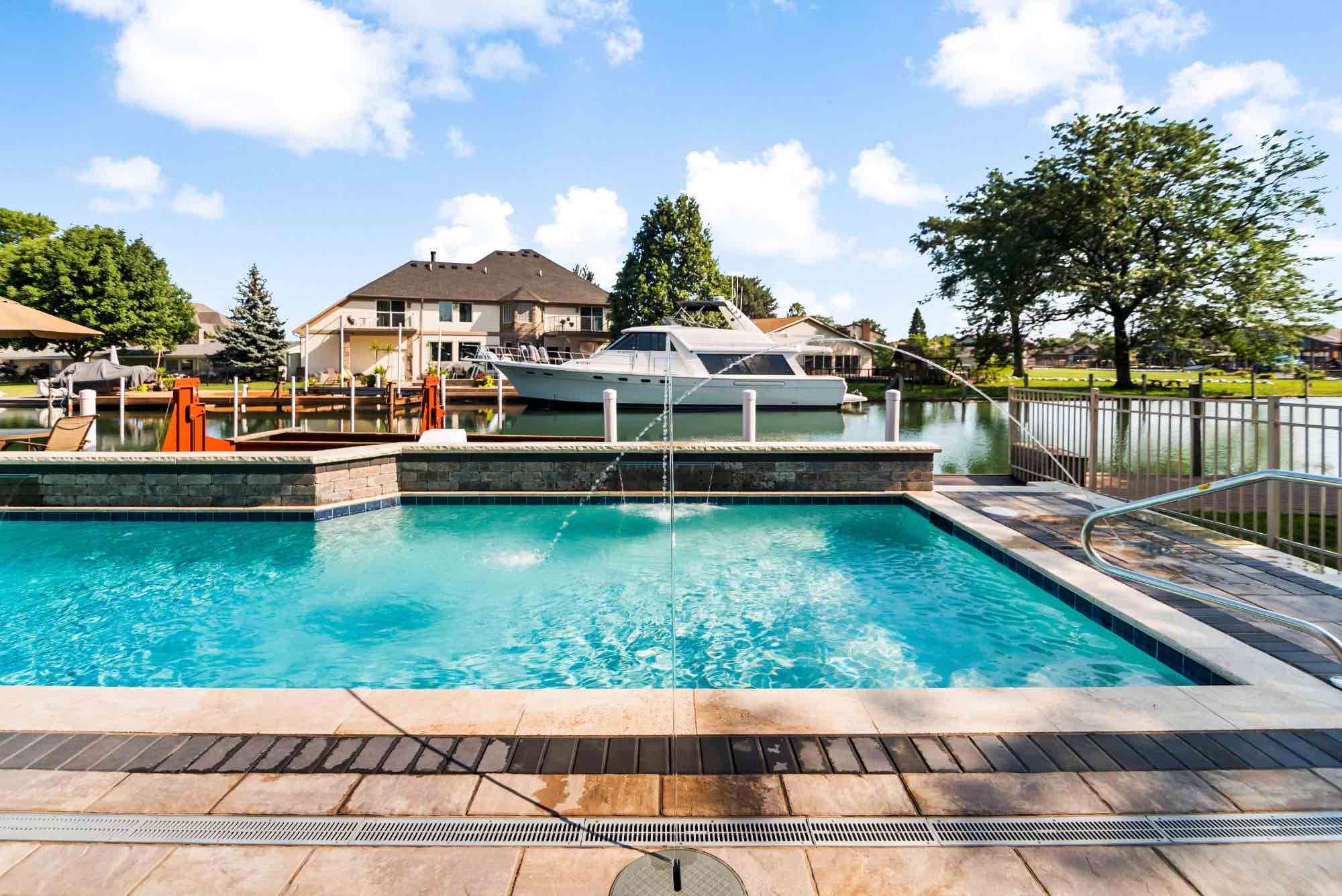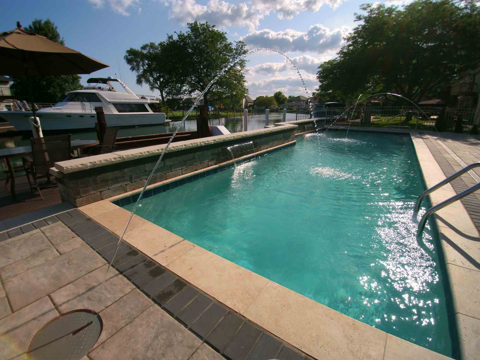 Searching for luxury gunite pool builders in Harrison Twp, MI? Our award-winning team is able to transform any outdoor living space no matter the size and space, and this pool project is proof. The idea was to design a luxury gunite swimming pool that features playful deck jet fountains and cascading water features. The cascading fountain or sheet fountain shown was built using Unilock Pavers in Brussels Dimensional System, also adding a beautiful seat wall and ledge to rest alongside the water. We also designed and installed a brick paver pool deck using Unilock Beacon Hill Flagstone pavers, and a custom built boardwalk was installed to unify the Clinton River canal and the homeowners backyard pool. We can create your dream gunite pool, perfect for every yachtsman, just REACH OUT today!