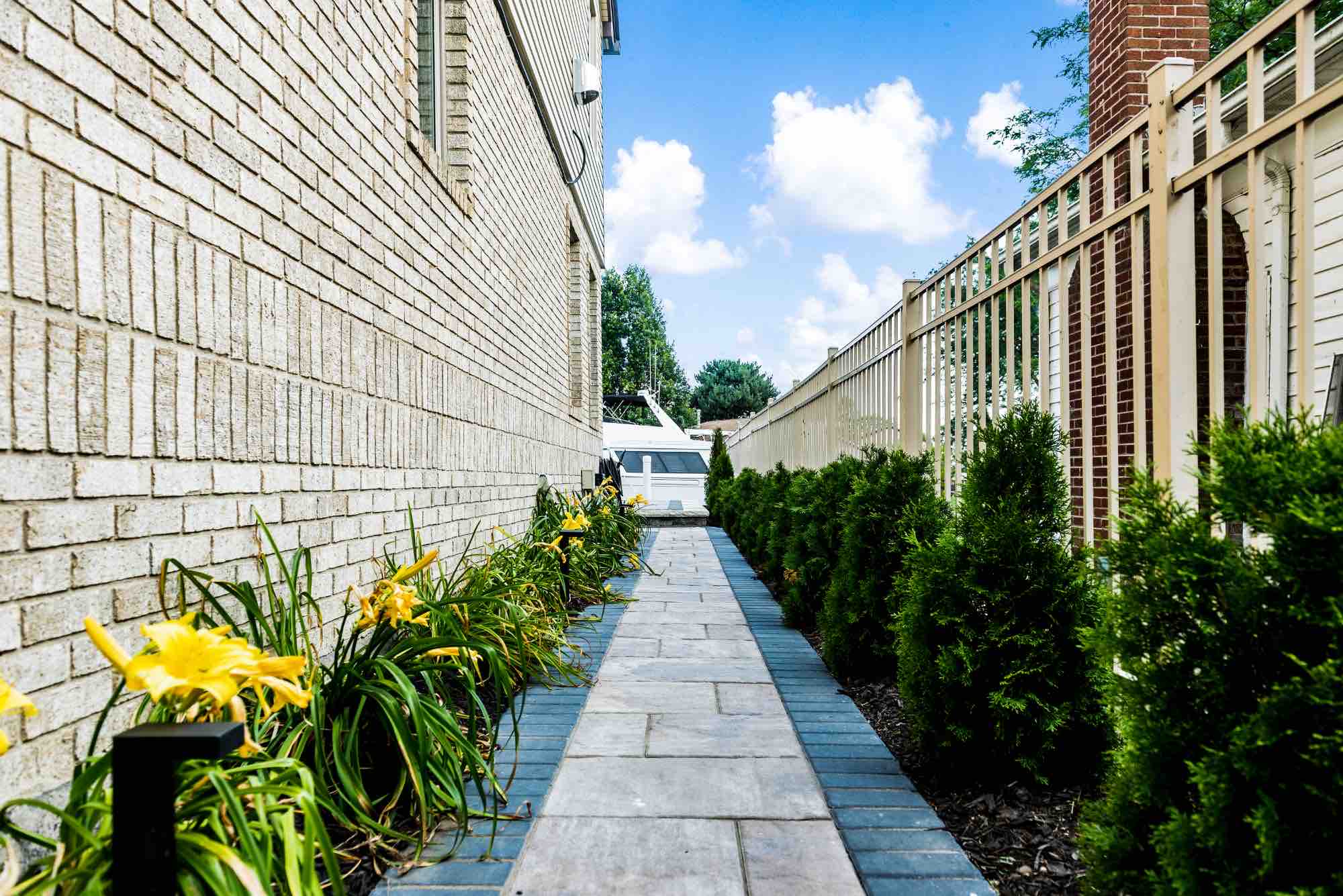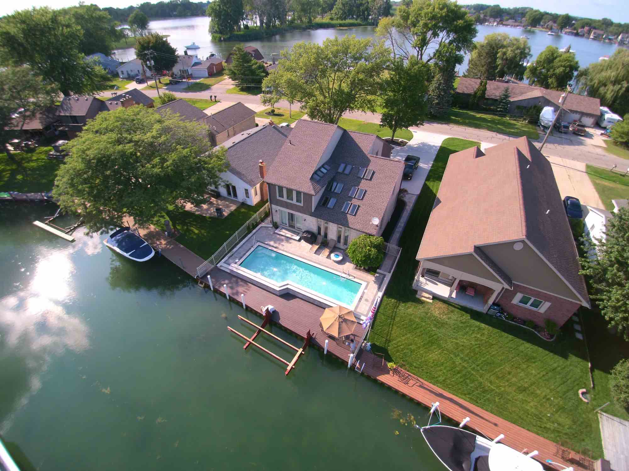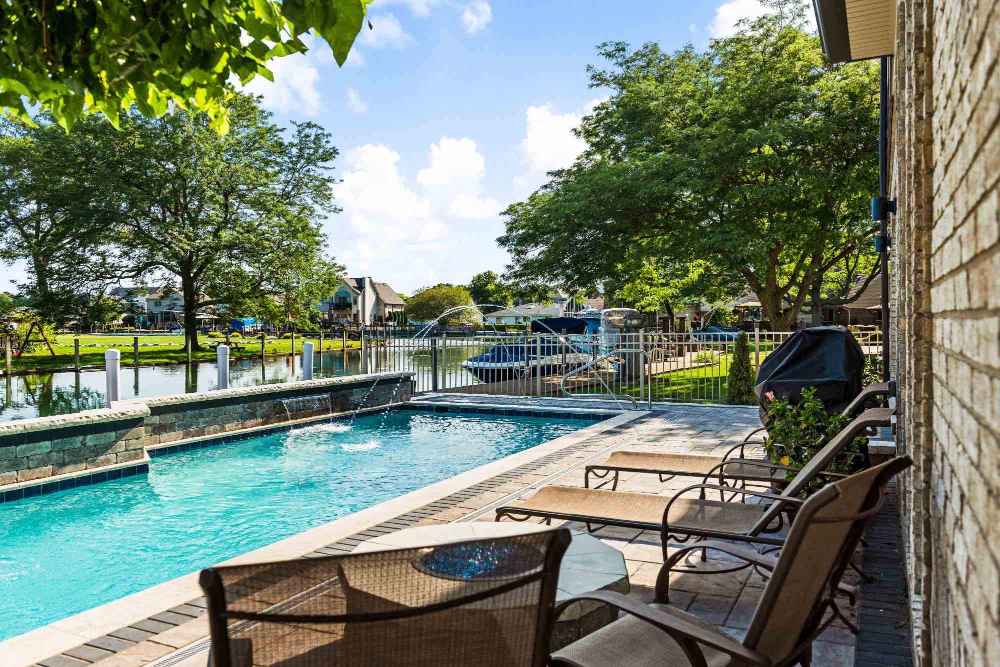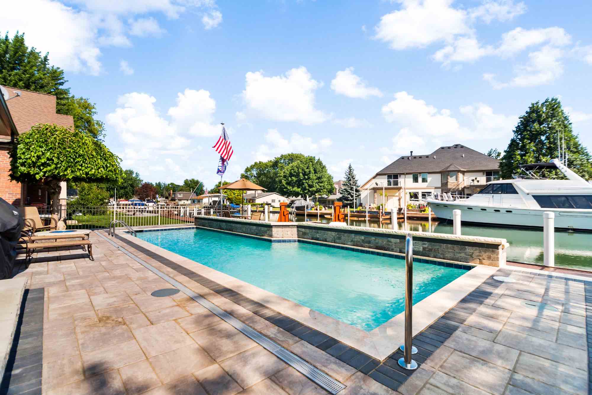 Searching for luxury gunite pool builders in Harrison Twp, MI? Our award-winning team is able to transform any outdoor living space no matter the size and space, and this pool project is proof. The idea was to design a luxury gunite swimming pool that features playful deck jet fountains and cascading water features. The cascading fountain or sheet fountain shown was built using Unilock Pavers in Brussels Dimensional System, also adding a beautiful seat wall and ledge to rest alongside the water. We also designed and installed a brick paver pool deck using Unilock Beacon Hill Flagstone pavers, and a custom built boardwalk was installed to unify the Clinton River canal and the homeowners backyard pool. We can create your dream gunite pool, perfect for every yachtsman, just REACH OUT today!