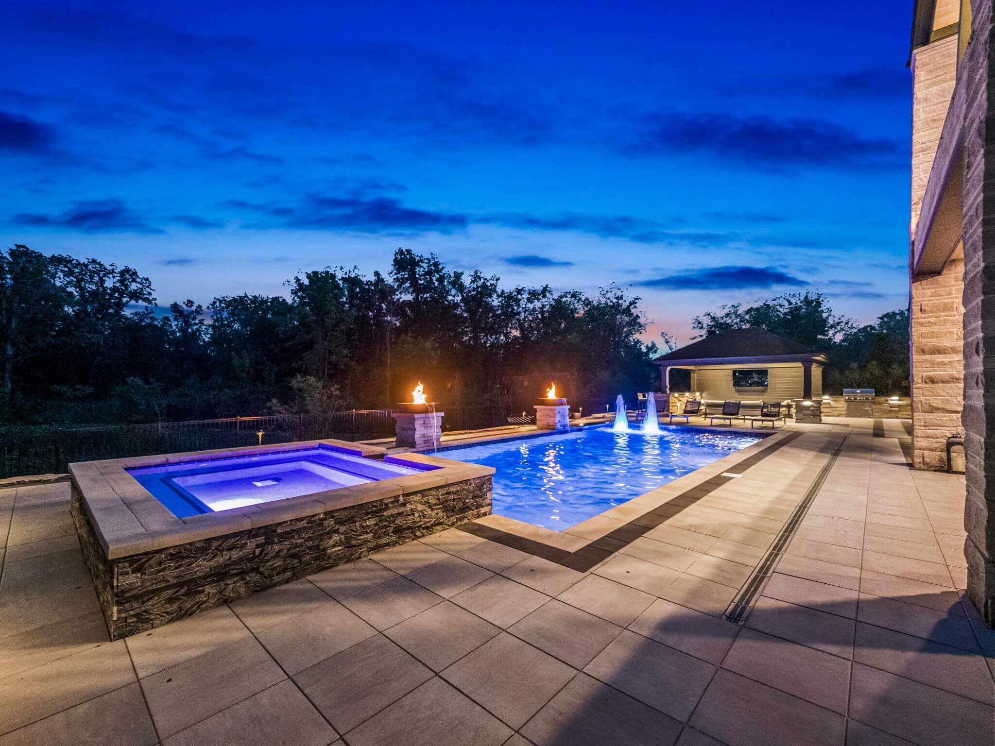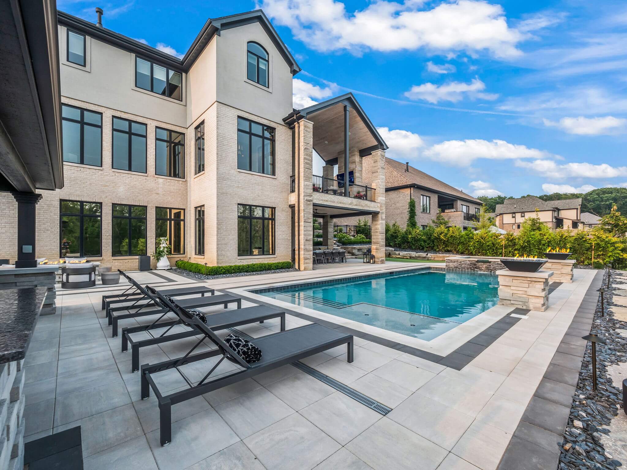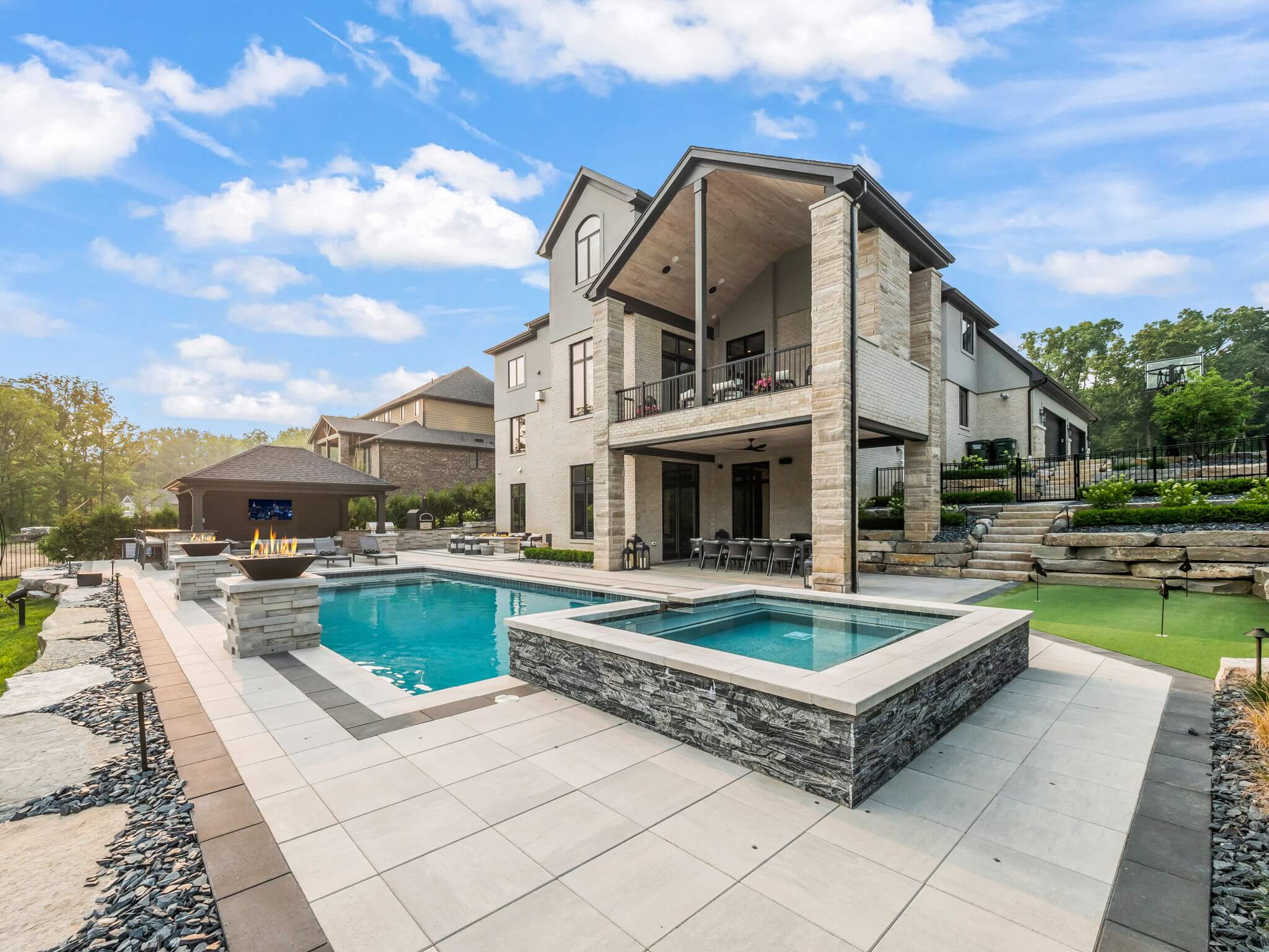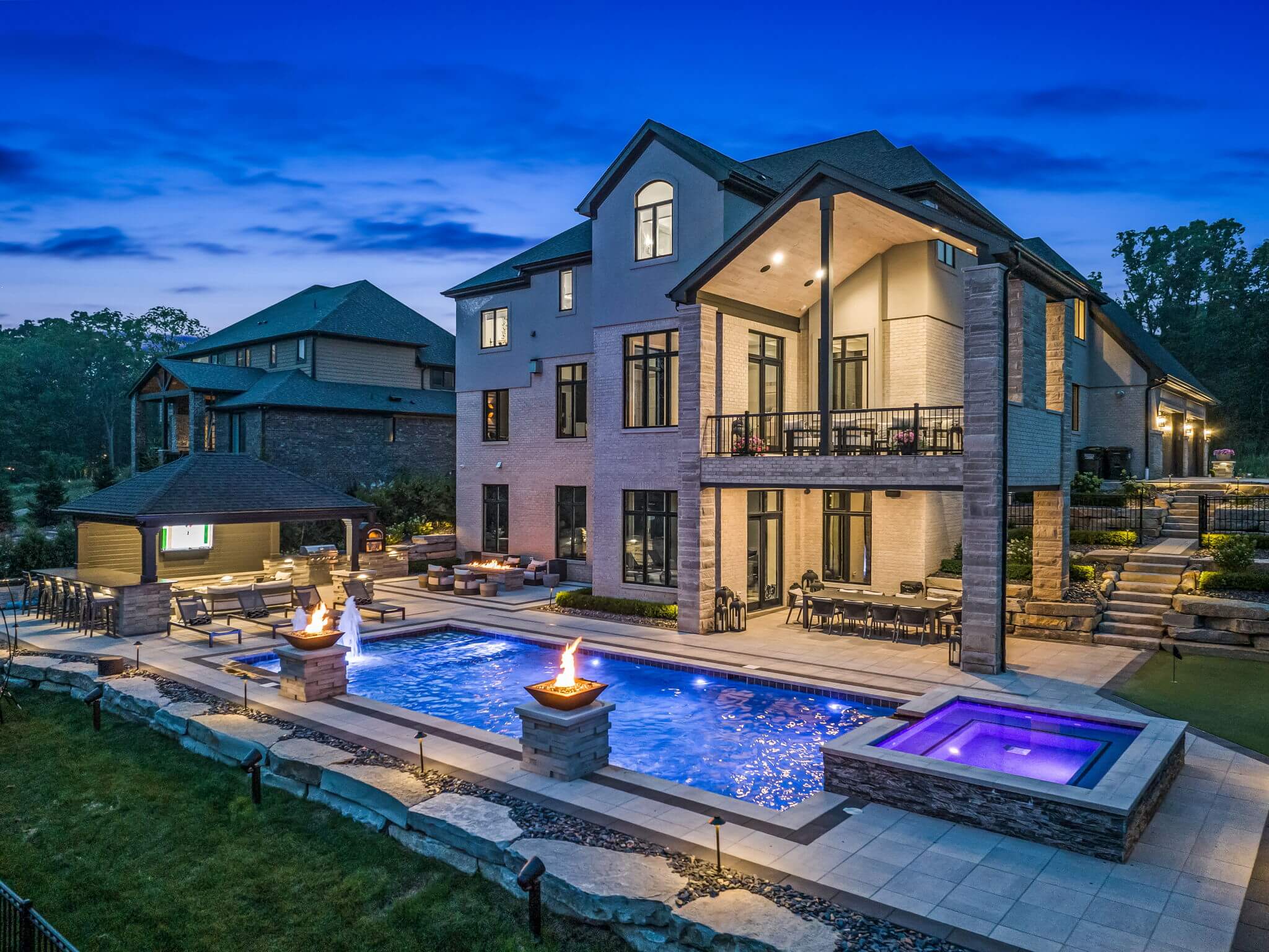 Currently looking for pool installers in Rochester Hills, MI? This exquisite home features a custom inground gunite pool with spillover spa, elegant fire bowls, and a custom cedar gazebo. The gazebo area features a built-in bar, and outdoor grilling area with a pizza oven, making entertaining easy. An artificial turf putting green invites leisurely play without the hassle of packing your gear. Days turn into evenings at this home, with a custom fire table that sets the mood for gatherings under the stars. Accent lighting and brick paving completes the design throughout the front and backyard. This is more than just a home—it's a sanctuary where every detail invites you to live luxuriously. There really is no place like home, when home is built like this. REACH OUT!
