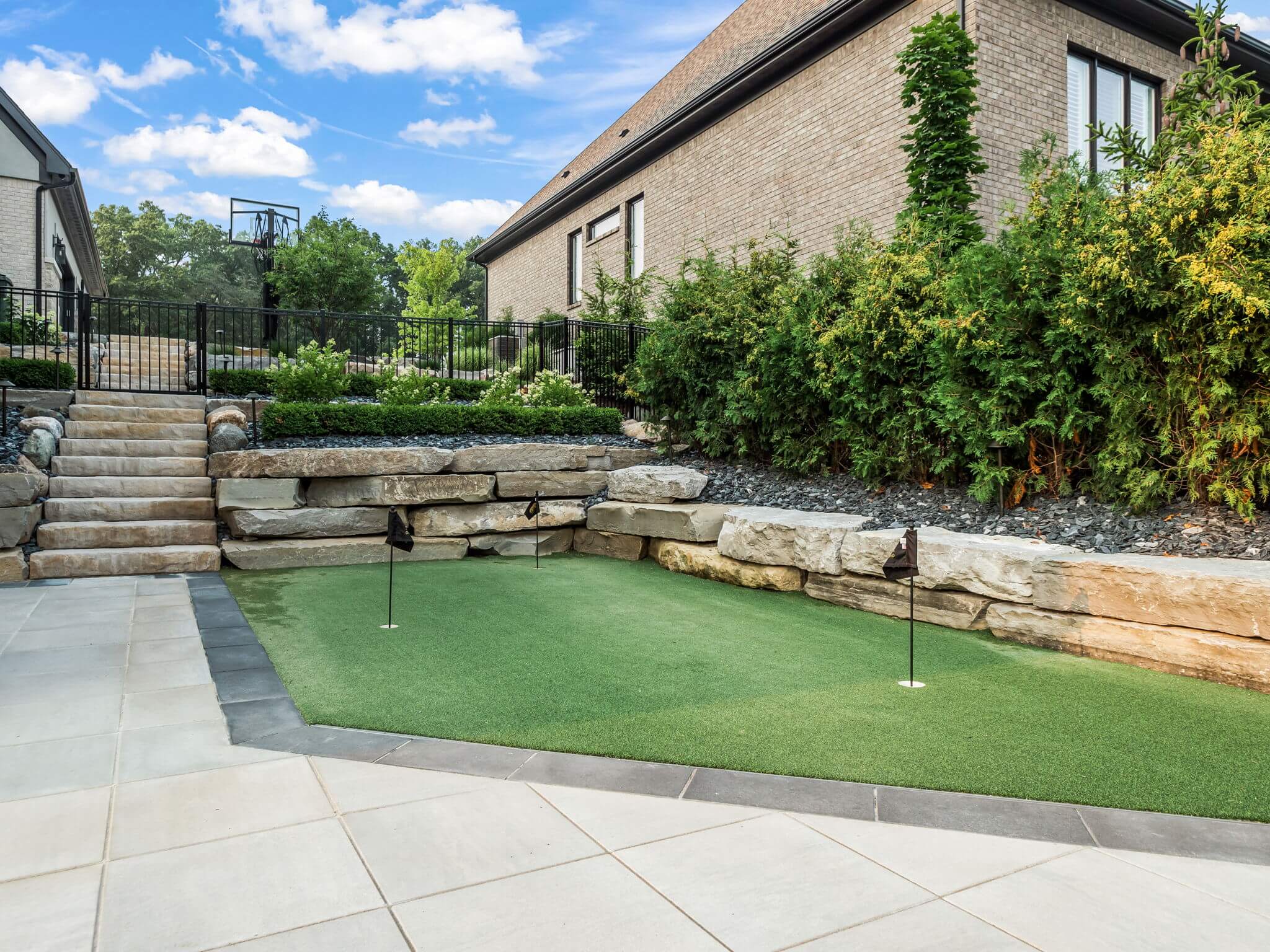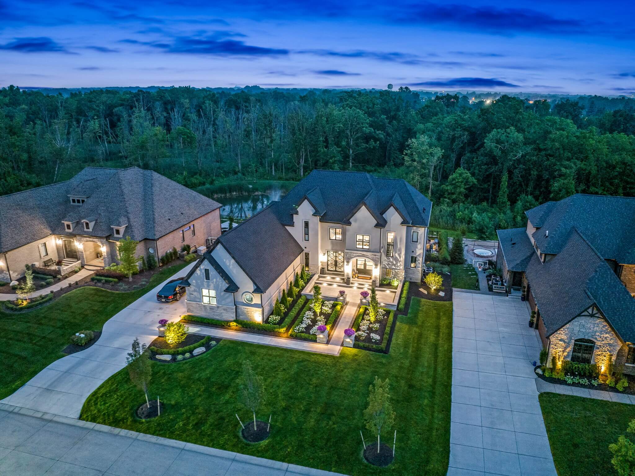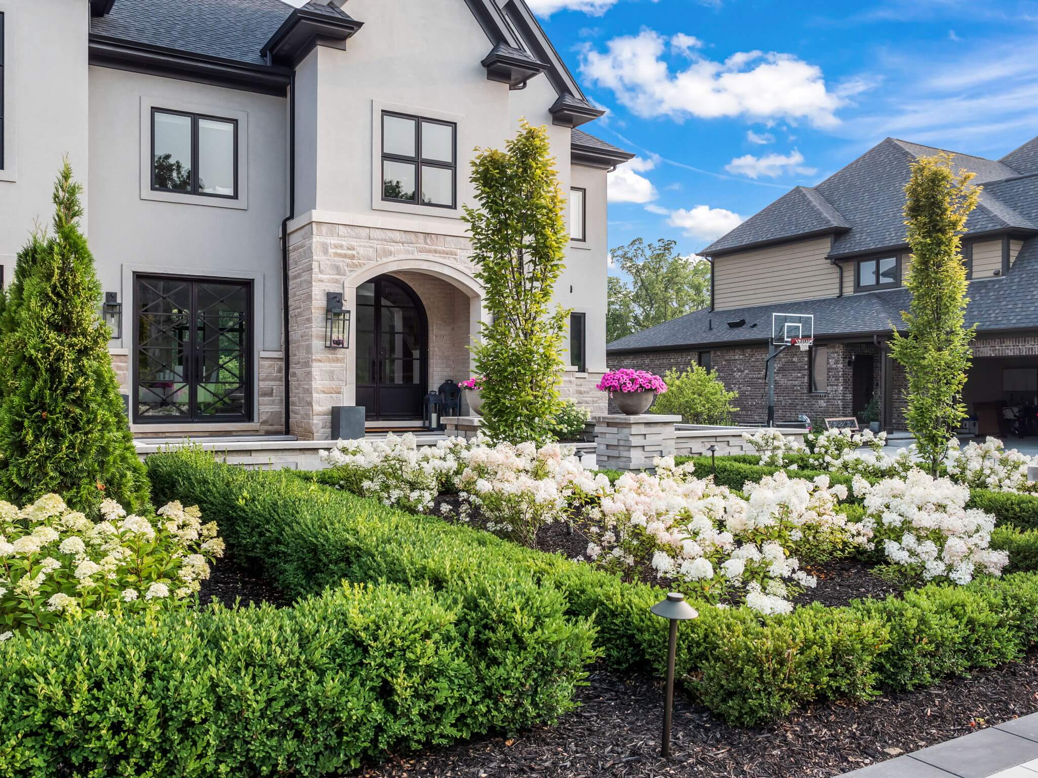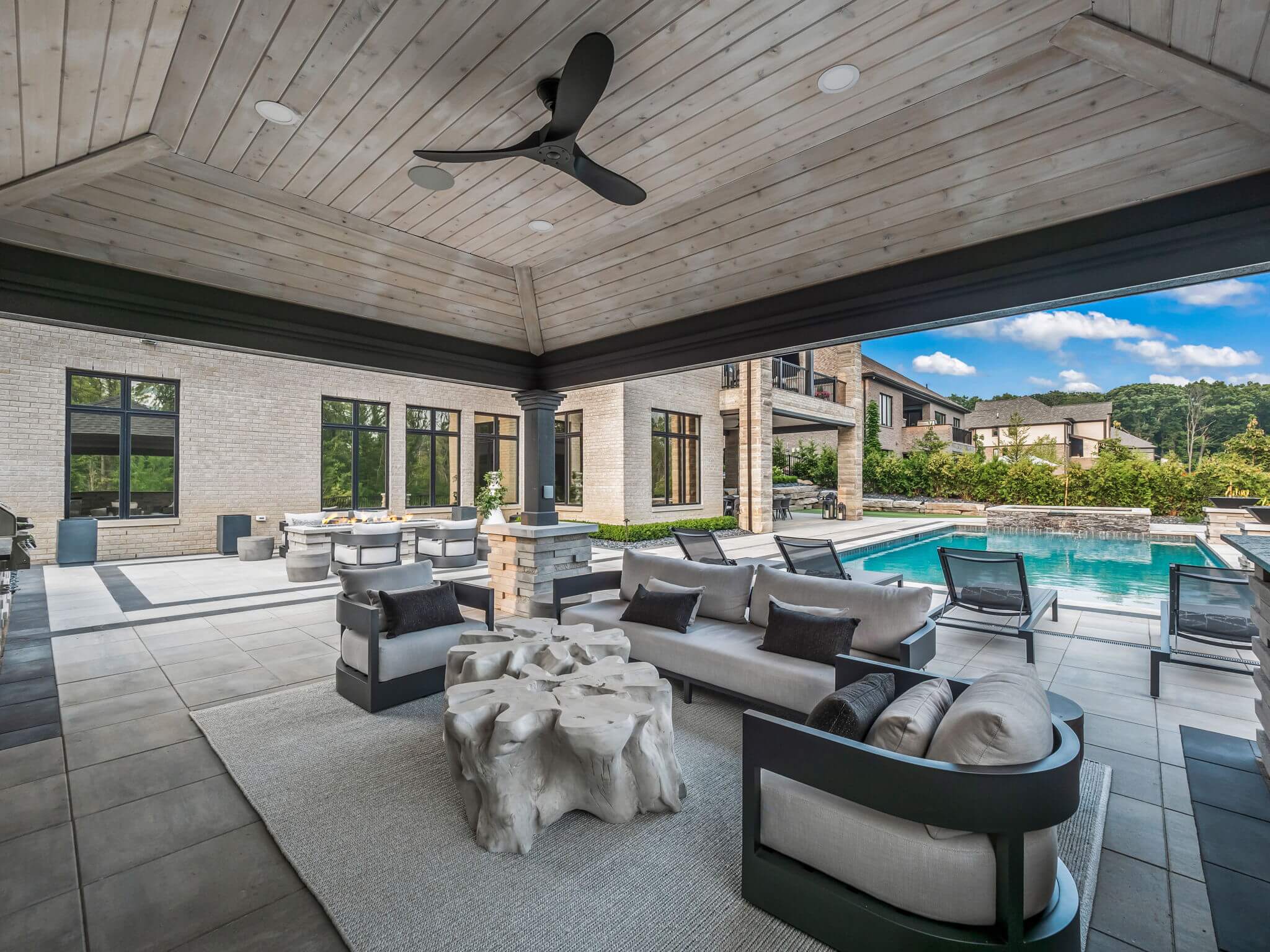 Currently looking for pool installers in Rochester Hills, MI? This exquisite home features a custom inground gunite pool with spillover spa, elegant fire bowls, and a custom cedar gazebo. The gazebo area features a built-in bar, and outdoor grilling area with a pizza oven, making entertaining easy. An artificial turf putting green invites leisurely play without the hassle of packing your gear. Days turn into evenings at this home, with a custom fire table that sets the mood for gatherings under the stars. Accent lighting and brick paving completes the design throughout the front and backyard. This is more than just a home—it's a sanctuary where every detail invites you to live luxuriously. There really is no place like home, when home is built like this. REACH OUT!