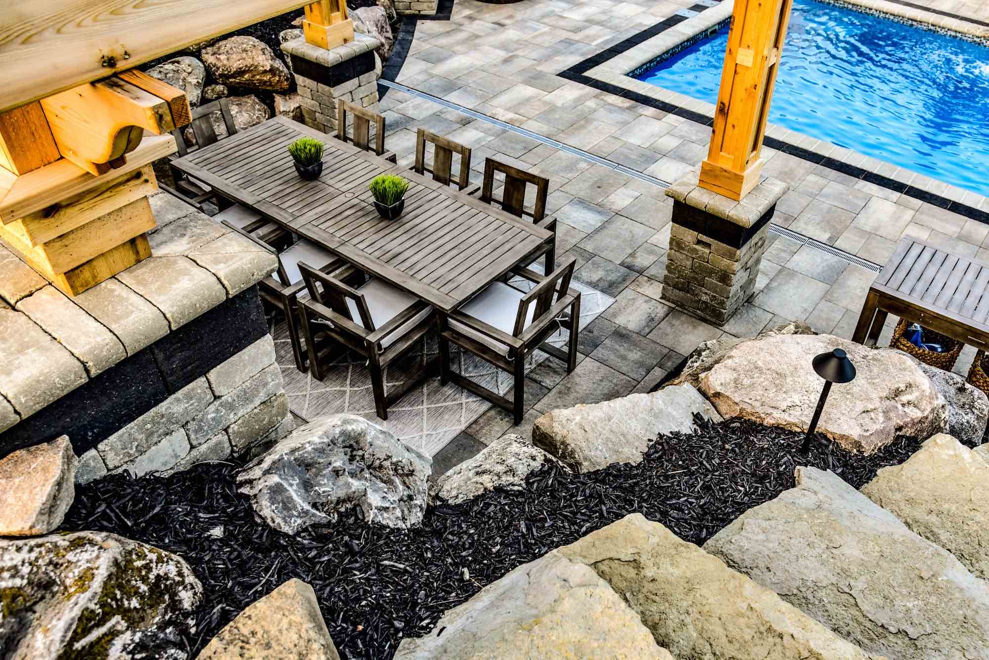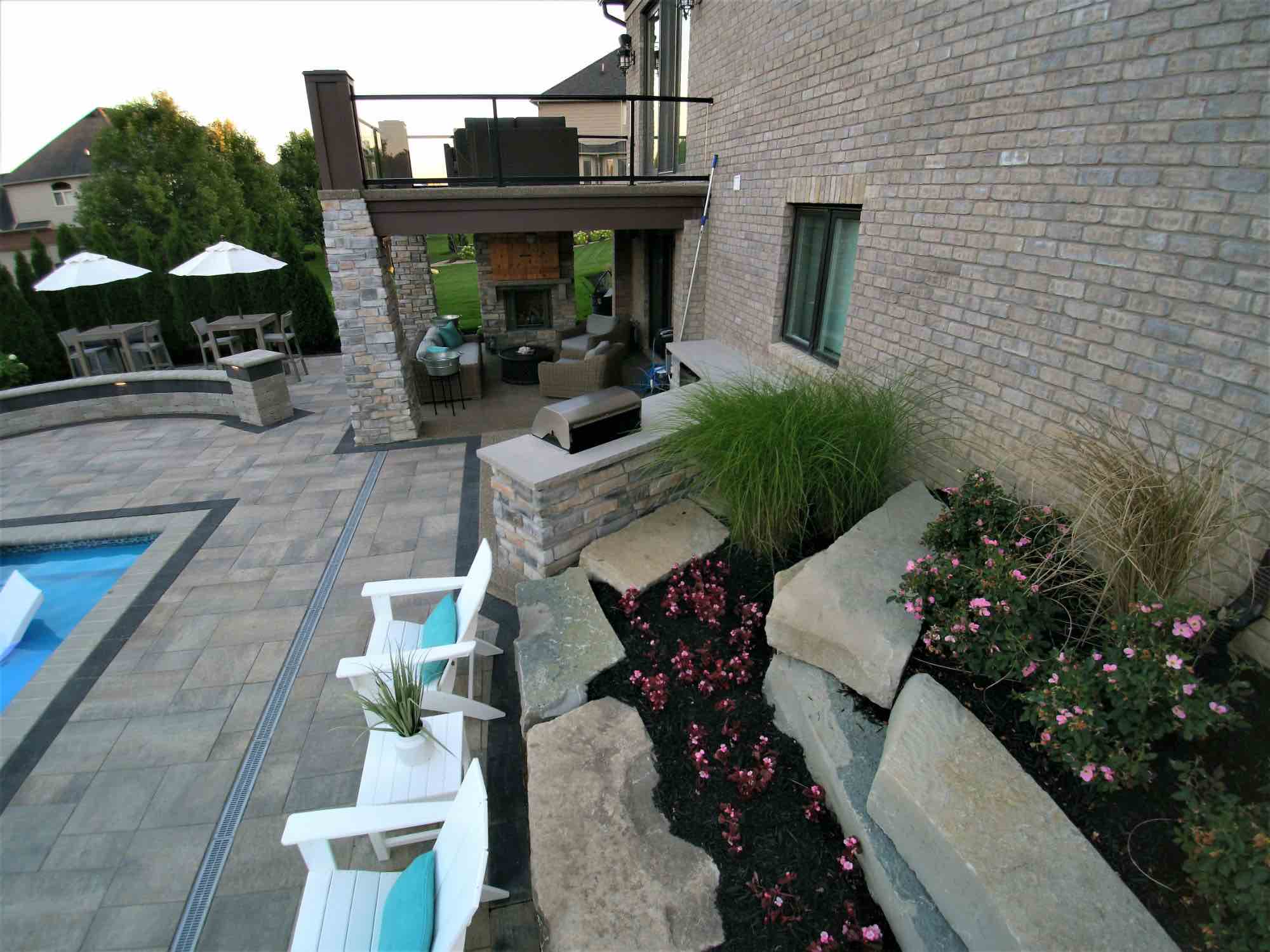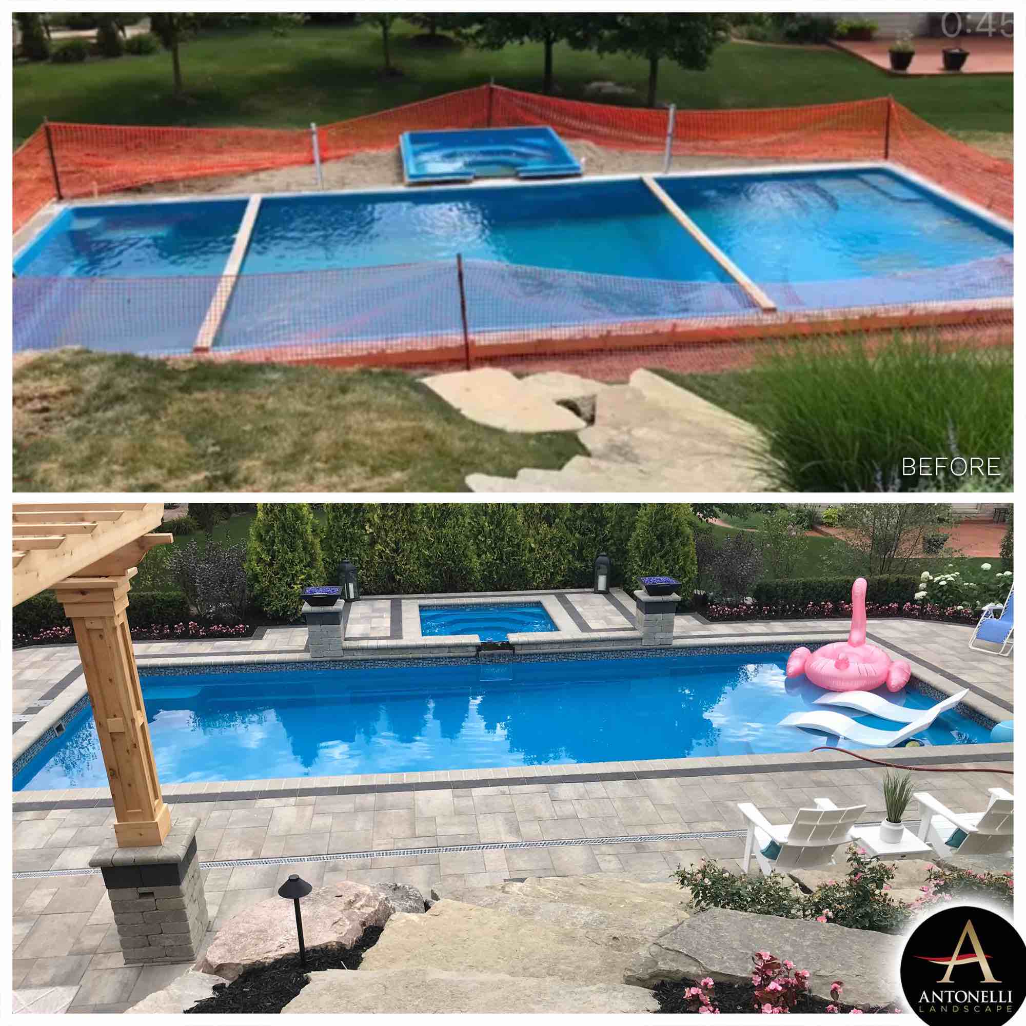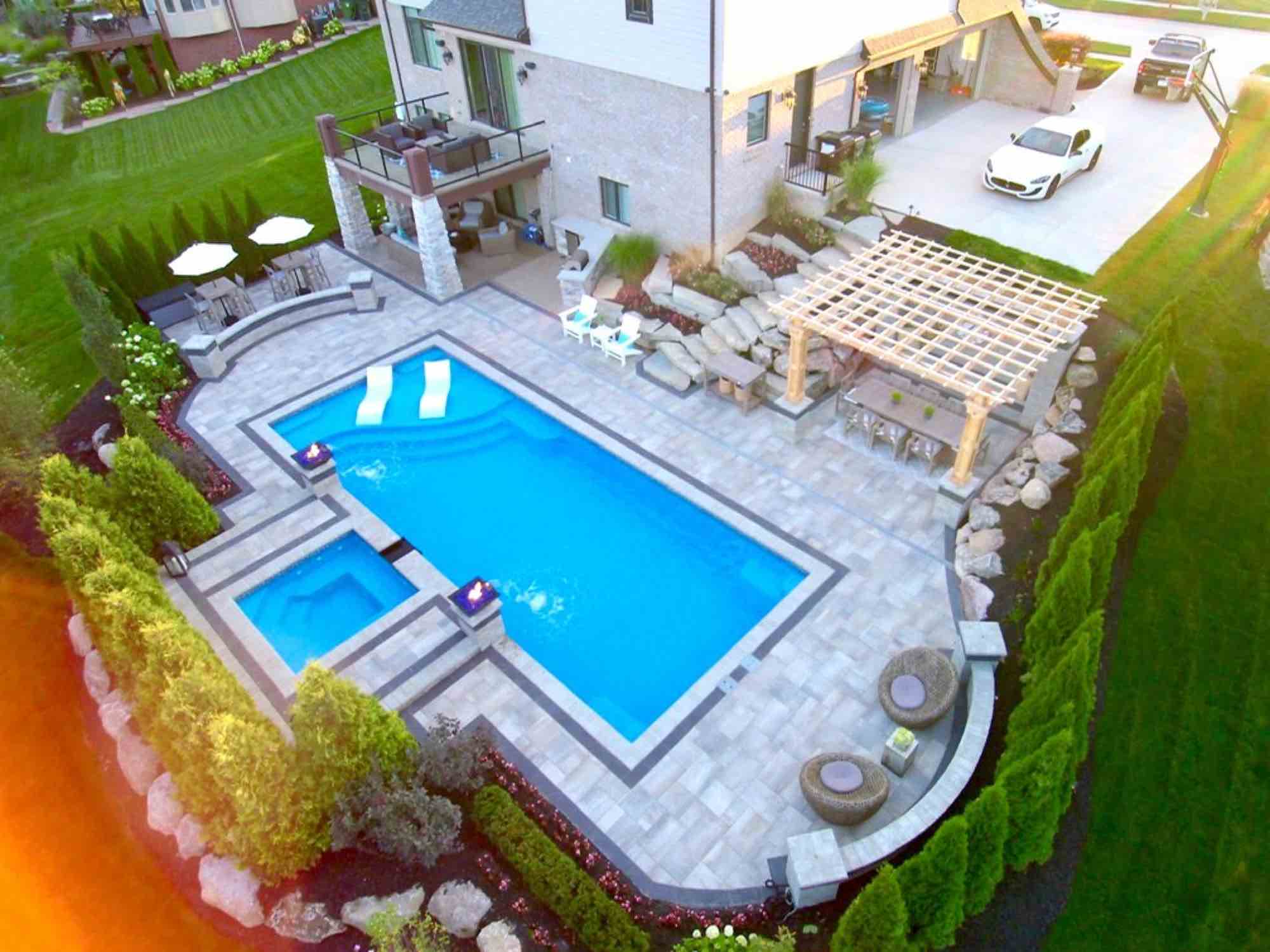 Looking for fiberglass pool designers in Shelby Twp, MI? If so, you found the right team! This landscape design project is set in the Creekside Village subdivision in Shelby Township, and features a cascade fiberglass swimming pool design, with a raised spillover spa. A raised walk-out patio surrounds the paver pool deck that features Oaks Pavers in Rialto, and a custom cedar pergola provides the perfect shade structure for outdoor living. The pool design also includes a stacked Michigan boulder retaining wall with seating area, providing privacy and seating. Custom additions to this pool and spa design include the fire bowls with water cascades that add sensory elements, and the Arborvitae privacy trees that allow for natural privacy. CONTACT US to get your fiberglass pool and spa design started.